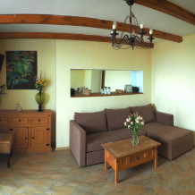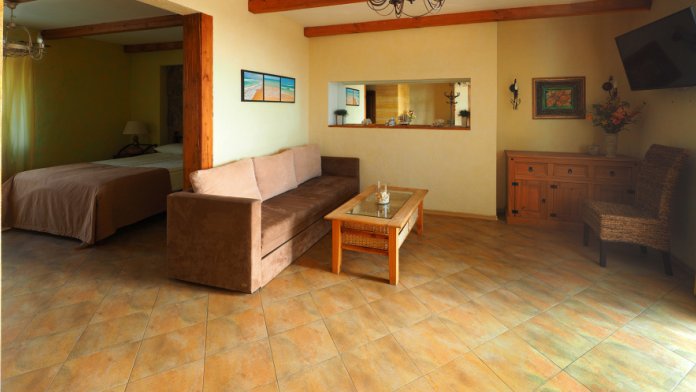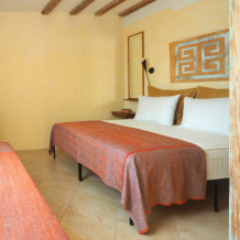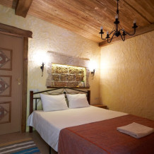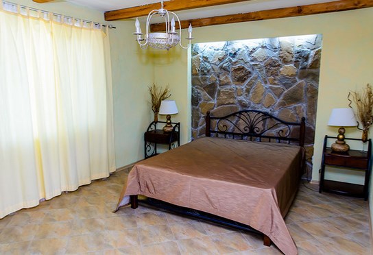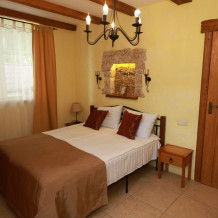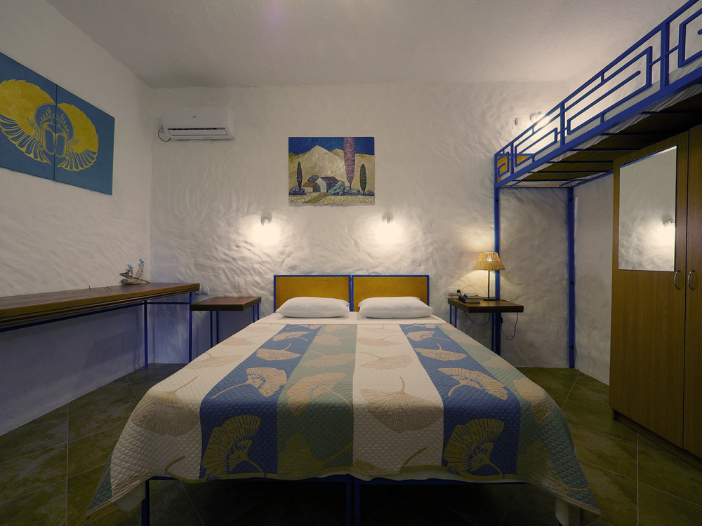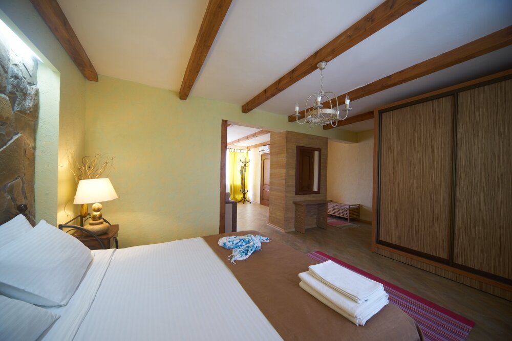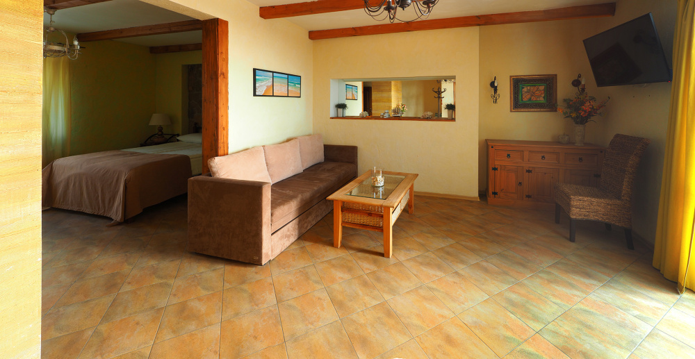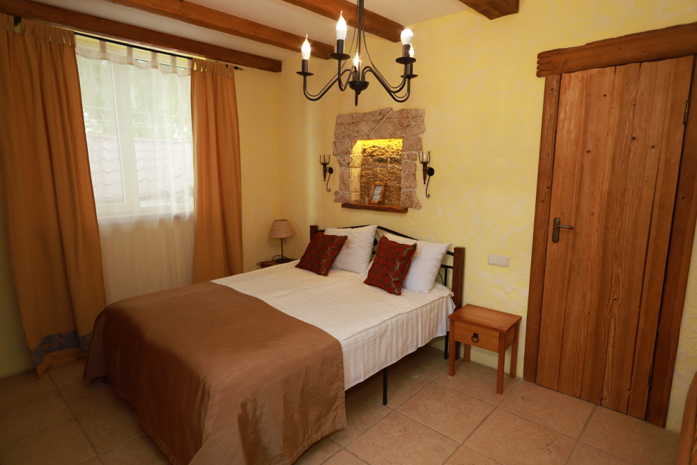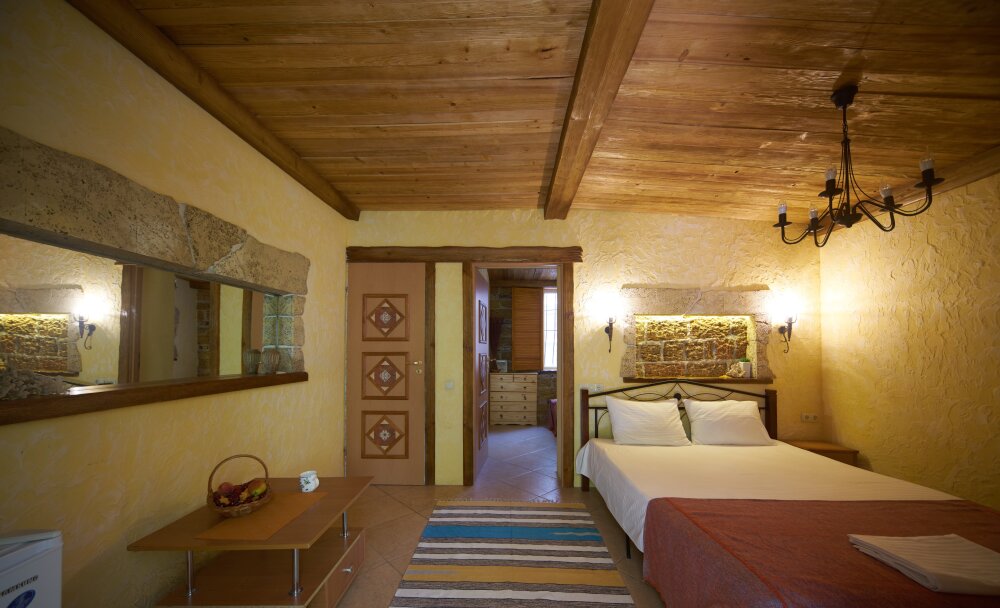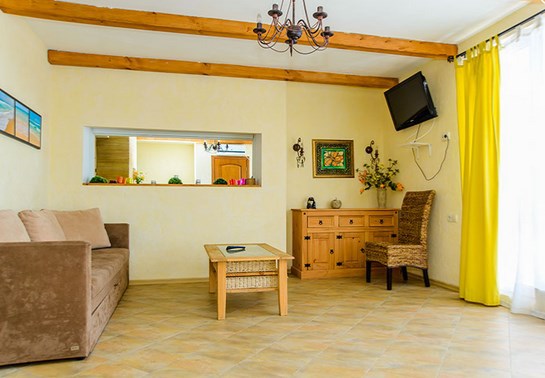 Двухкомнатный номер категории Люкс № 4 (площадь 26 м², одна комната проходная, в средиземноморском стиле с собственной ванной комнатой, на втором этаже, с лоджией, видом на внутренний дворик, четырёхместное размещение, на выбор две двухспальных кровати или одна двухспальная кровать и две раздельные кровати с ортопедическими матрасами и подушками).