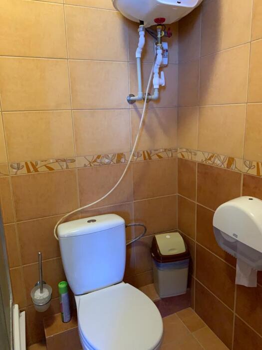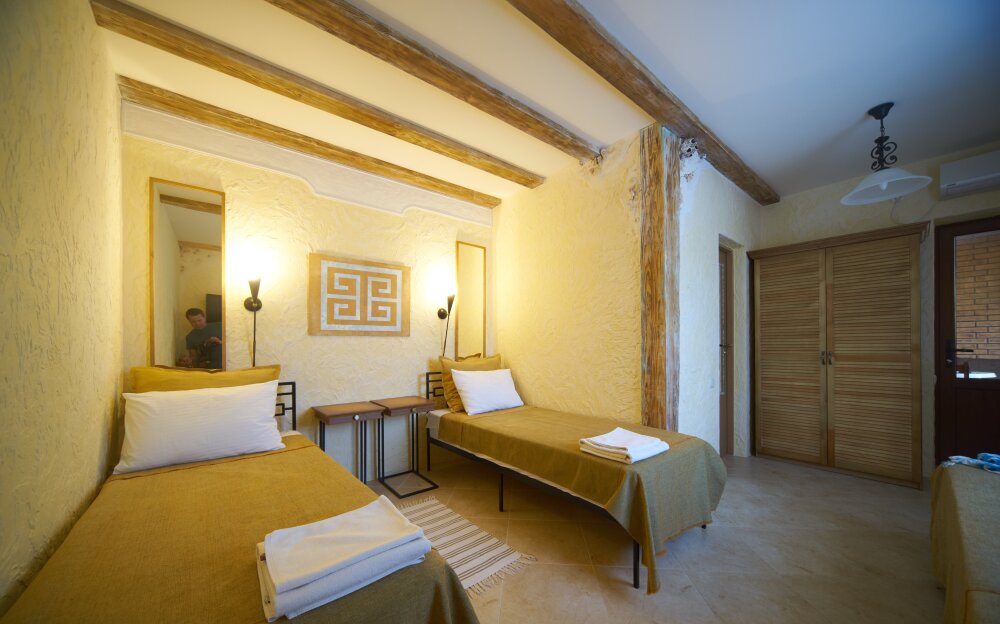 Однокомнатный трёхместный номер категории Эконом № 7 (площадь 17 м², в средиземноморском стиле с собственной ванной комнатой, на первом этаже, без балкона и видом на соседский дворик, трёхместное размещение, на выбор:одна двухспальная кровать и одна раздельная кровать или три раздельные кровати с ортопедическими матрасами и подушками).
