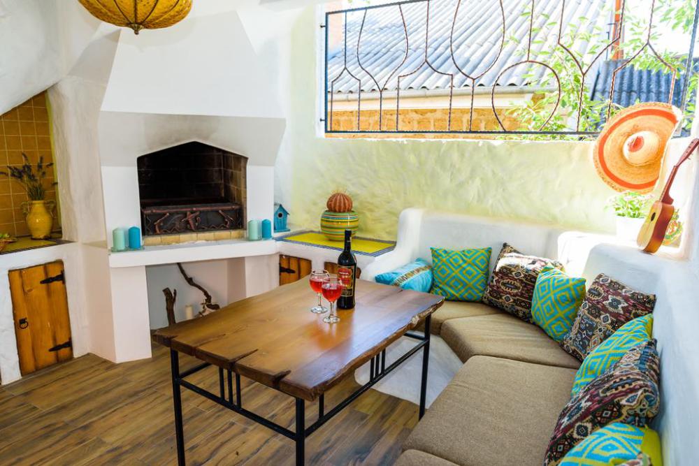 Зоны отдыха разделены небольшими лесенками на уютные отдельные беседки в этно стилях Средиземноморья, Азии, Африки, Латинской Америки, Индии, Ближнего Востока,. На первом этаже беседки оборудованы каминами, мангалами, печью для казана. В каждой беседке комфортные диваны с разноцветными мягкими подушками.