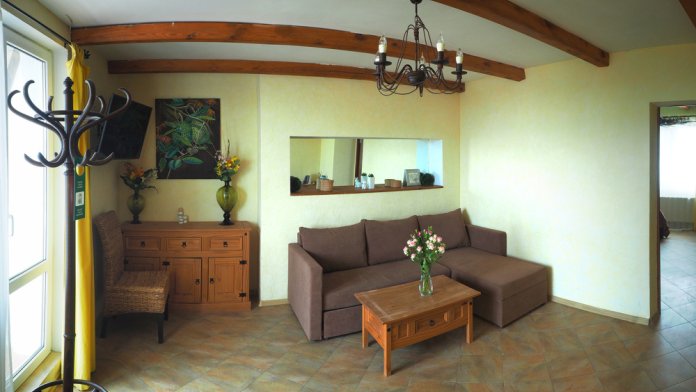 Двухкомнатный номер категории Люкс № 2 (площадь 26 м², одна комната проходная, в средиземноморском стиле с собственной ванной комнатой, на первом этаже, с лоджией, видом на внутренний дворик, четырёхместное размещение, на выбор две двухспальных кровати или одна двухспальная кровать и две раздельные кровати с ортопедическими матрасами и подушками).