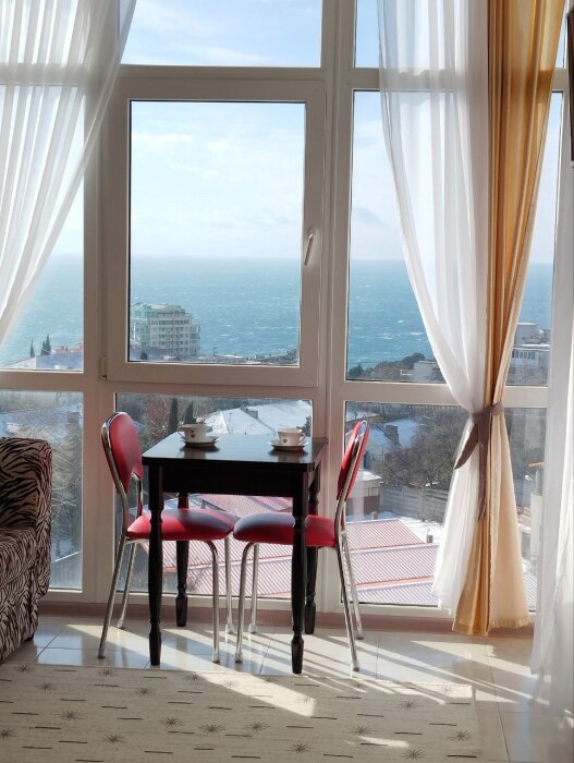 Квартира с панорамными, видовыми окнами на море и балконом, на котором утром приятно выпить кофе, а вечером бокал вина, любуясь прекрасными пейзажами.