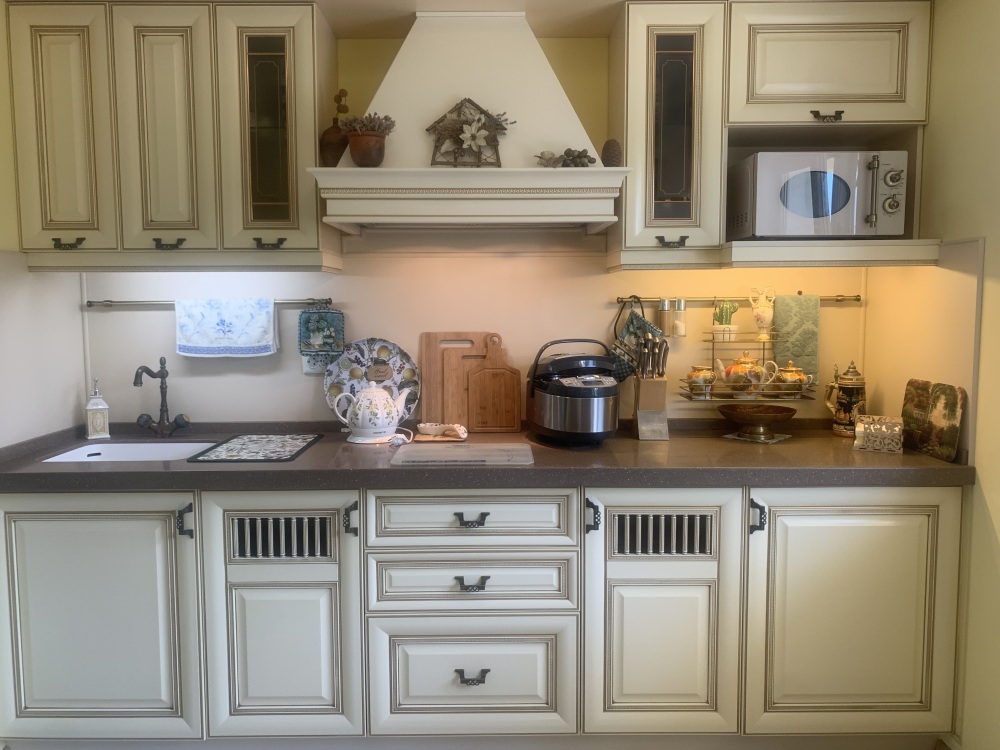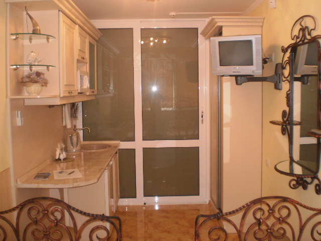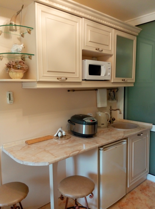 В номере кондиционер,беспроводной WI-FI интернет,плазменный телевизор,двуспальная кровать,шкаф,индивидуальный сейф,прикроватные тумбочки,два кресла+кофейный столик,сушка для белья,также в номере кухонная зона-холодильник,мультиварка с керамической чашей на 5 литров,электро чайник,микроволновка,необходимая кухонная и столовая посуда,мойка с подачей холодной и горячей водой.