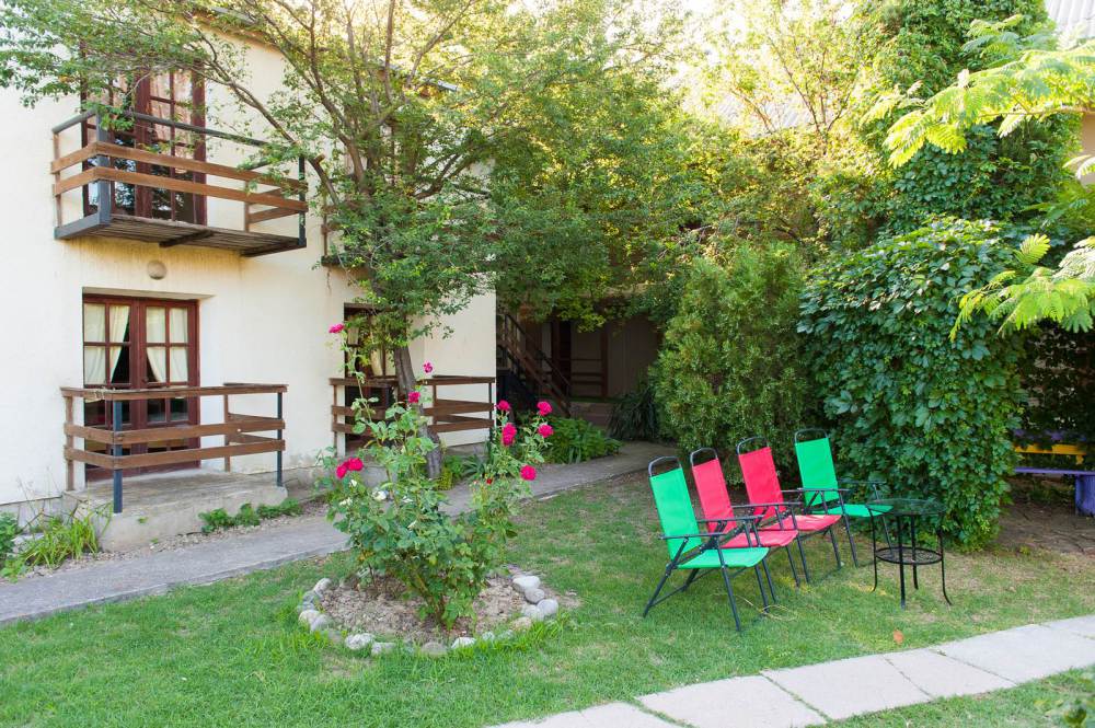 Отдых в гостевом доме в целом понравился. Местоположение неплохое. Если вы на машине, можно посетить разные пляжи. Недалеко от посёлка г. Судак, мыс. Меганом. До самого пляжа, который находится в посёлке около 1 км, можно добраться пешком.Из минусов далеко расположены магазины и аптека.Ближайщие в Солнечной долине и на пляже. Свинину для шашлыка в посёлке не продают, только курица и баранина. За мясом ездили в Судак. Сигареты на пляже тоже не продаются. Зато с алкоголем нет проблем, рядом фирменный винный магазин. Ещё можно купить домашнее вино и свежий виноград рядом с озером. Вино 350 руб, крупный виноград около 180 руб. В номере все стандартно. Убирают и меняют постель раз в неделю.Из минусов туалет и ванна общие, не удобно, но за такие деньги нормально. В туалетах все чистенько, убирают территорию отлично. Кухня тоже общая, кастрюльки, сковородки, посуда, чайник, микроволновка-все это хозяйка предоставляет.Посуда общая на всех.Есть мангал. Территория гостиницы просторная. Всё устроено со вкусом, есть лежаки, гамаки, столики с лавочками, детская песочница. Территория с зелёными деревьями и кустарники. Вечером можно посидеть отдохнуть в приятной компании на свежем воздухе. Комары правда злючие, но они везде на природе, от этого никуда не деться. Запаситесь фумигаторами и спреями.Рядом со столовой, место для приёма пищи.Много столиков со стульями, как в кафе.Там же большой телевизор и бильярдный стол. Ставлю за эти развлечения большой + отелю. Людей в отеле много, на кухне бывает тесно. За это ставлю -.Цена за номер не кусается, по сравнению с отелями, где все удобства в номере. Если вас не смущает общая кухня и санузел, отель Дионис вам подойдёт.