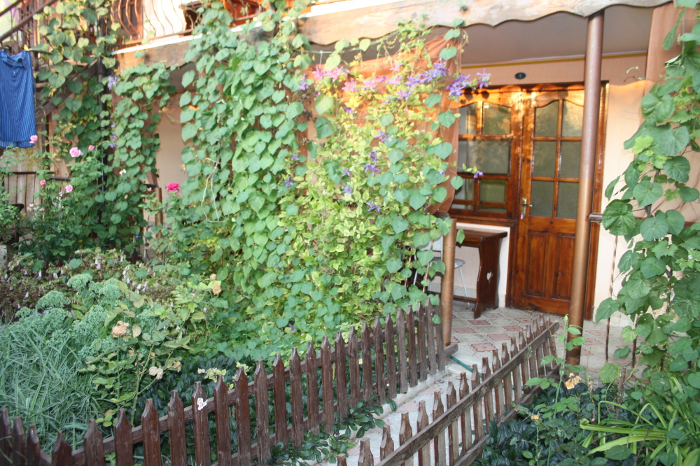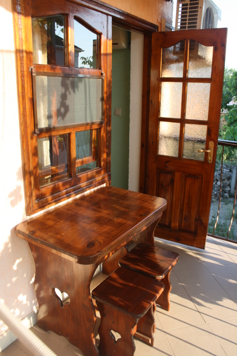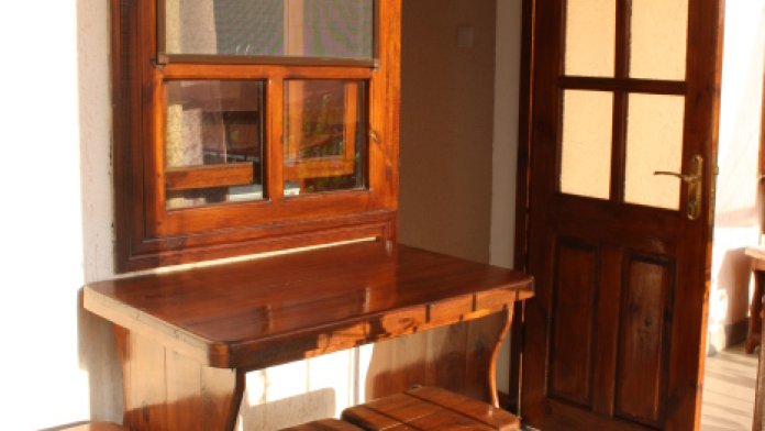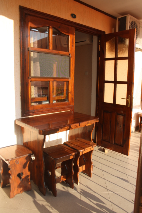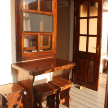 Возле каждой комнаты деревянный столик и стульчики. Можно принимать пищу на свежем воздухе. Окна и входные двери в комнате изготовлены из дерева.