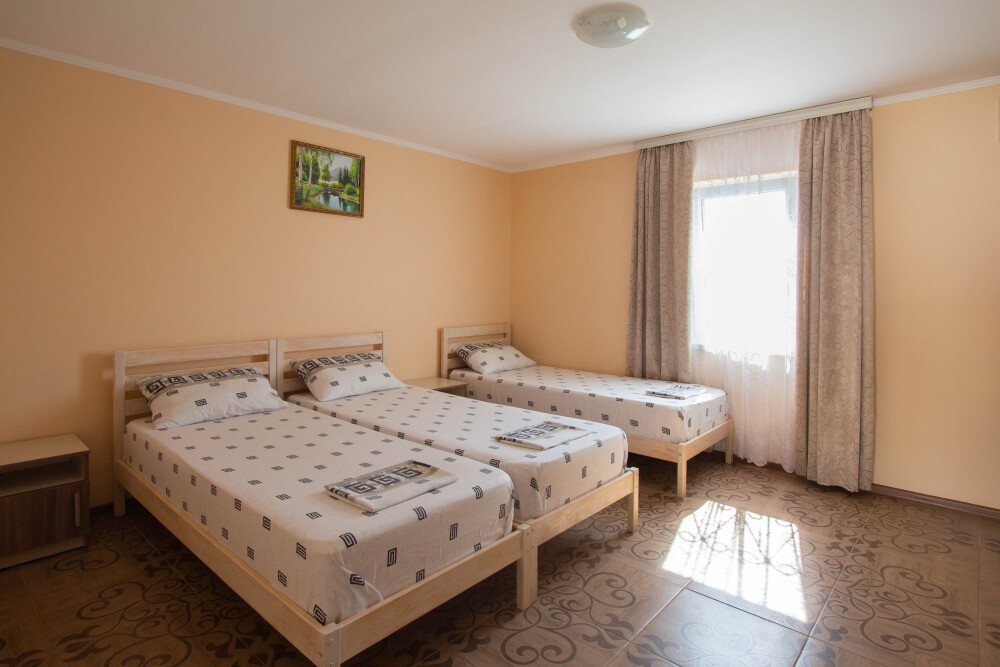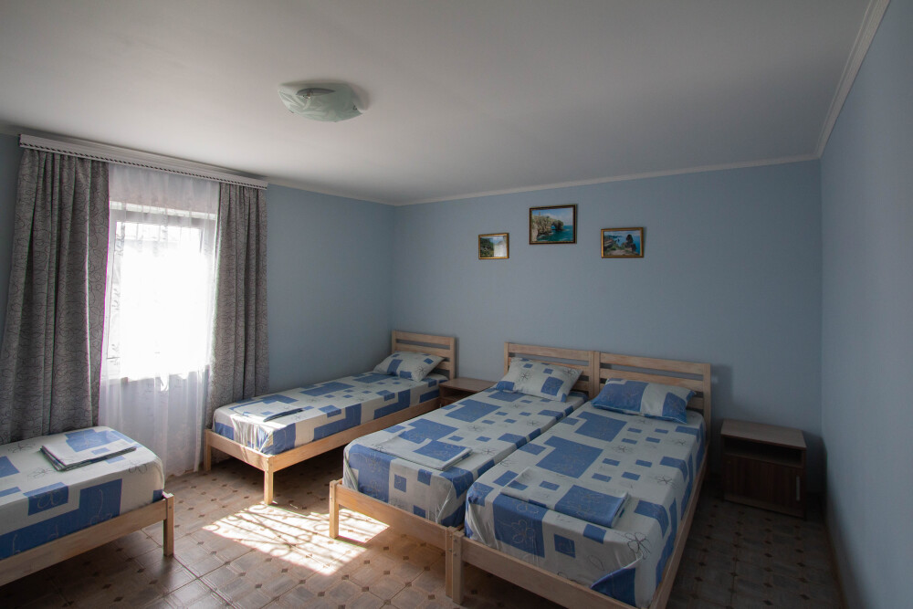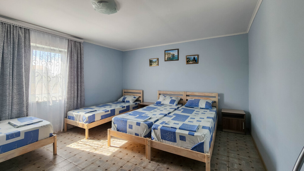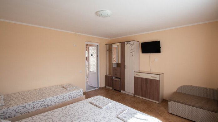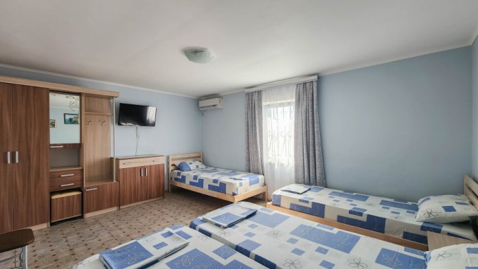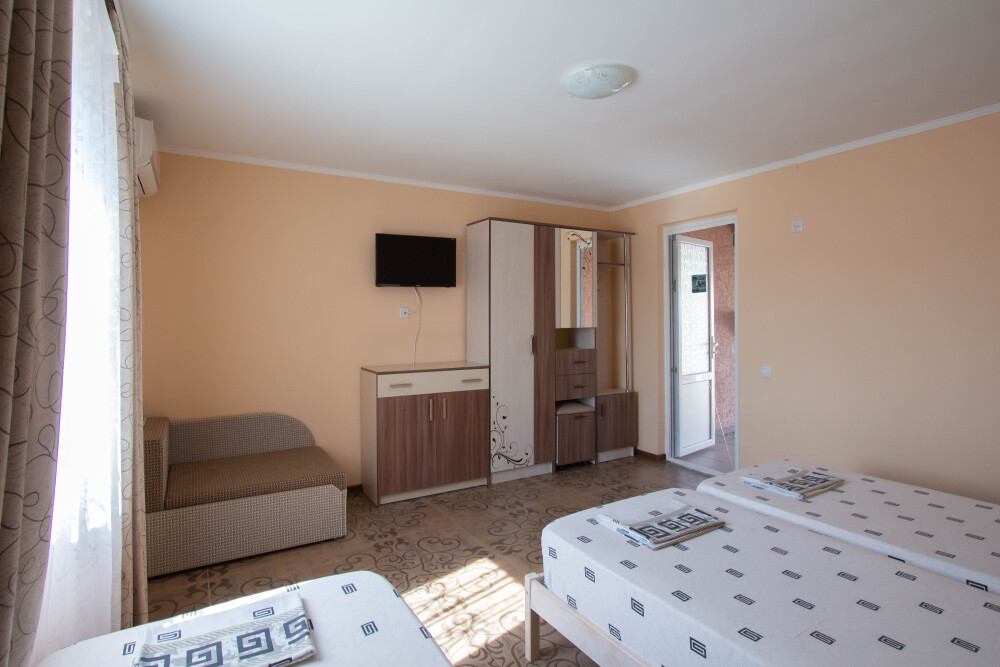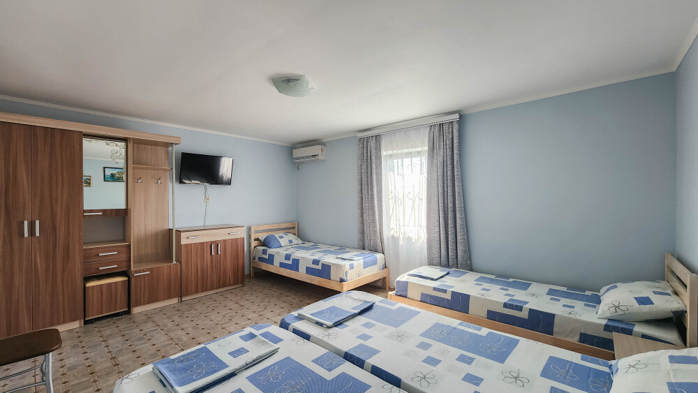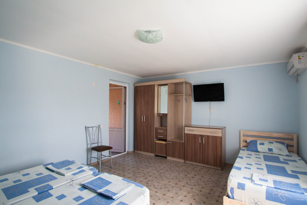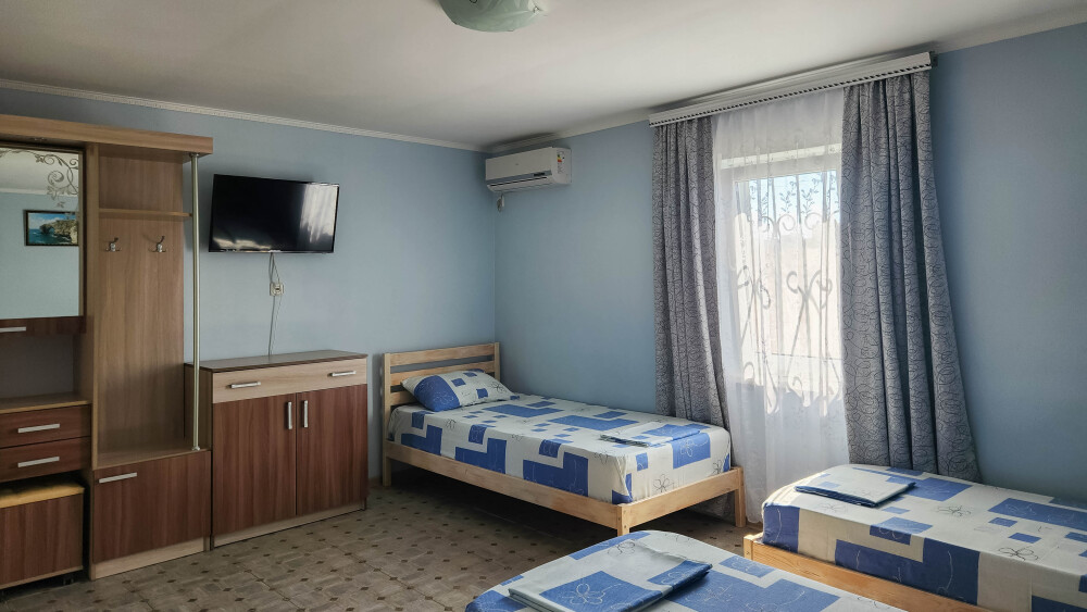 Гостевой дом располагает двумя уютными трехместными номерами с дополнительным местом -раскладной диванчик. В первом номере двухспальная кровать и одна односпальная кровать.Во втором номере три односпальные кровати. В обоих номерах имеется кондиционер.телевизор,шкаф с зеркалом.своя оборудованная терраса.Во всех номерах бесплатный Wi-Fi