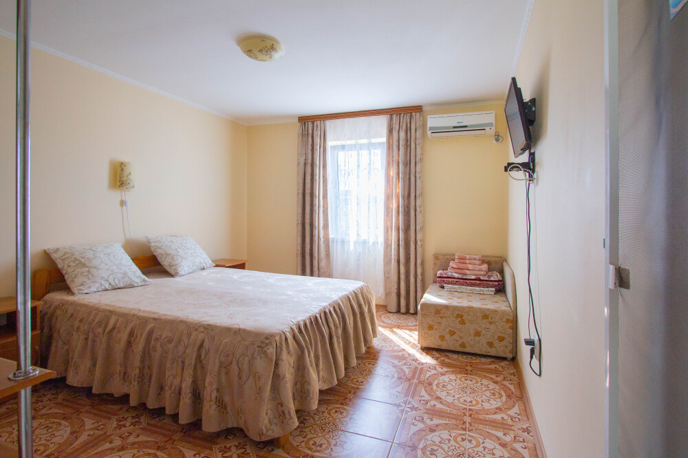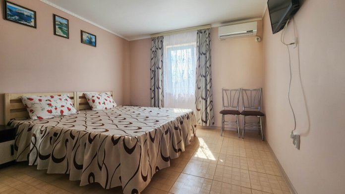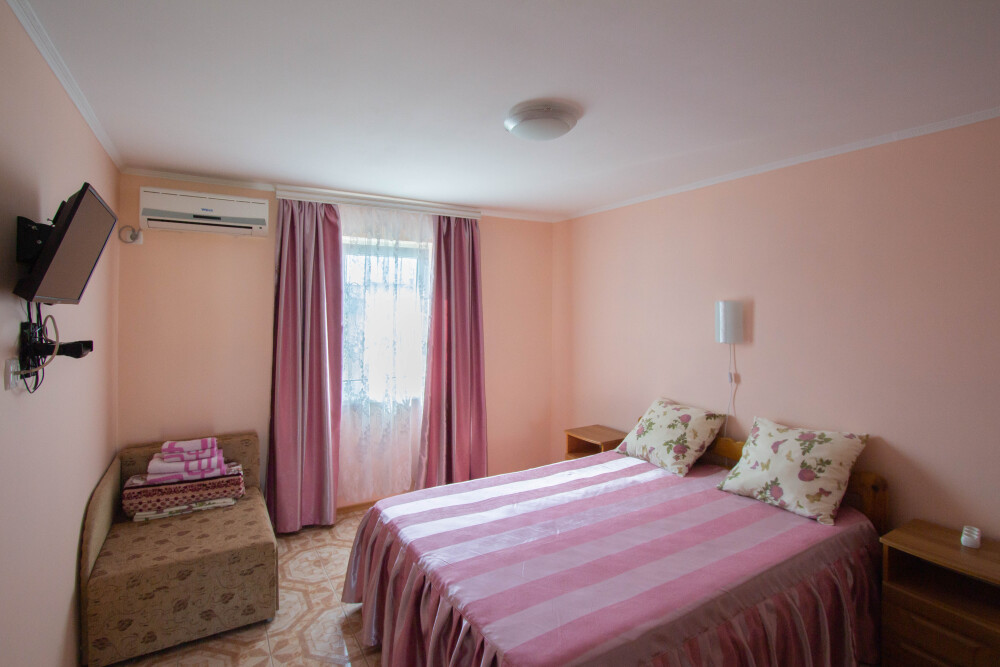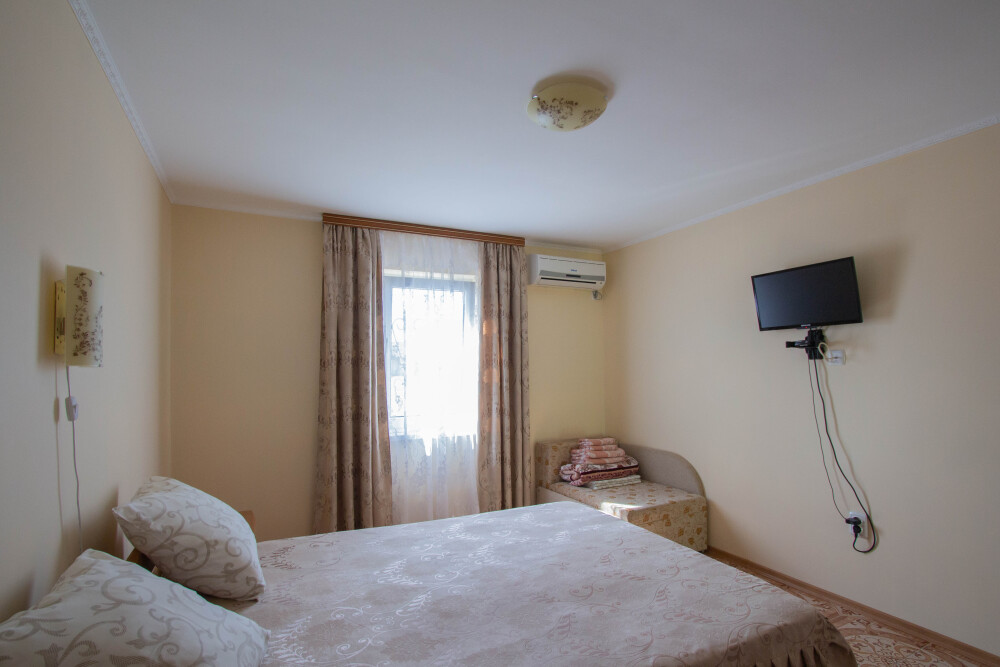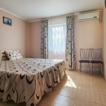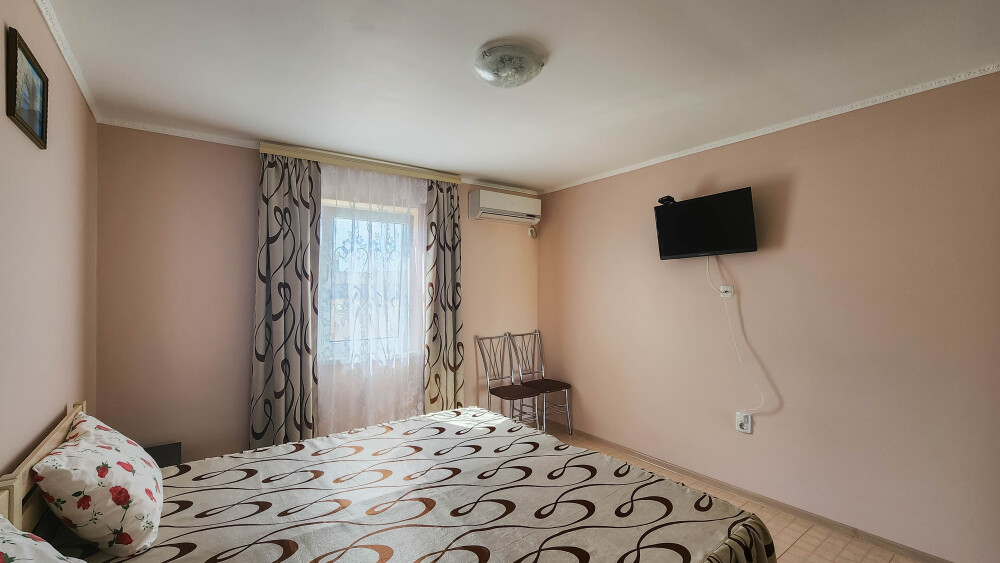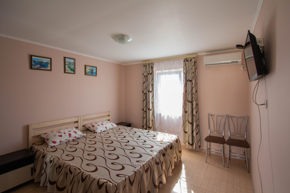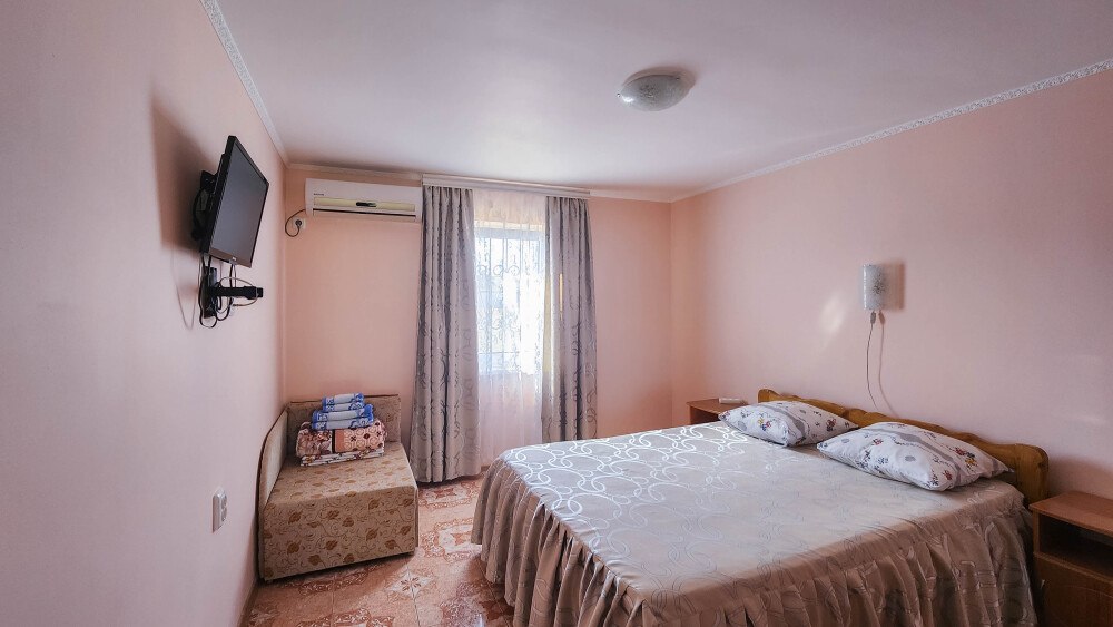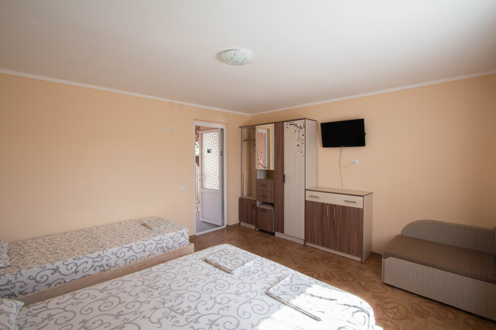 Гостевой дом располагает двумя уютными трехместными номерами с дополнительным местом -раскладной диванчик. В первом номере двухспальная кровать и одна односпальная кровать.Во втором номере три односпальные кровати. В обоих номерах имеется кондиционер.телевизор,шкаф с зеркалом.своя оборудованная терраса.Во всех номерах бесплатный Wi-Fi