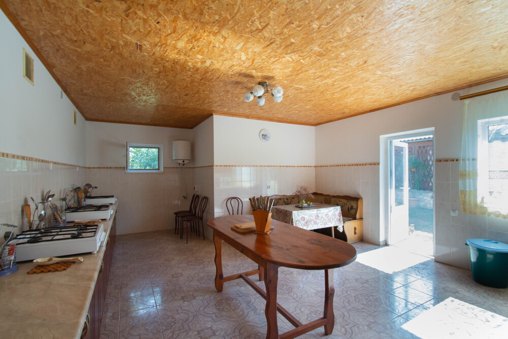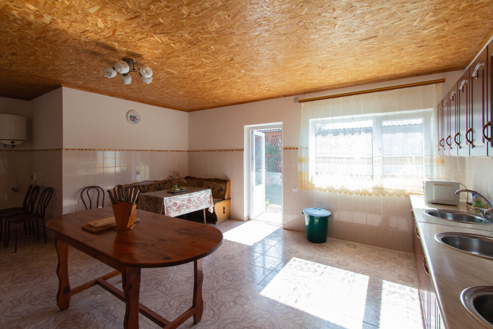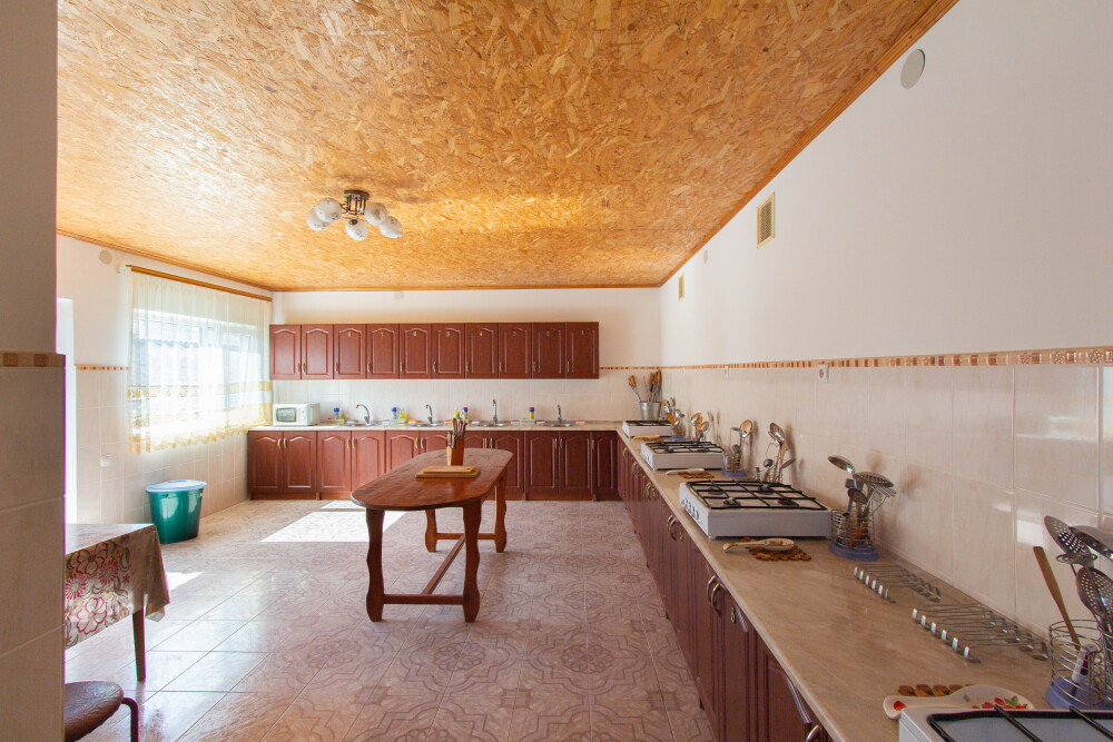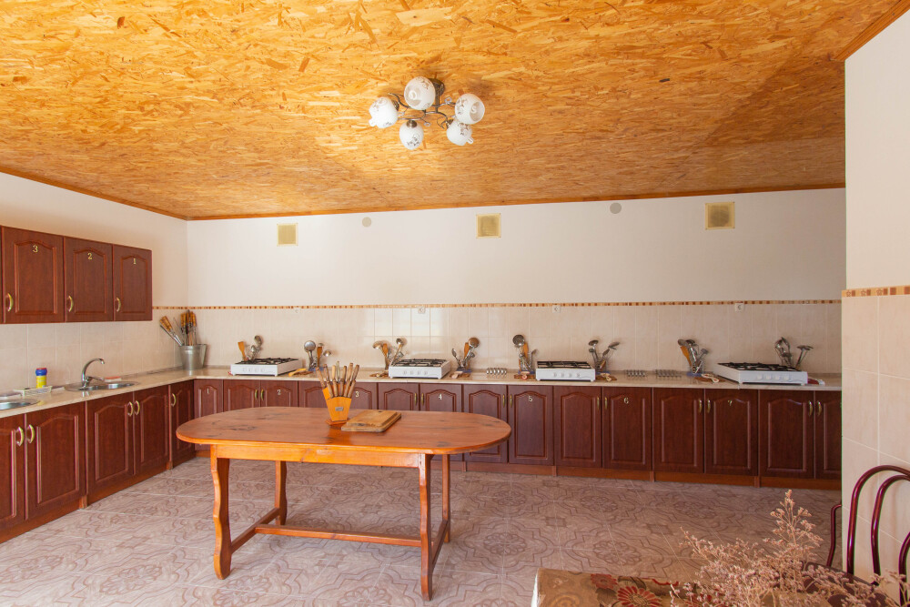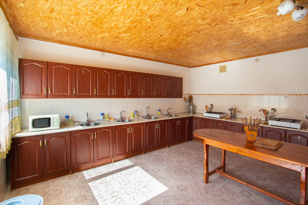 На территории имеется общая просторная кухня для самостоятельного приготовления пищи.Кухня оборудована всем необходимым: газовые плиты, микроволновая печь, для каждого номера свой кухонный шкаф со всей необходимой посудой.