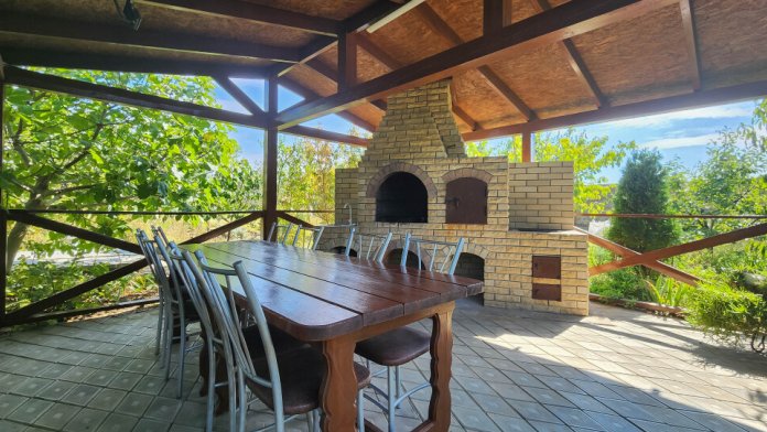 К вашему вниманию просторный, уютный, зеленый двор со множеством красивых и экзотических растений (цветы, декоративные кустарники, ароматные розы, хвойники), имеется зона барбекю, мангал под просторной беседкой.