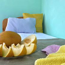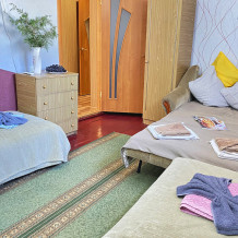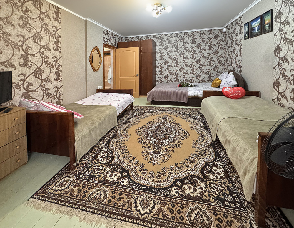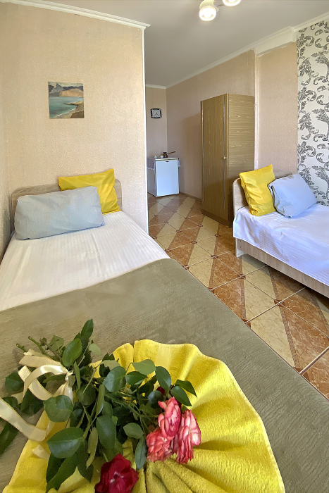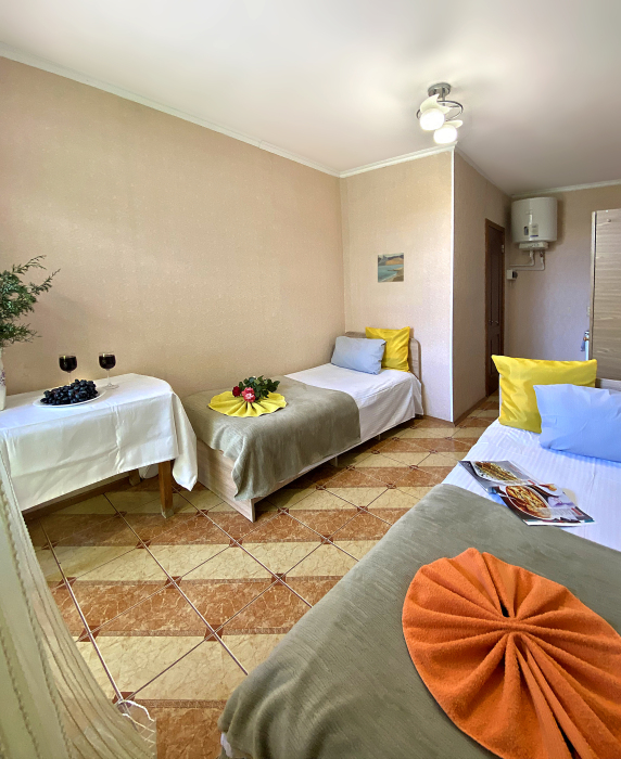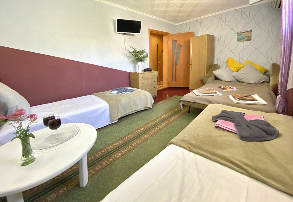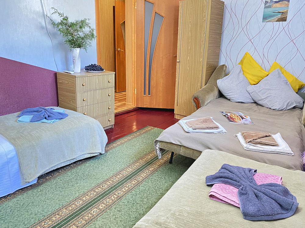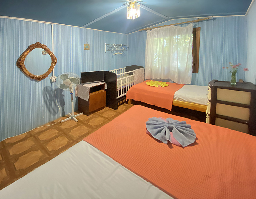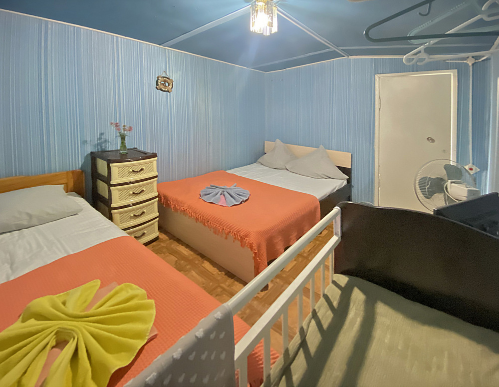 Размер номера 27 м². Услуги и удобства в номере: • 2 комнаты • 3 односпальные кровати и 1 двуспальная кровать • Мини-кухня• Холодильник• Вентилятор• Электрический чайник • Кухонные принадлежности • Полотенца• Белье• Обеденный стол• 1 этаж• WI-FI • Парковка• Звукоизоляция