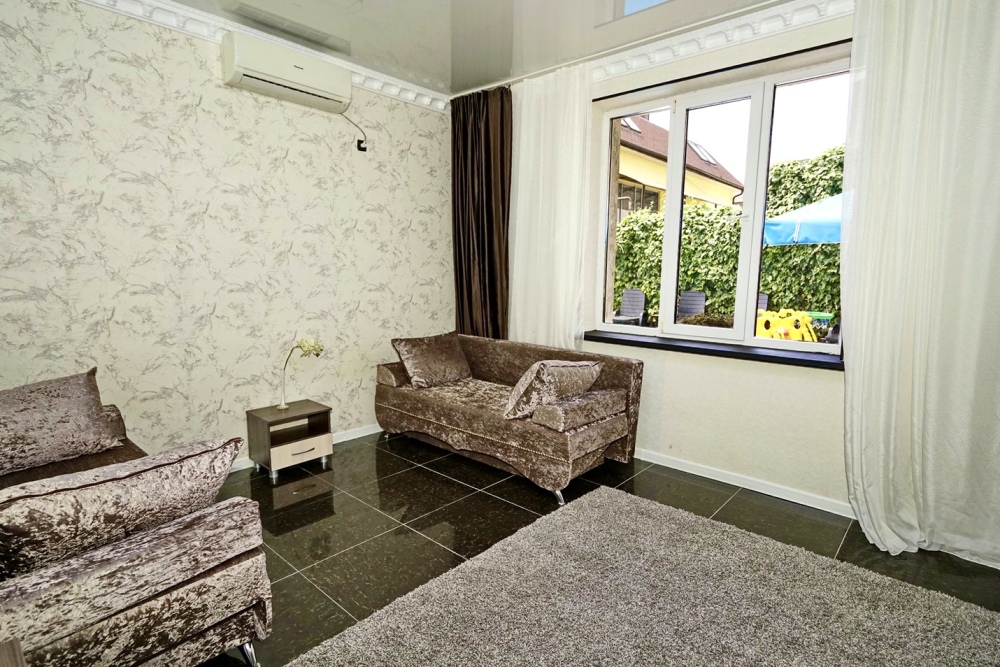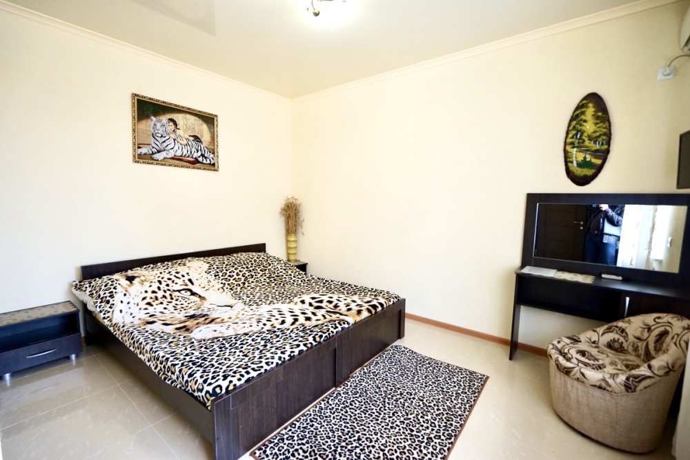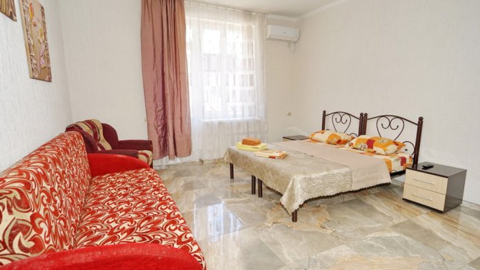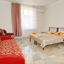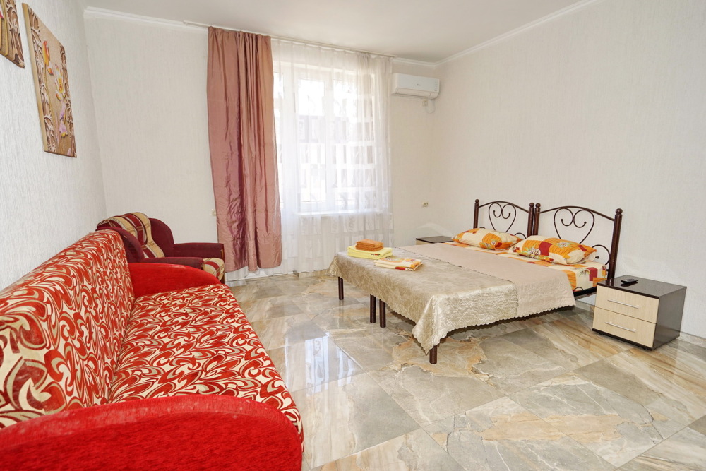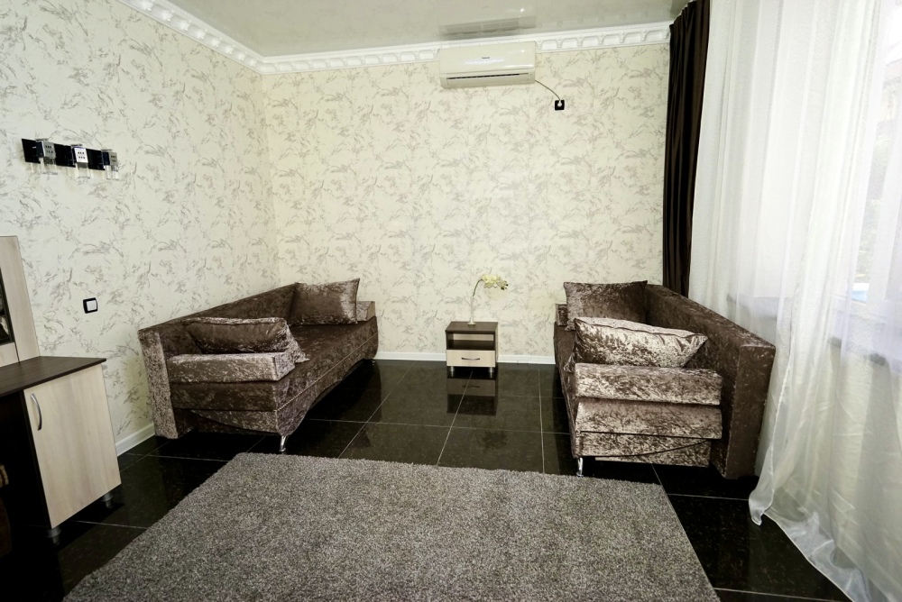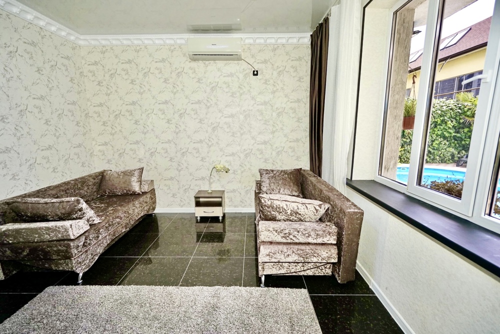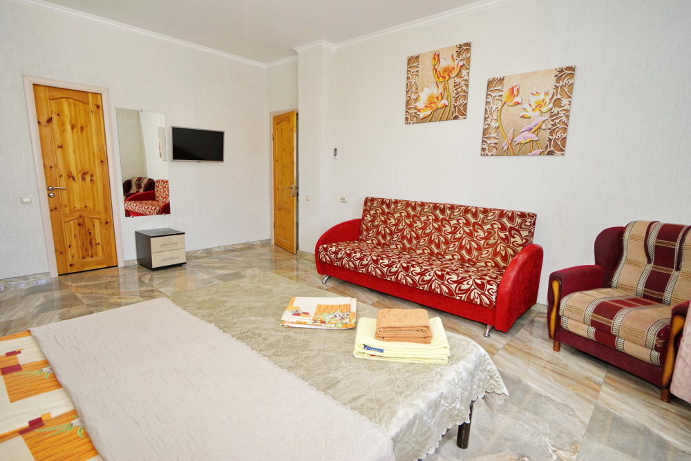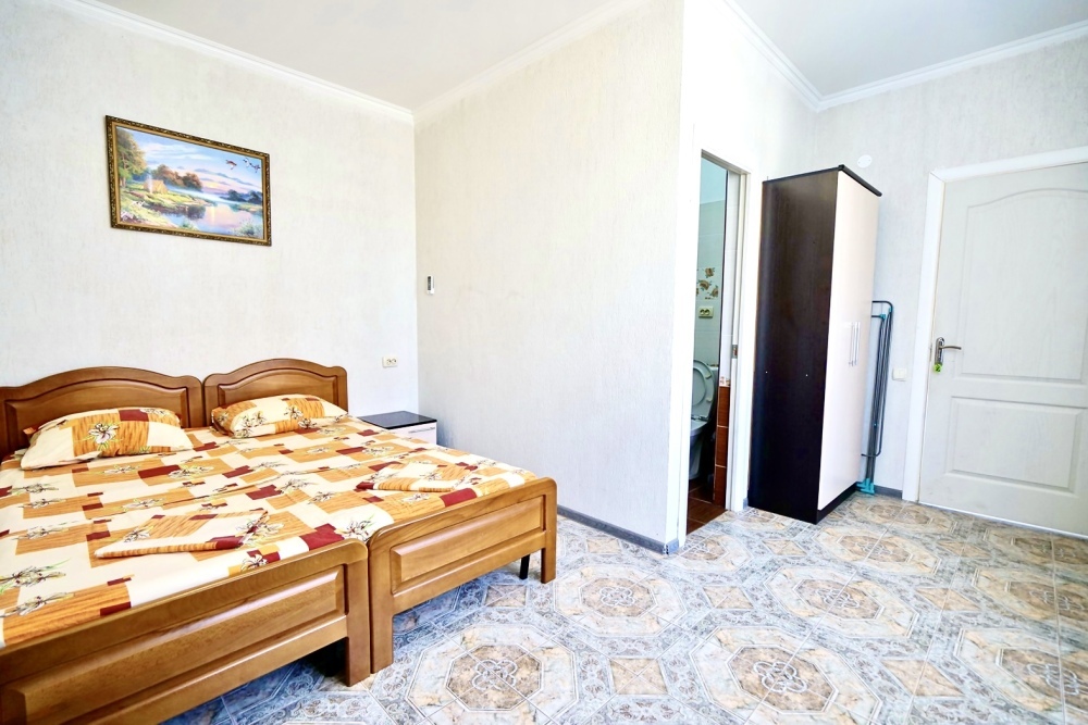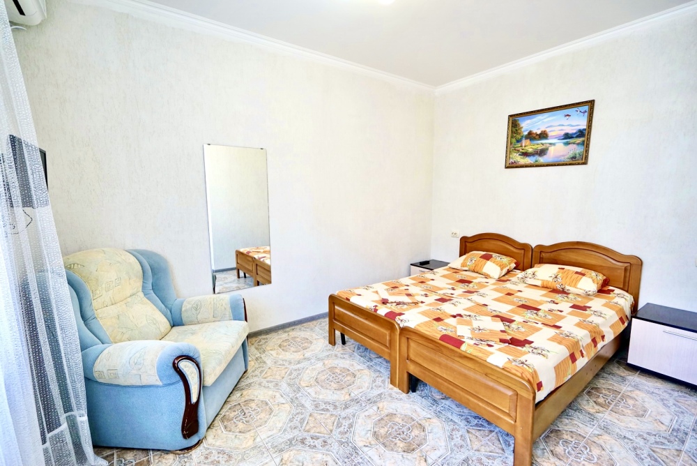 Спальные места: два комфортных двух-спальных дивана. Мебель: стулья, стол, шкаф, прикроватные тумбочки, прихожая, вешалка, зеркало. Техника: Телевизор, холодильник, кондиционер, чайник, постельное бельё, полотенца. Номер с личным выходом к бассейну и кухне. В номере имеется ванная и отдельно душевая кабина, туалет.