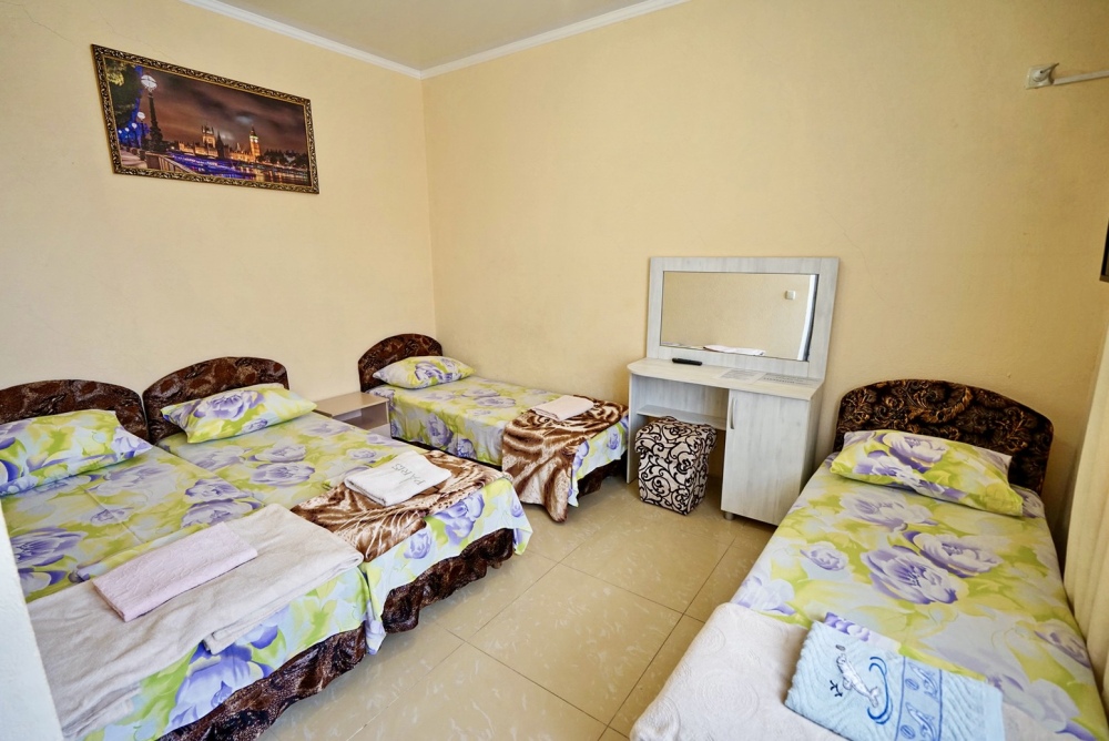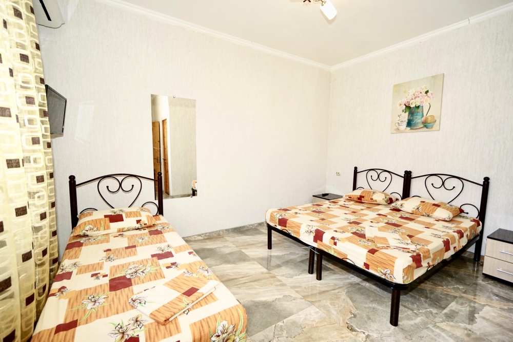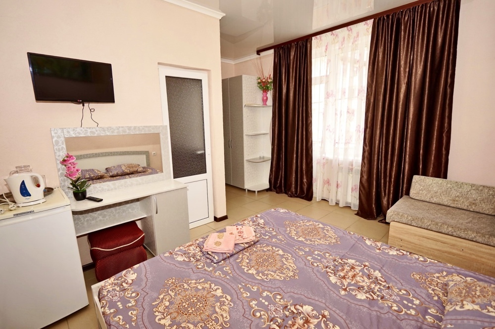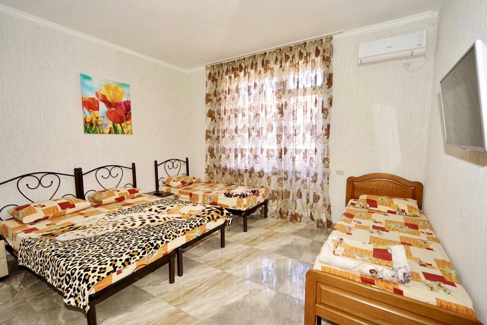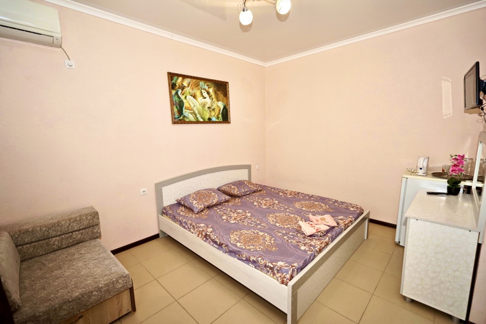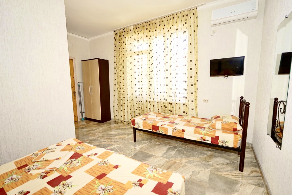 Все номера оснащены необходимой техникой и мебелью: кондиционер, холодильник, телевизор. Двор гостевого дома ухожен и оборудован местами для отдыха! Во дворе есть столы с навесами и оборудованные летние кухни, что дает существенно экономить на питании и готовить по своему расписанию! Зона барбекю находится на соседней территории нашего гостевого дома, в 5х минутах ходьбы. А в непогоду или просто когда лень идти на море, у нас есть теплый бассейн, для освежения и отдыха. Гостевой дом для тех, кто ценит спокойный, «домашний» отдых вдали от шума набережной, но с возможностью быстро до неё добраться.