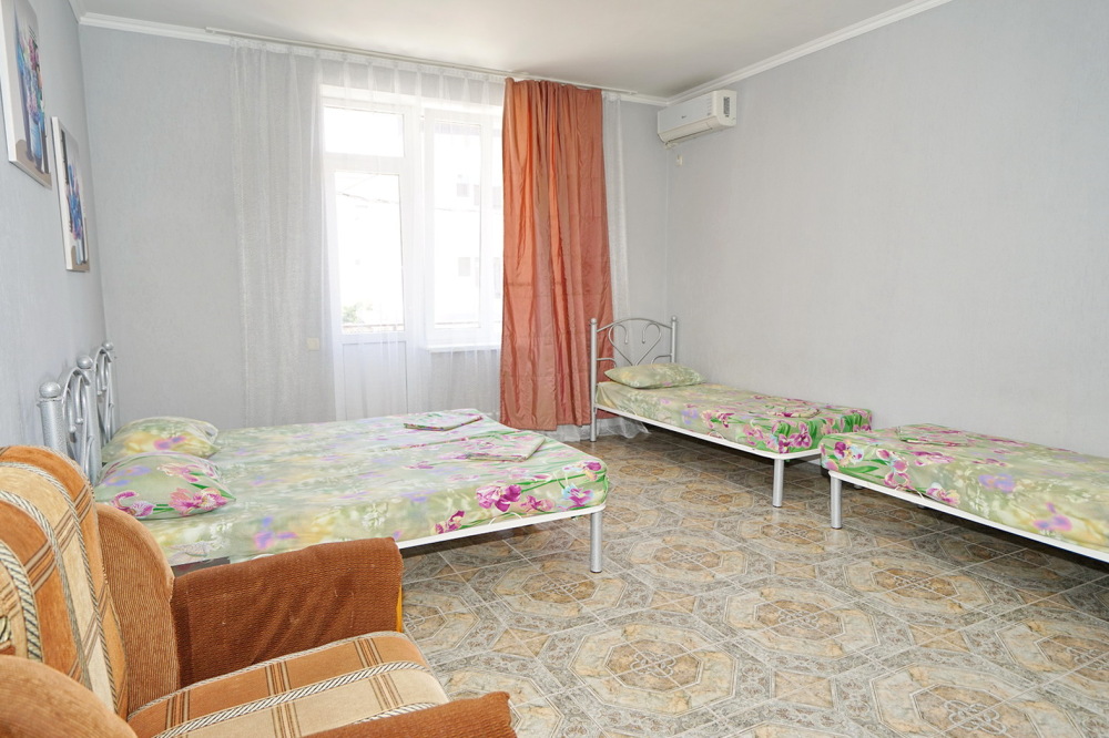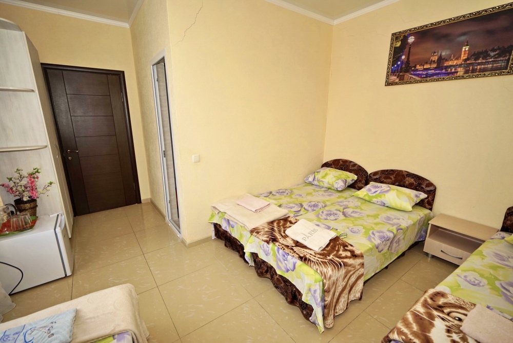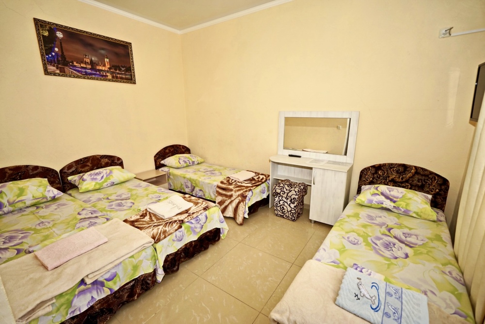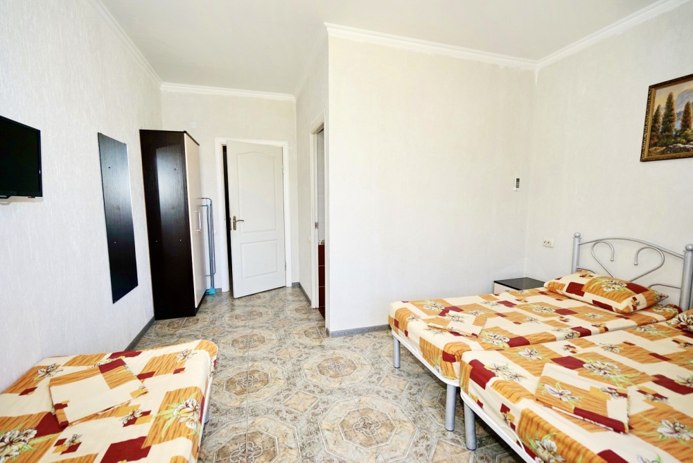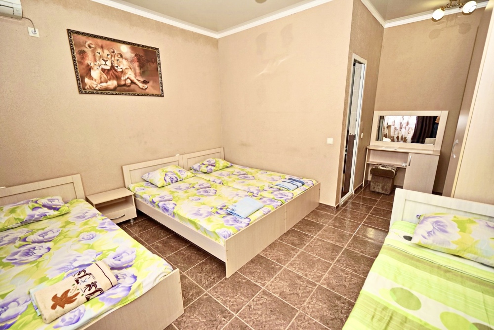 Спальные места: две односпальные кровати и диван кровать или 4 односпальных кровати. Мебель: стулья, стол, шкаф, прикроватные тумбочки, прихожая, вешалка, зеркало. Техника: Телевизор, холодильник, кондиционер. Во всех номерах личный санузел, интернет, постельное бельё, полотенца.
