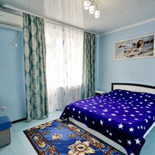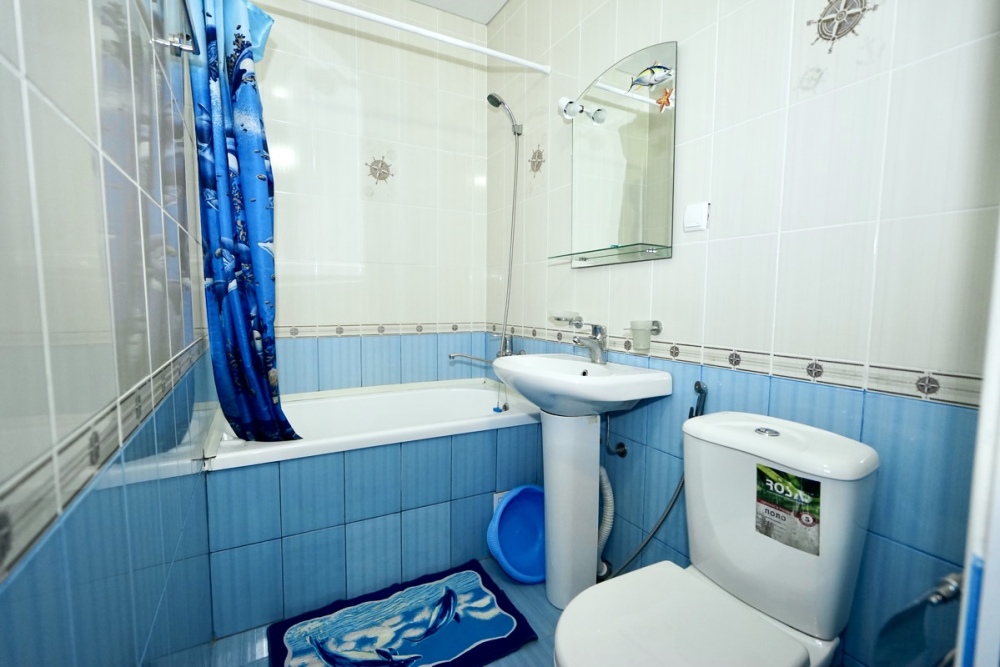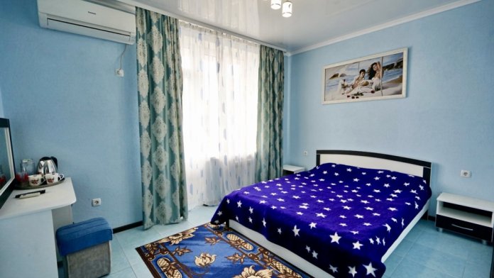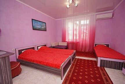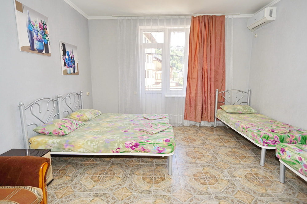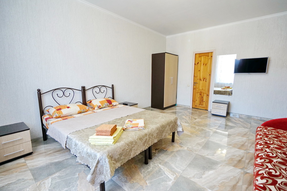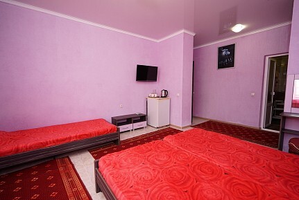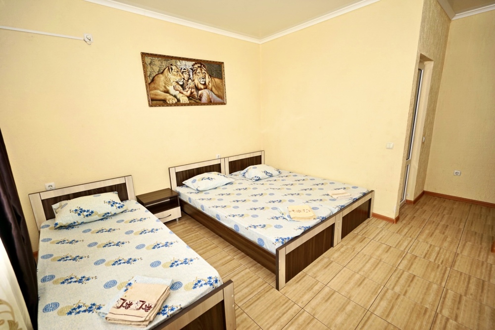 Спальные места: две односпальные кровати и диван кровать или 4 односпальных кровати. Мебель: стулья, стол, шкаф, прикроватные тумбочки, прихожая, вешалка, зеркало. Техника: Телевизор, холодильник, кондиционер. Во всех номерах личный санузел, интернет, постельное бельё, полотенца.