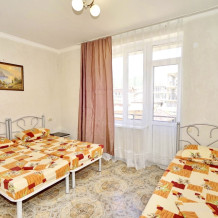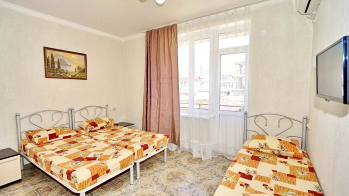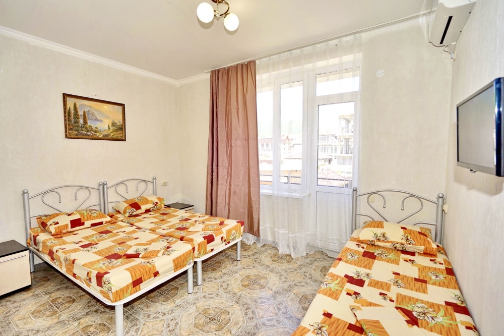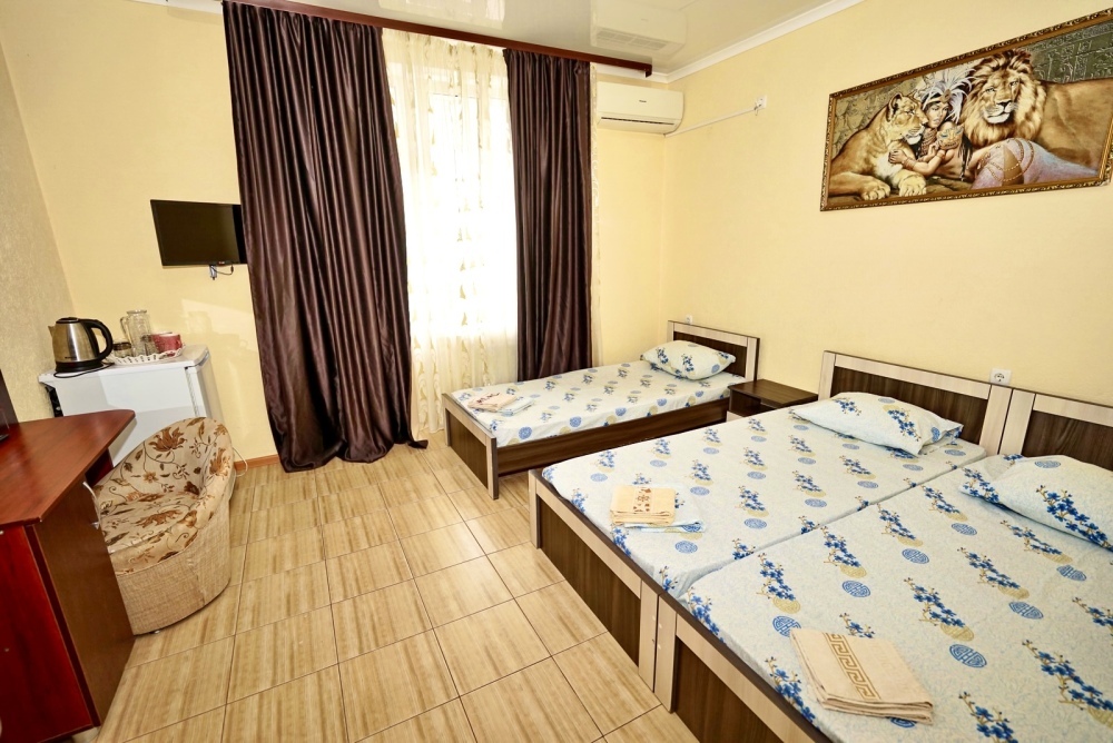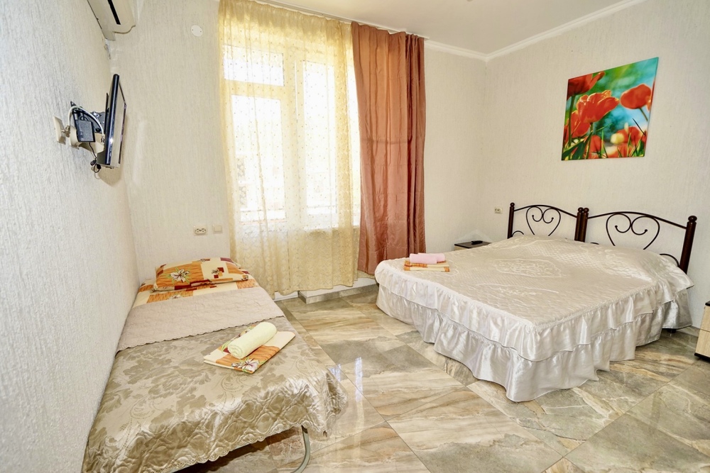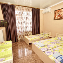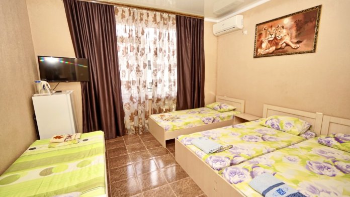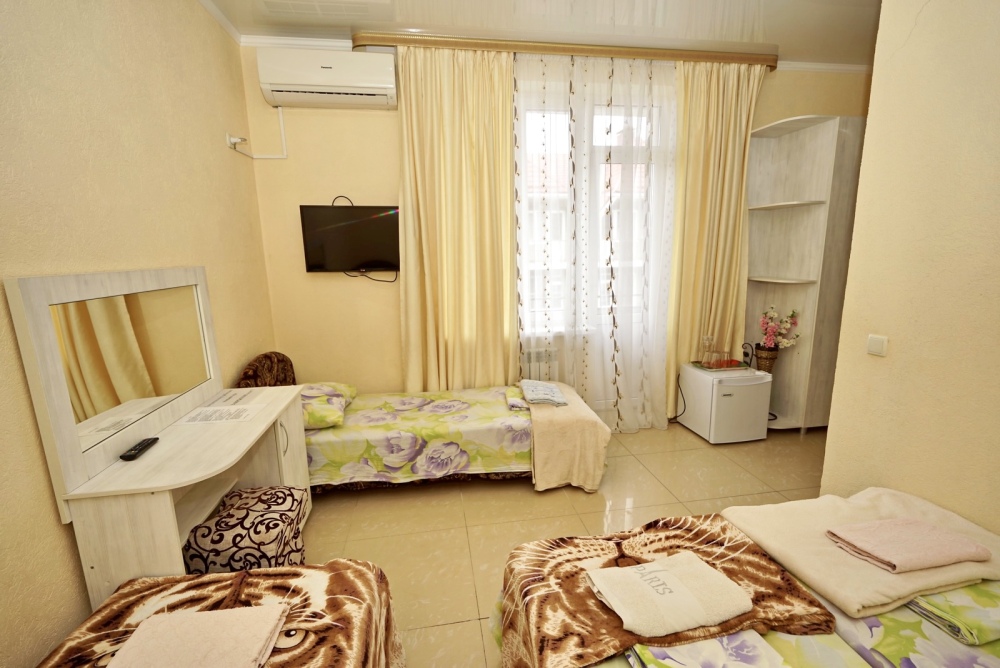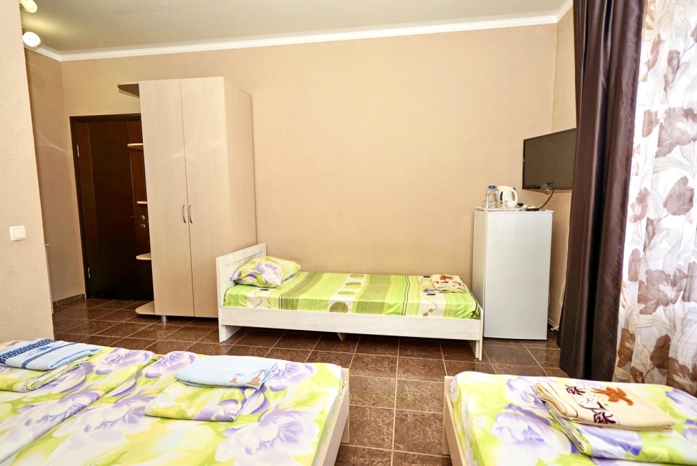 Спальные места: три односпальные кровати. Мебель: стулья, стол, шкаф, прикроватные тумбочки, прихожая, вешалка, зеркало. Техника: Телевизор, холодильник, кондиционер. Во всех номерах личный санузел, интернет, постельное бельё, полотенца.