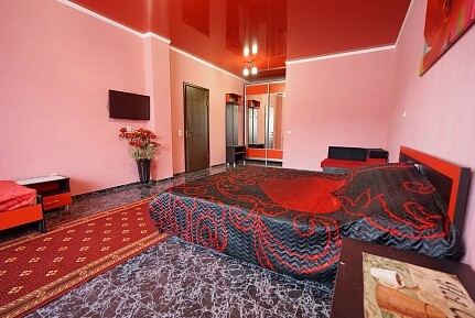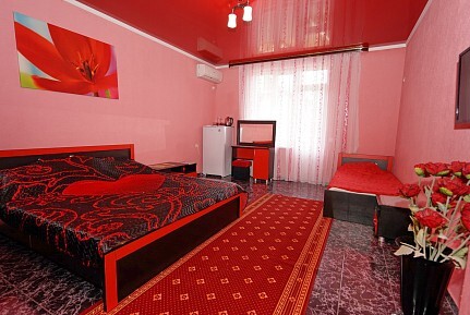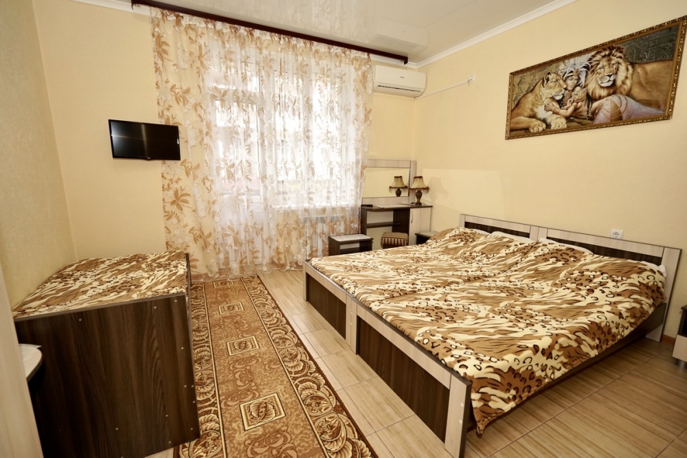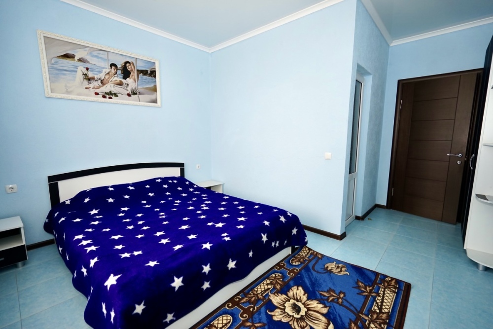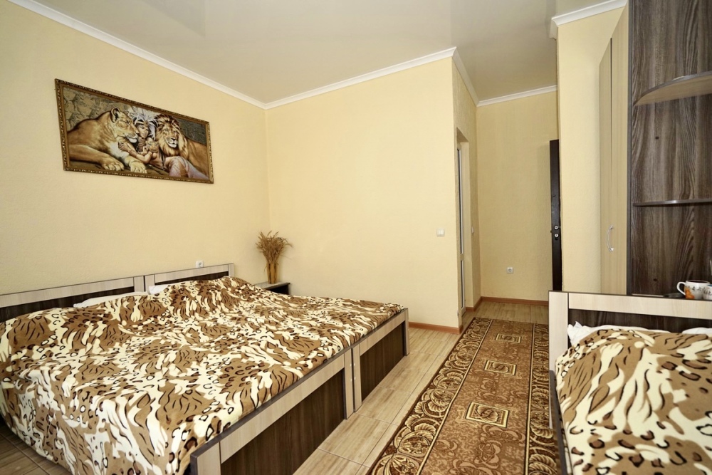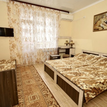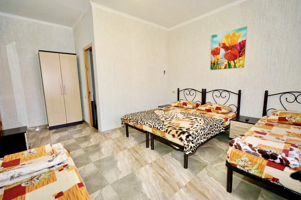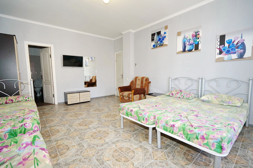 Спальные места: две односпальные кровати и двуспальная кровать или 4 односпальных кровати. Мебель: стулья, стол, шкаф, прикроватные тумбочки, прихожая, вешалка, зеркало. Техника: Телевизор, холодильник, кондиционер. Во всех номерах личный санузел, интернет, постельное бельё, полотенца.