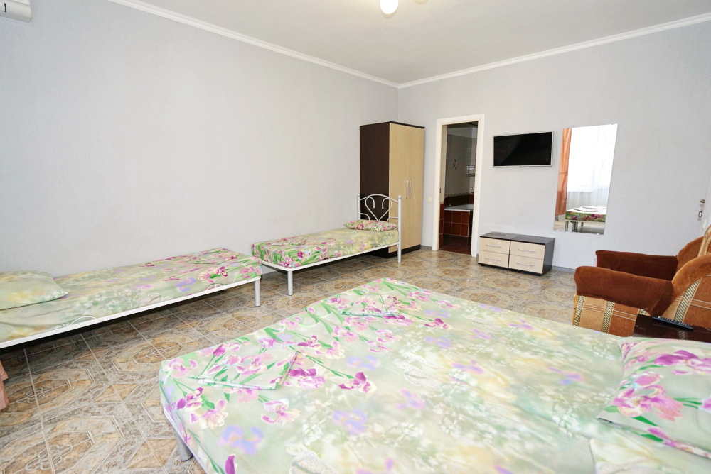 Спальные места: пять односпальных кроватей или три односпальные кровати и диван-кровать. Мебель: стулья, стол, шкаф, прикроватные тумбочки, прихожая, вешалка, зеркало. Техника: Телевизор, холодильник, кондиционер. Во всех номерах личный санузел, интернет, постельное бельё, полотенца.