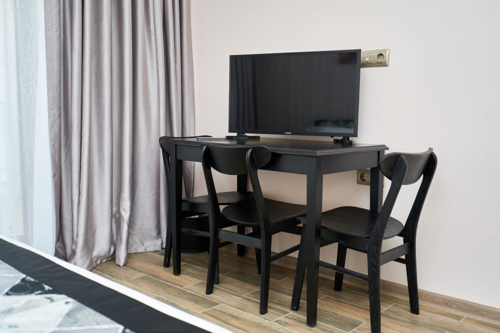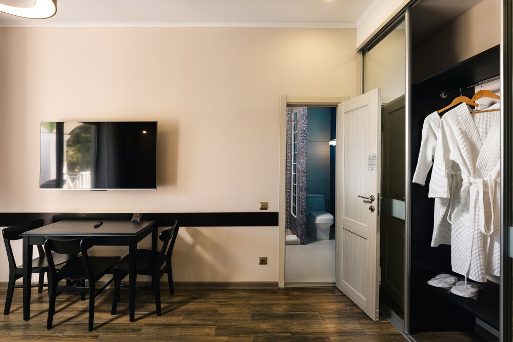 Просторная двухместная студия c классическим дизайном интерьера, укомплектована всем необходимым для комфортного проживания. Ортопедическая односпальная кровать, кресло, рабочая зона и плазменный телевизор. Просторный санузел. Панорамная терраса на входе на 2 номера, открывающая прекрасный вид на территорию комплекса, оборудована комплектом ротанговой мебели.