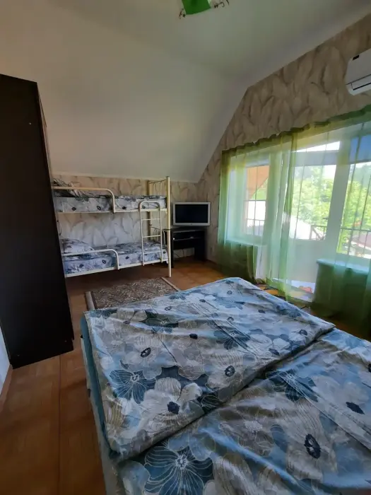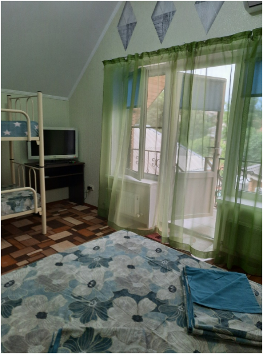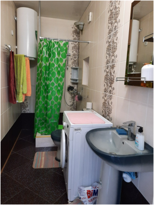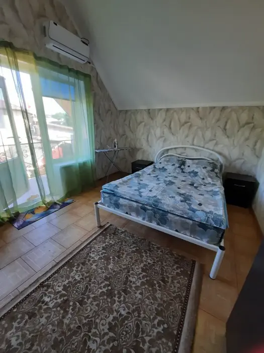 Уютный домик для семейного отдыха. Два этажа: на первом этаже находится санузел (душ, стиральная машина, унитаз, раковина) и кухня. На втором этаже находится спальня.