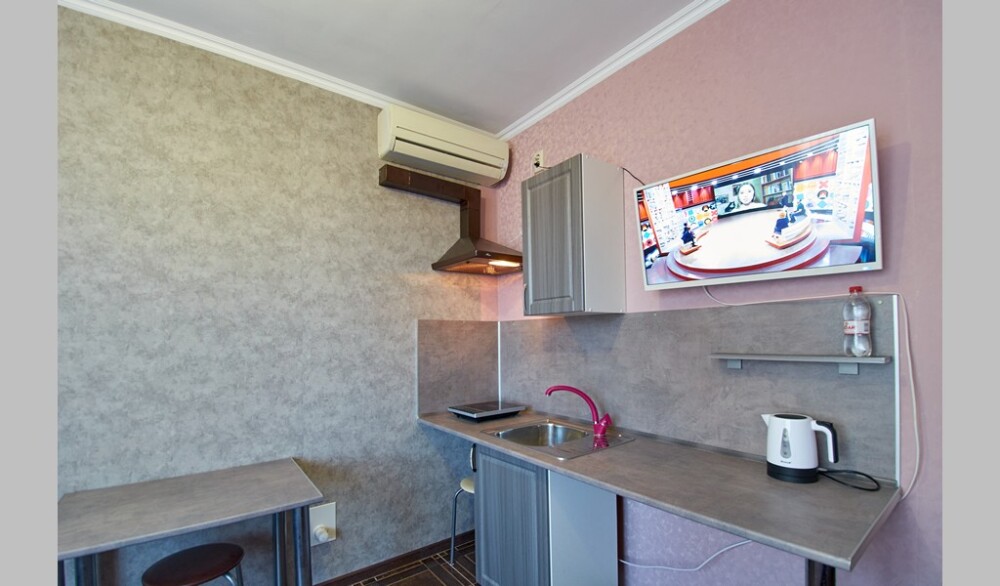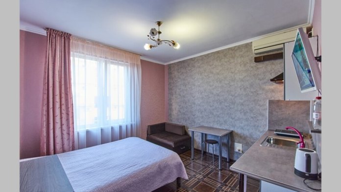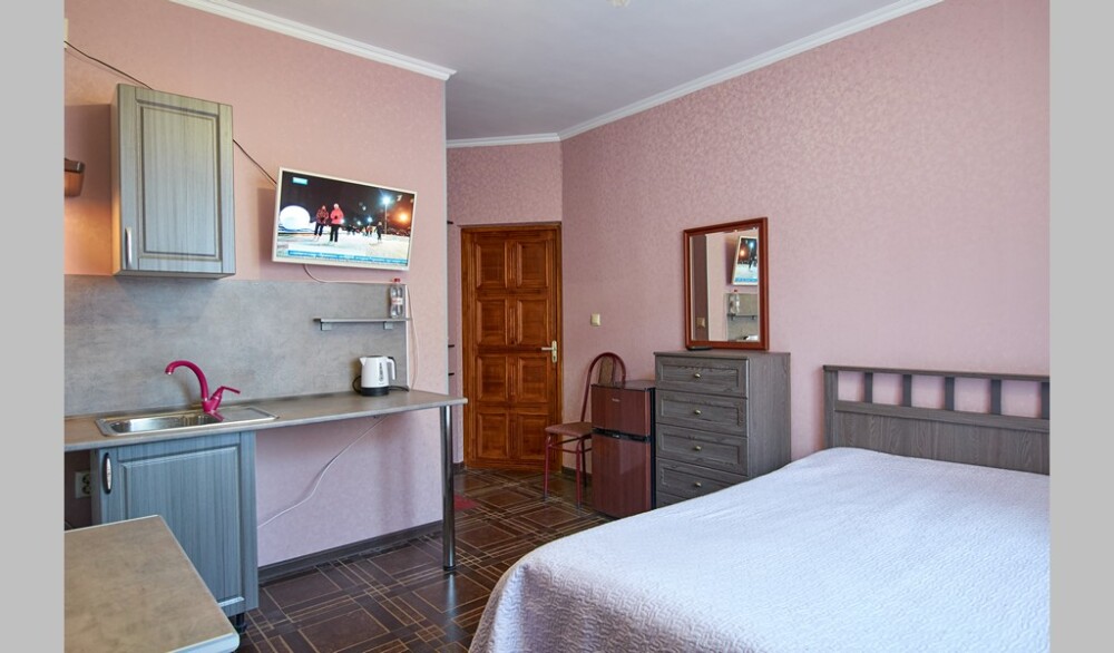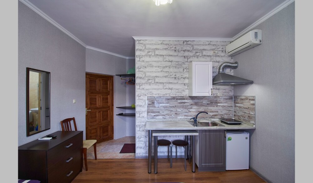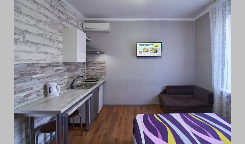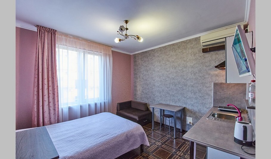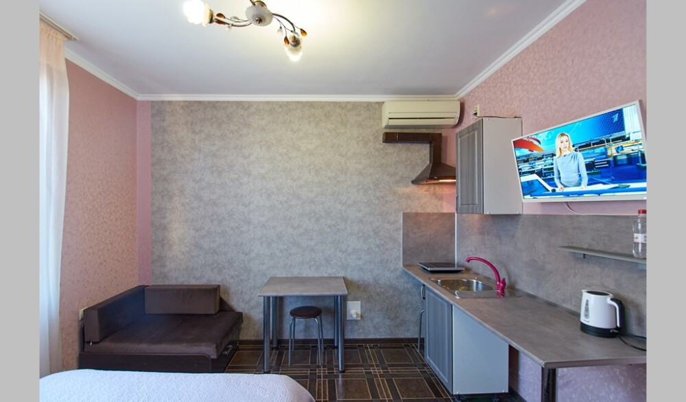 Студия со своей кухней, с удобствами. Душ, туалет, кондиционер, телевизор, плита, холодильник, кухня с раковиной. 3-й этаж. Быстрый Wi-Fi.