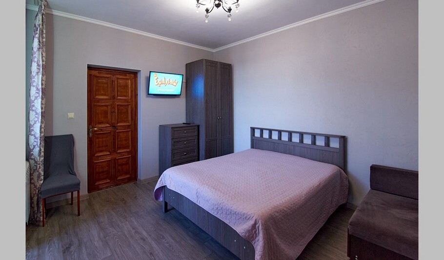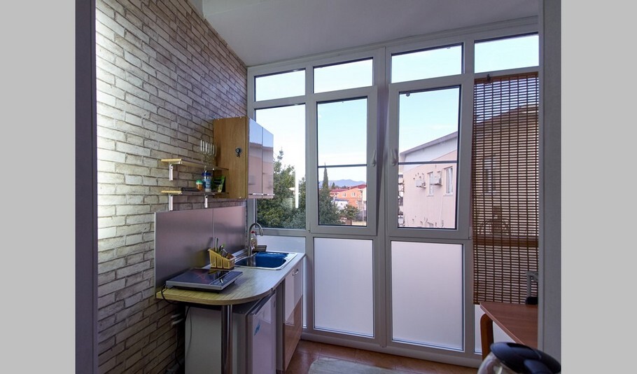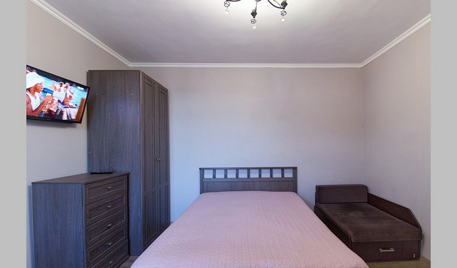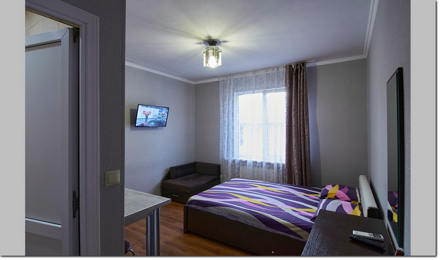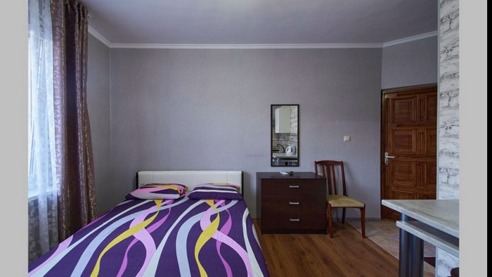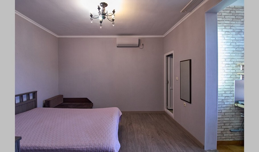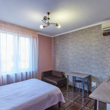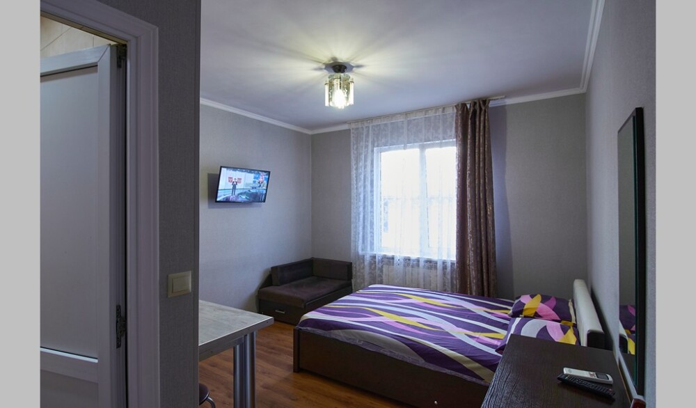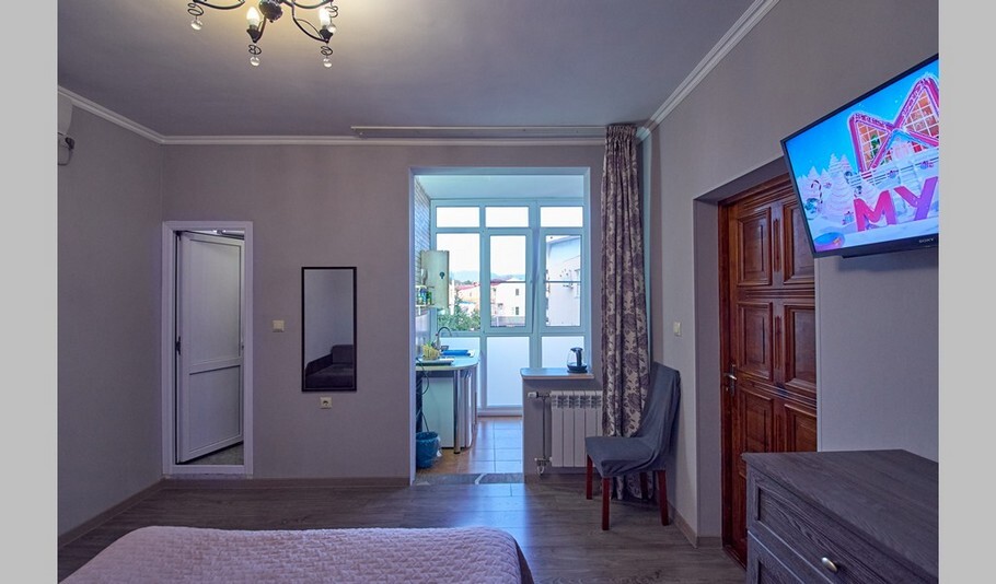 Студия со своей кухней, с удобствами. Душ, туалет, кондиционер, телевизор, плита, холодильник, кухня с раковиной. 3-й этаж. Быстрый Wi-Fi.