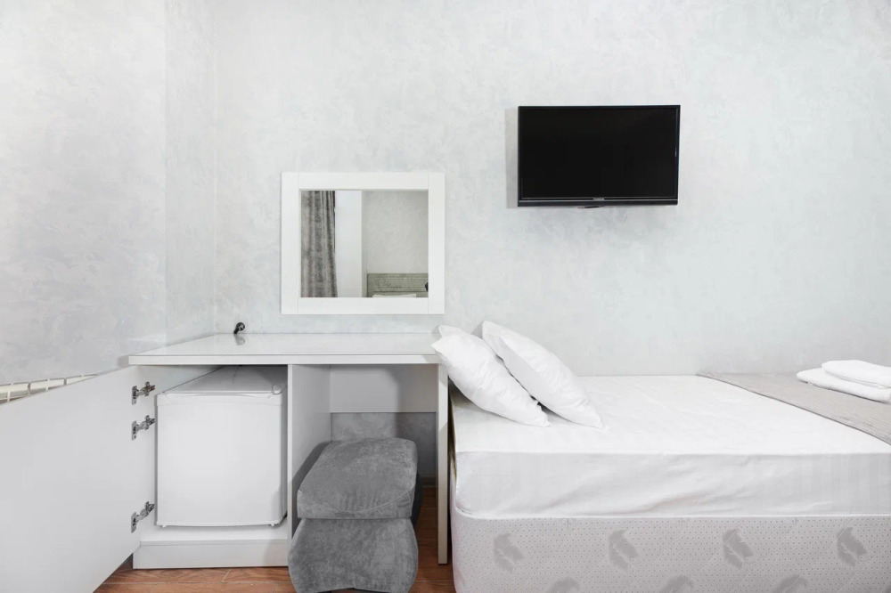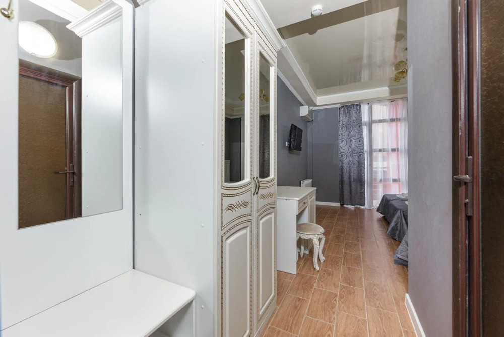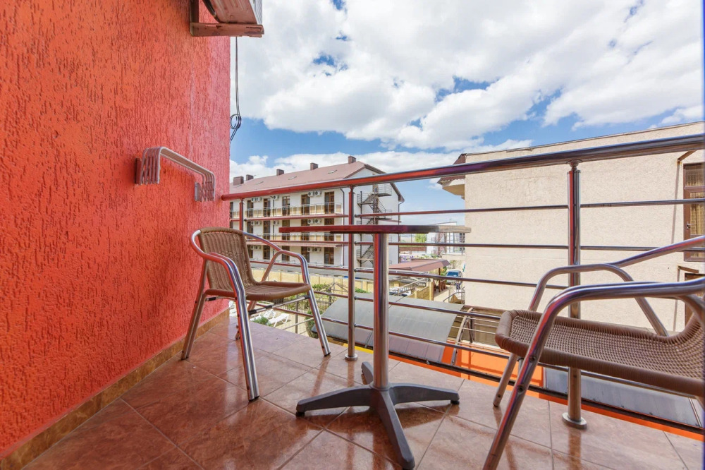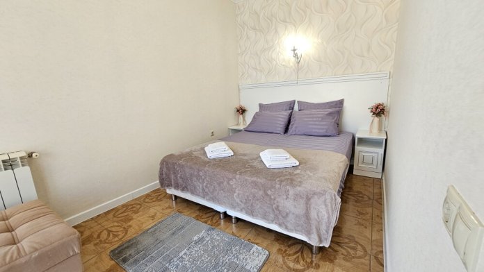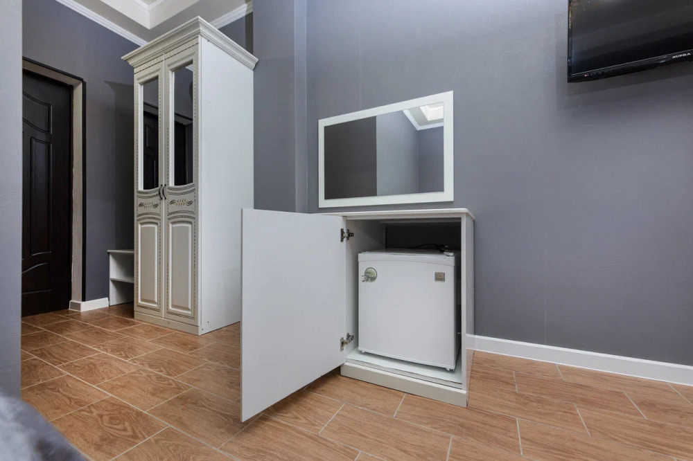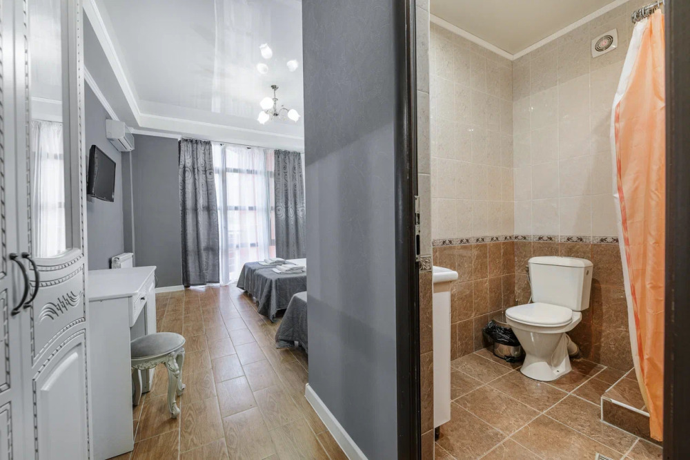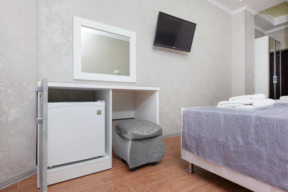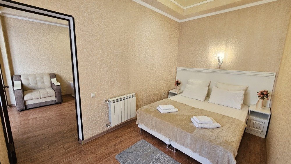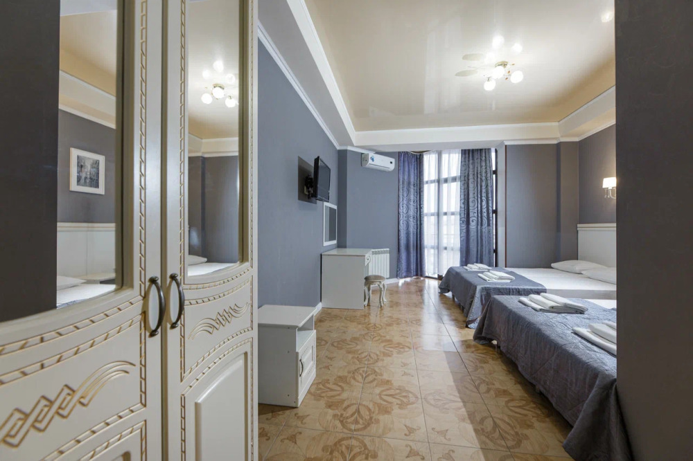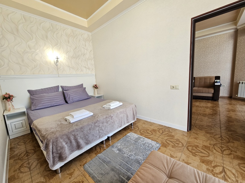 В номере: гостиная с диванной зоной, комод с зеркалом и рабочим местом, стол журнальный, шкаф плательный, ТВ, холодильник,сплит-система. Спальня, с двуспальной кроватью. Санузел с душем. Балкон.