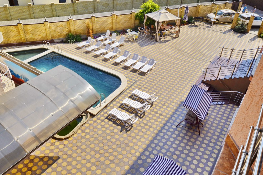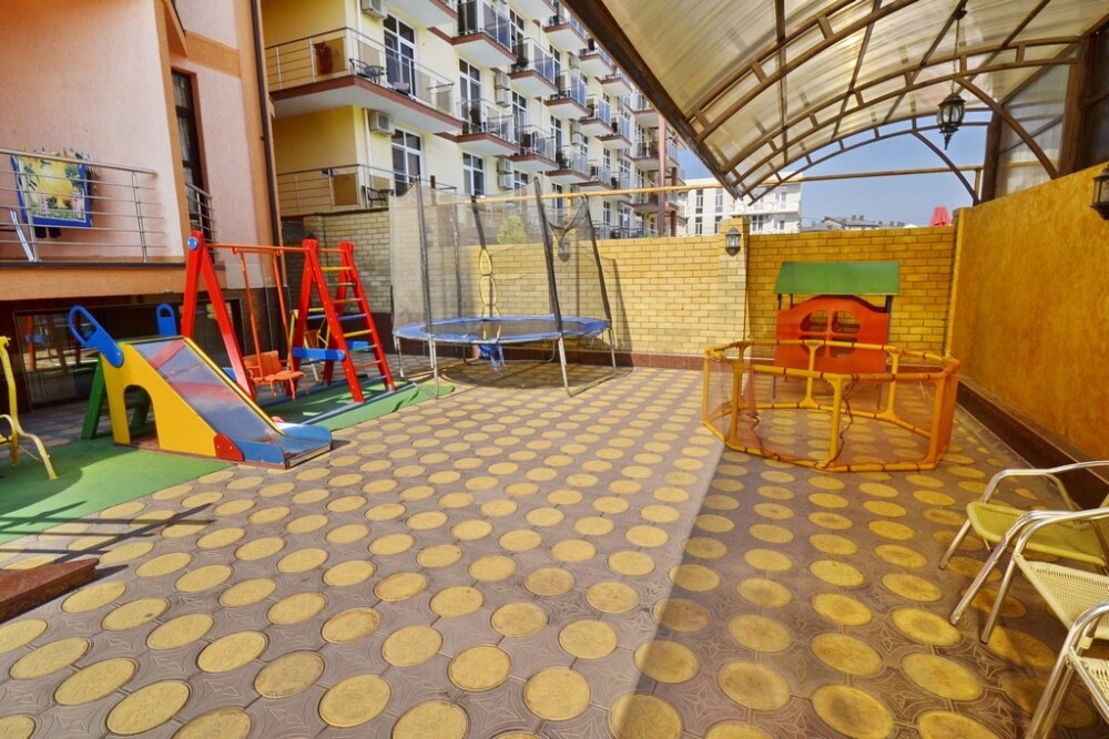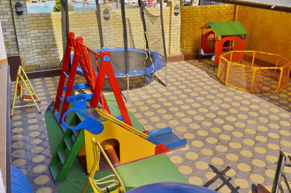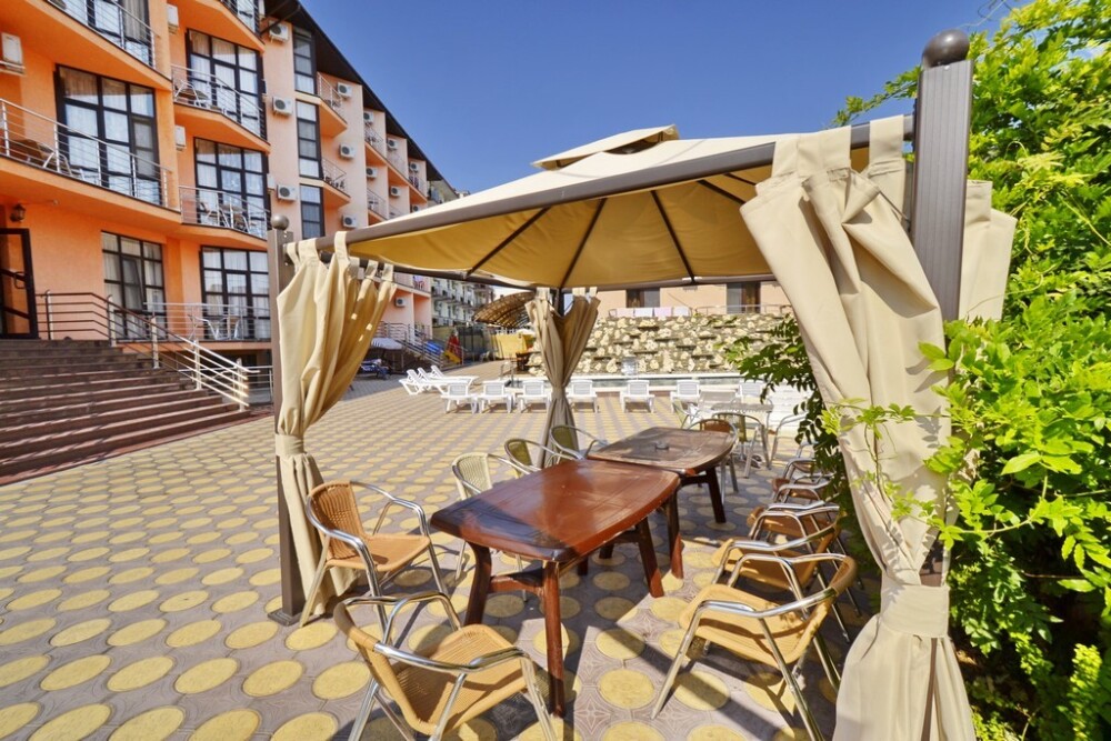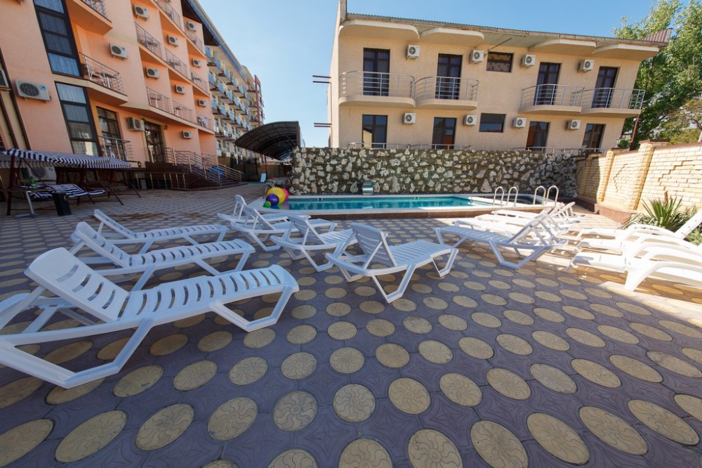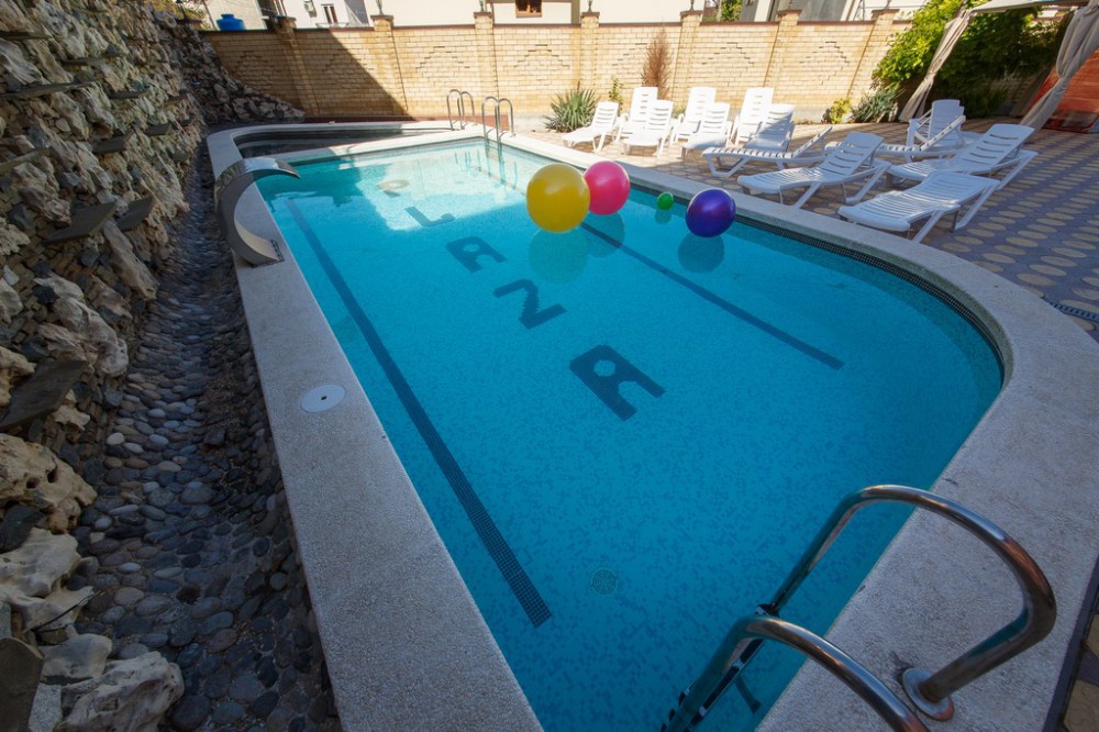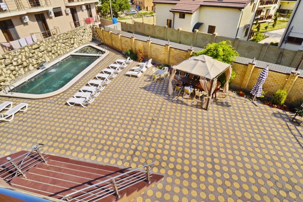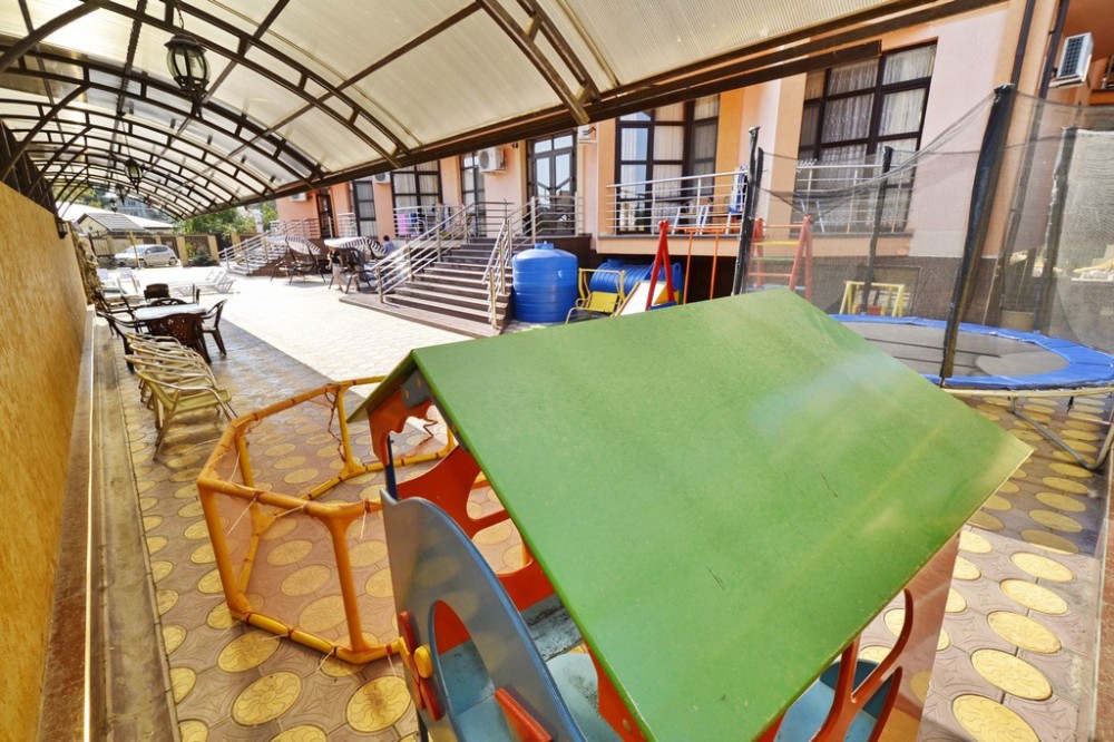 Отель представляет собой 4-этажное здание. Территория огороженная, с бассейном (с подогревом и гидромассажем) и большой уютной зоной отдыха, где Вы сможете проводить спокойные вечера в компании близких людей. Для детей предусмотрена детская площадка с домиком, горкой, лестницей, качелькой, каретой и батутом. В бассейне также имеется детское отделение, где могут резвиться маленькие гости. Около бассейна находится бар с освежающими напитками и легкими закусками. После купания можно отдохнуть в тени раскрытых зонтиков на стильных, удобных шезлонгах.