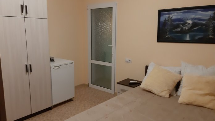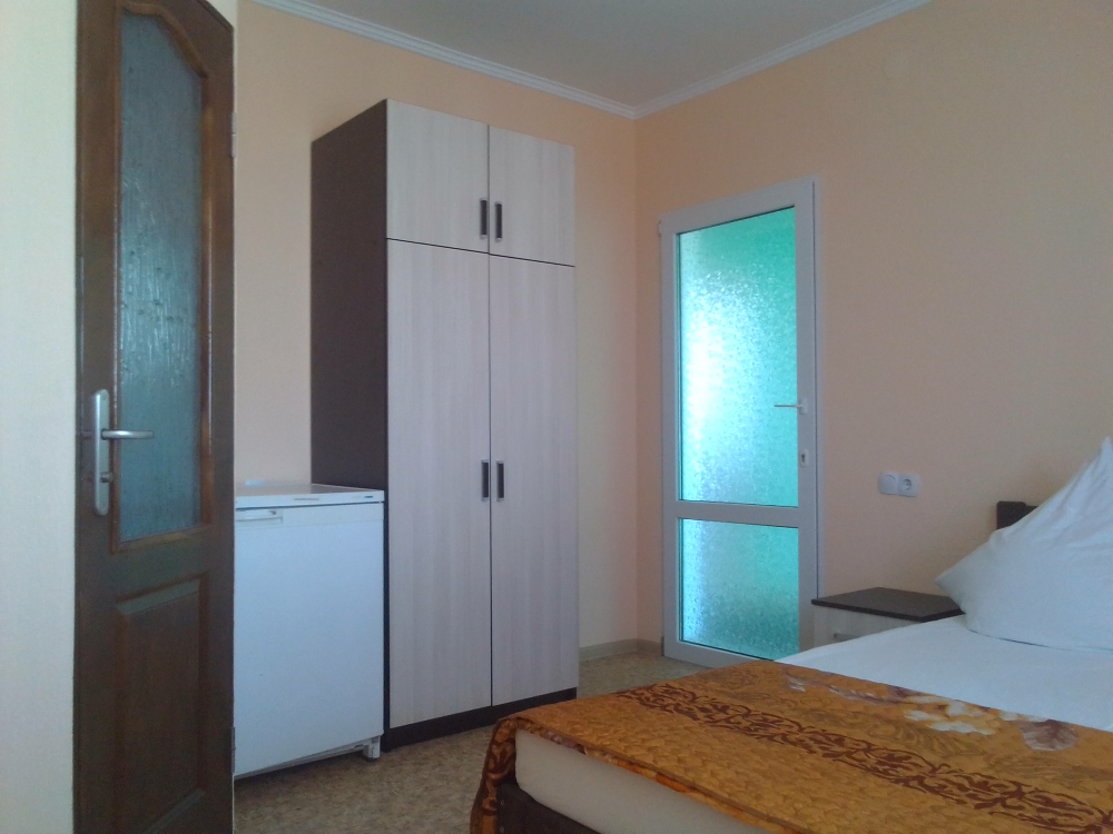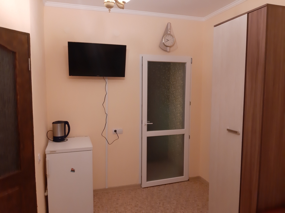 Так же в каждом номере имеется плазменный телевизор со спутниковым тв, холодильник, кровать с прикроватными тумбами, шкаф и журнальный столик.