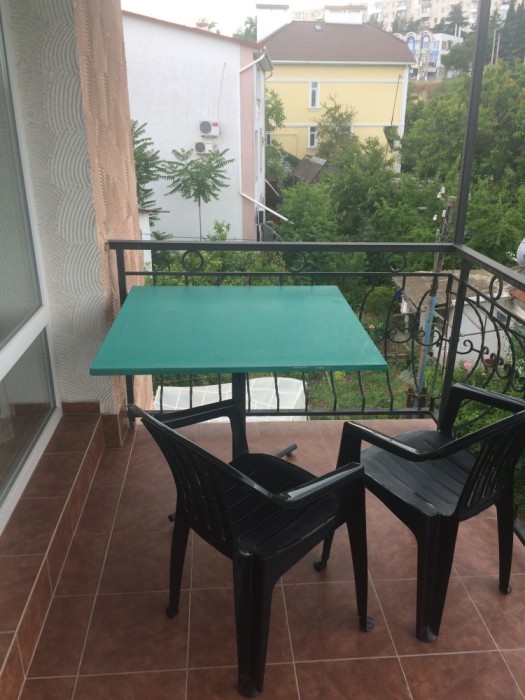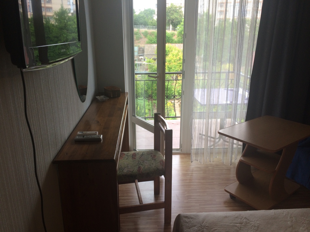 Номер комфорт плюс с балконом и санузлом. Номер 20 кв.м., евроремонт, светлый, просторный. На балконе есть столик со стульчиками. В номере интернет, телевизор, спутниковое тв, шкаф, двухспальная кровать. Кухня общая на 3 номера.