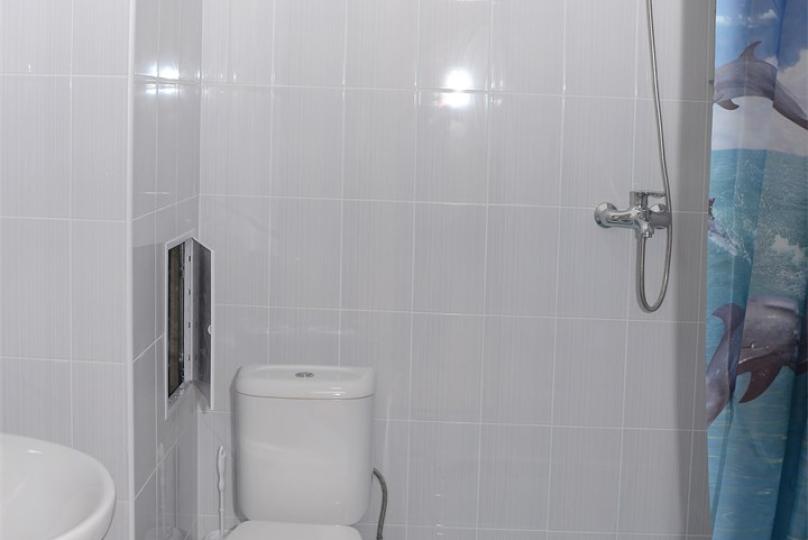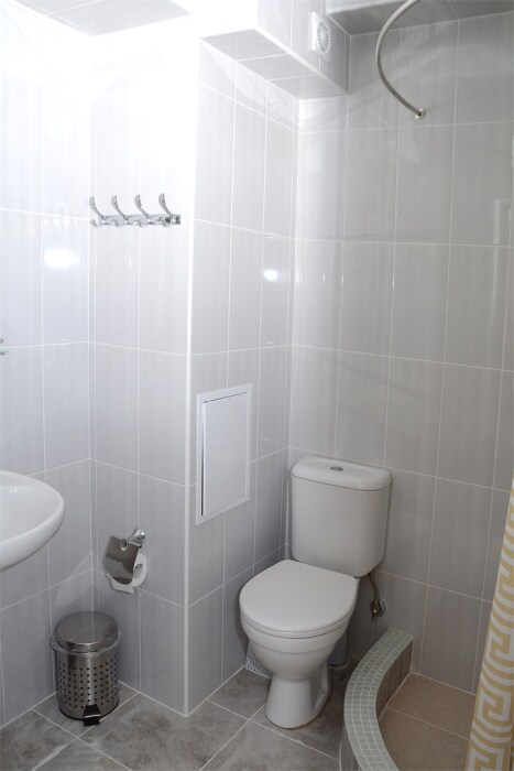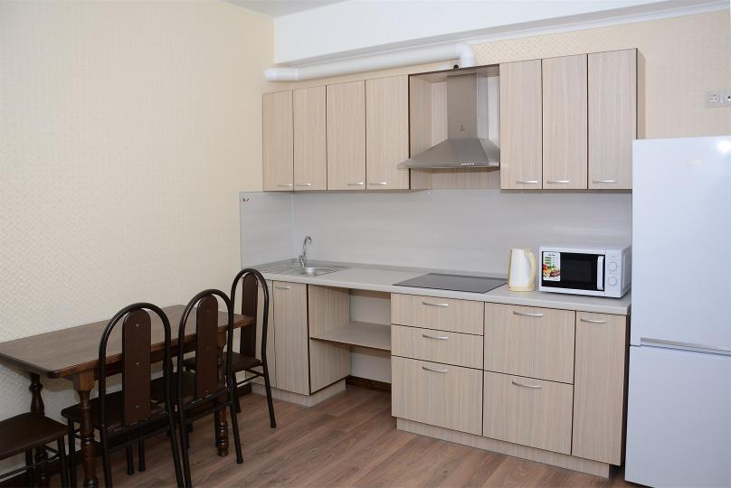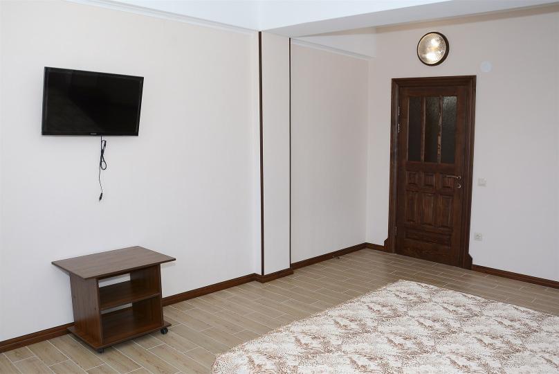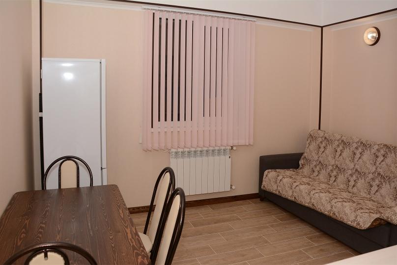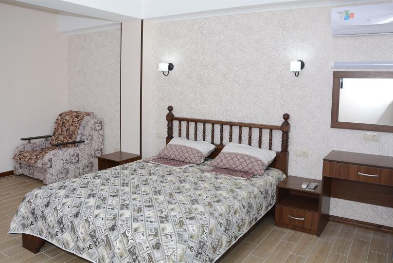 Комфортабельные однокомнатные апартаменты студия. Оснащение: 1 двуспальная кровать, шкаф, вешалки для верхней одежды, зеркало, стол с 4 стульями, кондиционер, ТВ. Доп. место представлено раскладным диваном и раскладным креслом. Оборудованная кухня: плита, вытяжка, раковина, микроволновка, холодильник, набор посуды и столовых приборов. Ванная комната представлена с/у с душем.