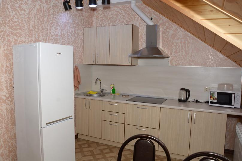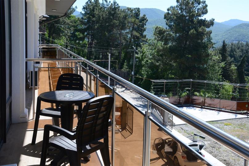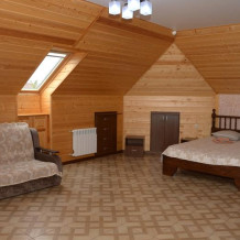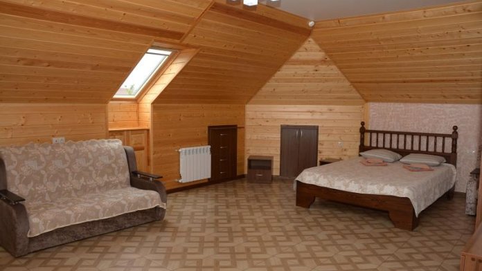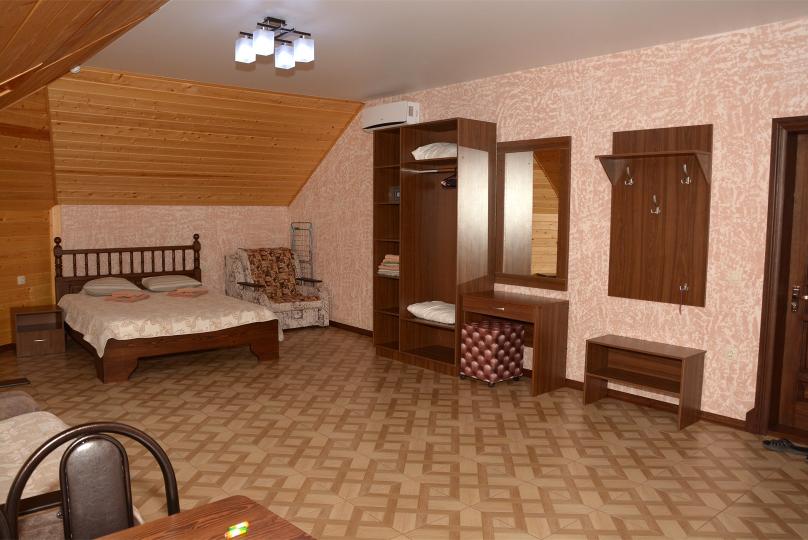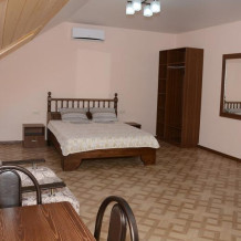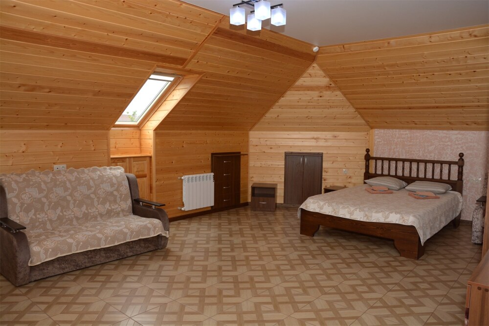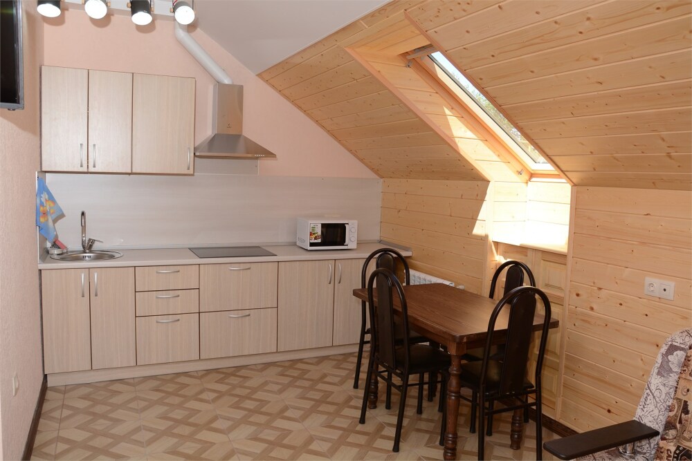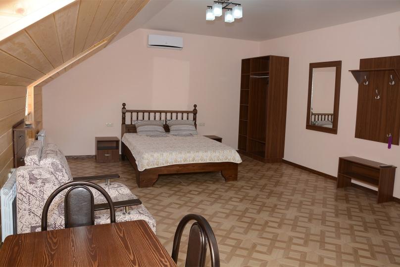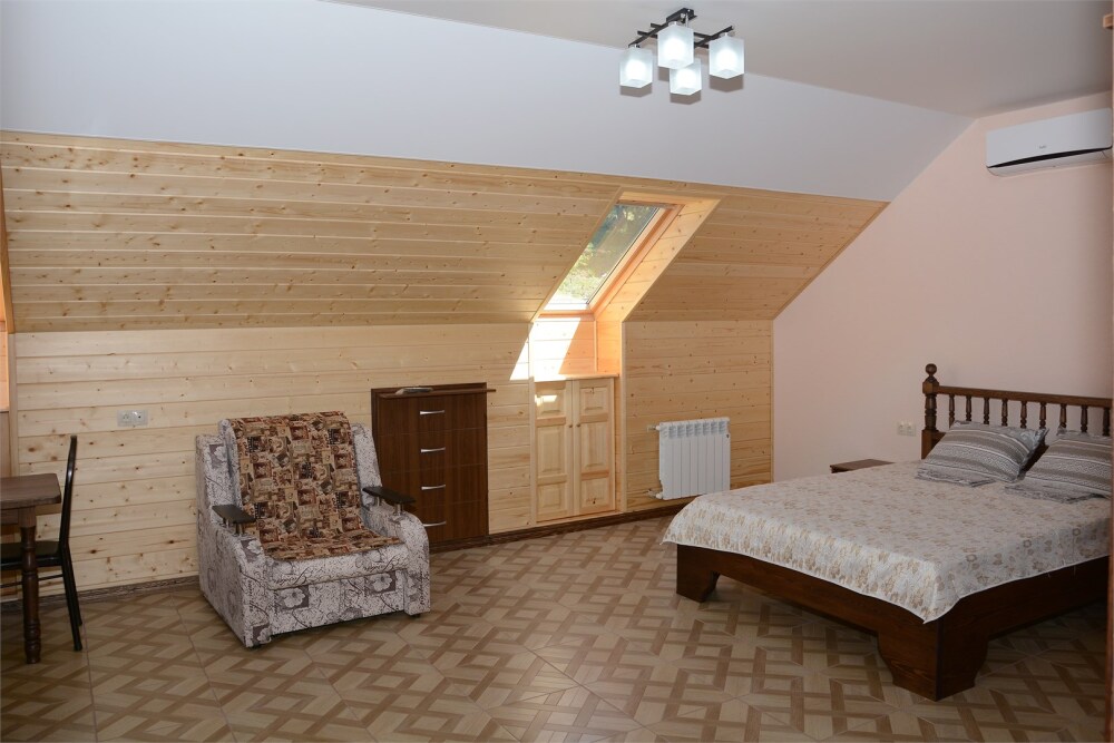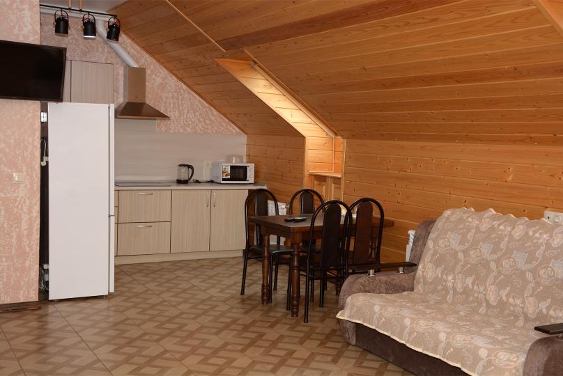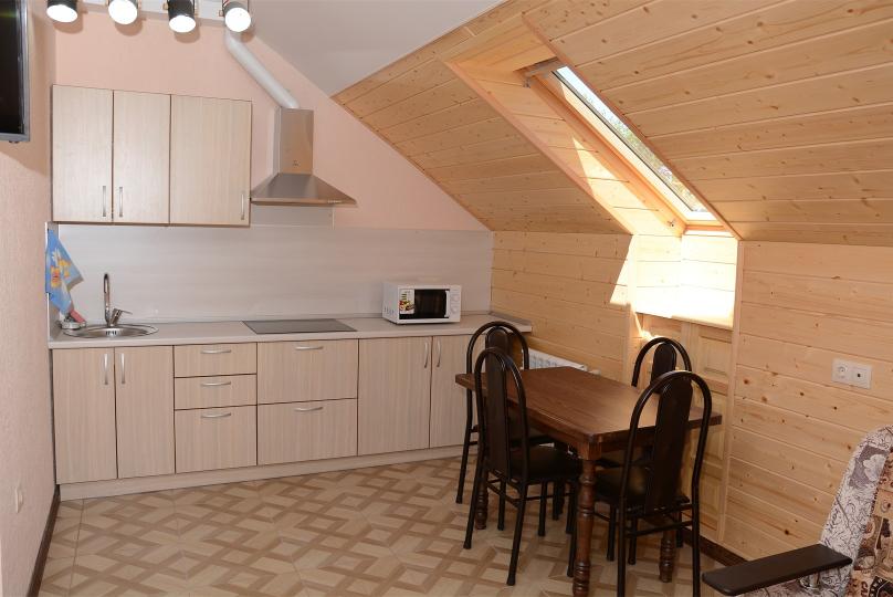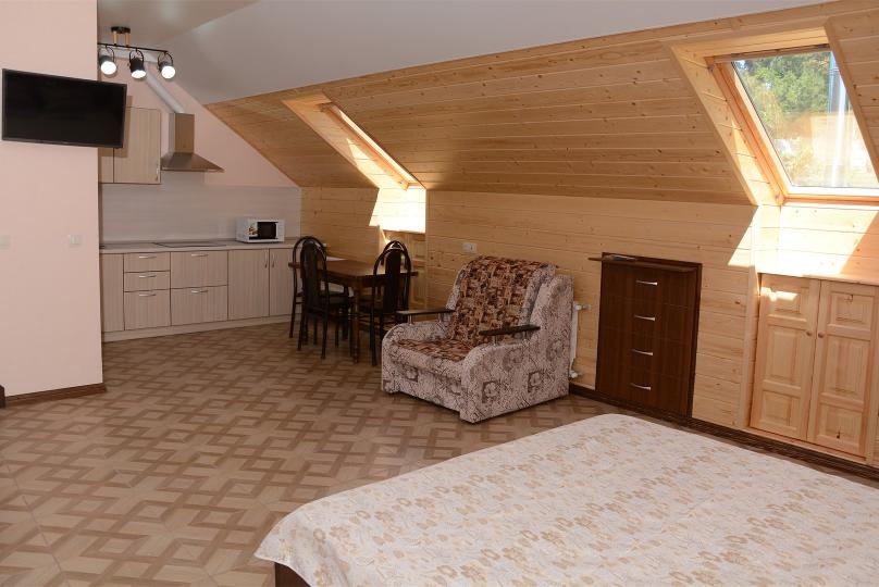 Комфортабельные двухкомнатные апартаменты. В спальне: 1 двуспальная кровать, 2 прикроватные тумбы, раскладное кресло, зеркало, журнальный столик, кондиционер, ТВ. В кухне-гостиной оборудованная кухонная зона (плита, вытяжка, раковина, микроволновка, холодильник, эл. чайник, набор посуды и столовых приборов) и обеденная зона (стол и 4 стула), раскладной диван. Ванная комната представлена с/у с душем. 1 апартаменты из данной категории расположен на мансарде.