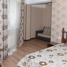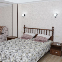 Комфортабельные двухкомнатные апартаменты с балконом. В спальне: 1 двуспальная кровать, прикроватные тумбы, зеркало, журнальный столик, кондиционер, ТВ. В кухне-гостиной оборудованная кухонная зона (плита, вытяжка, раковина, микроволновка, холодильник, эл. чайник, набор посуды и столовых приборов) и обеденная зона (стол и 4 стула). Доп. место может быть представлено раскладным диваном и раскладным креслом. Ванная комната представлена с/у с душем.