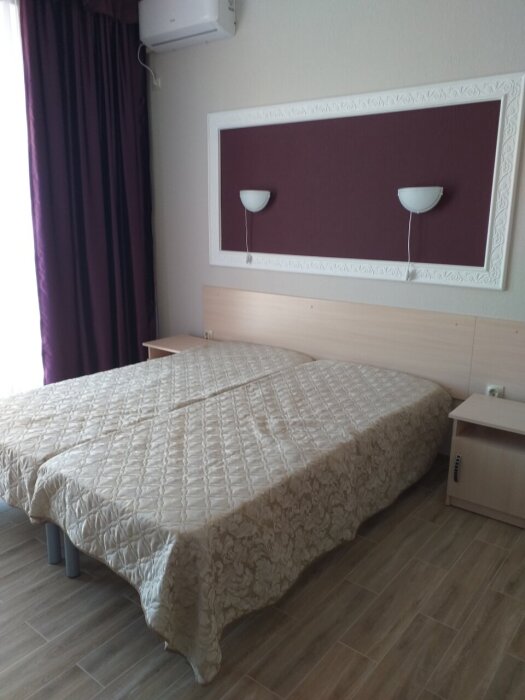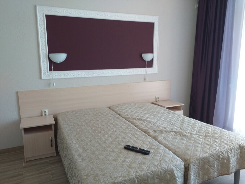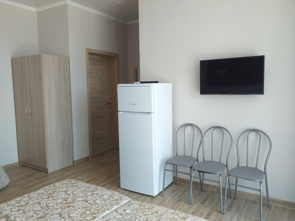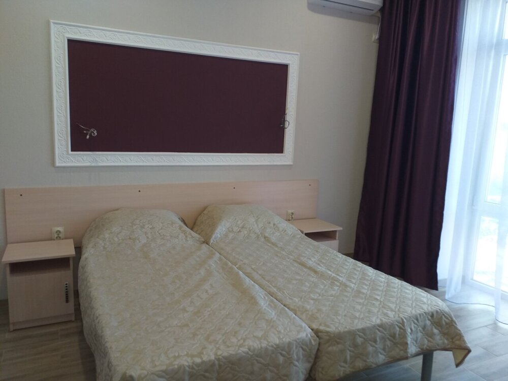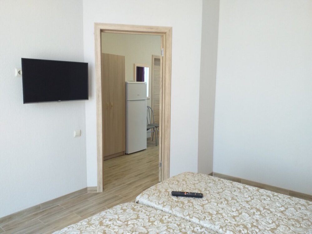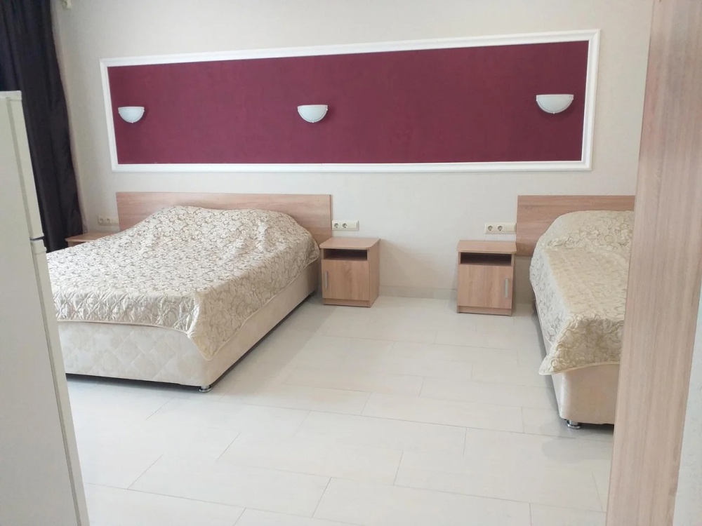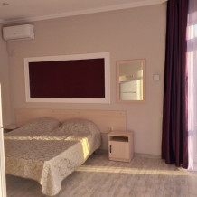 Большой семейный номер с двумя комнатами находится на 3 этаже. В номере два входа. Один основной с лестницы, второй из большой комнаты выходит на балкон с видом на море и во двор.