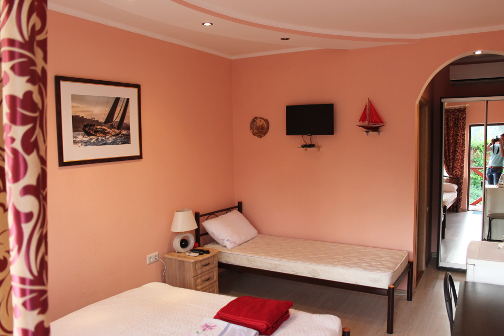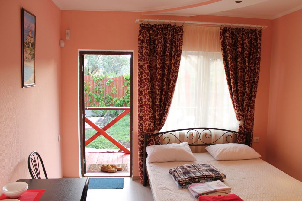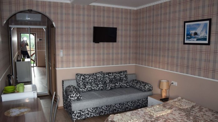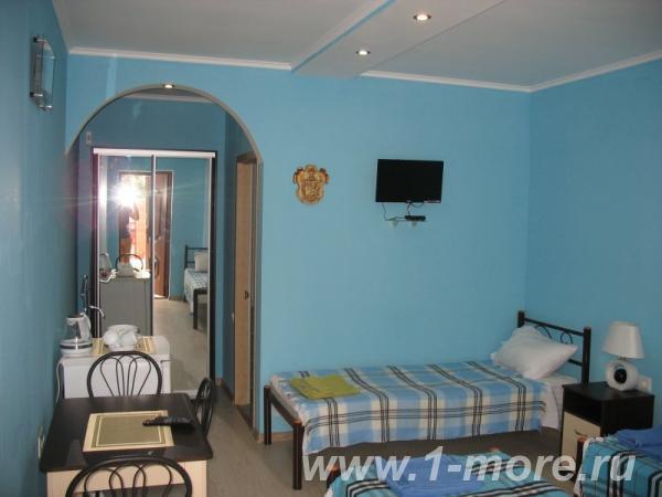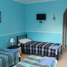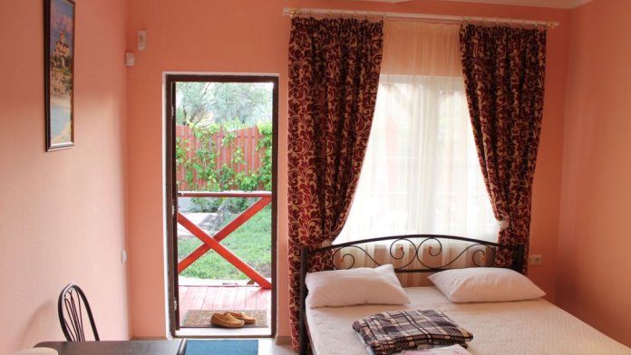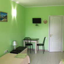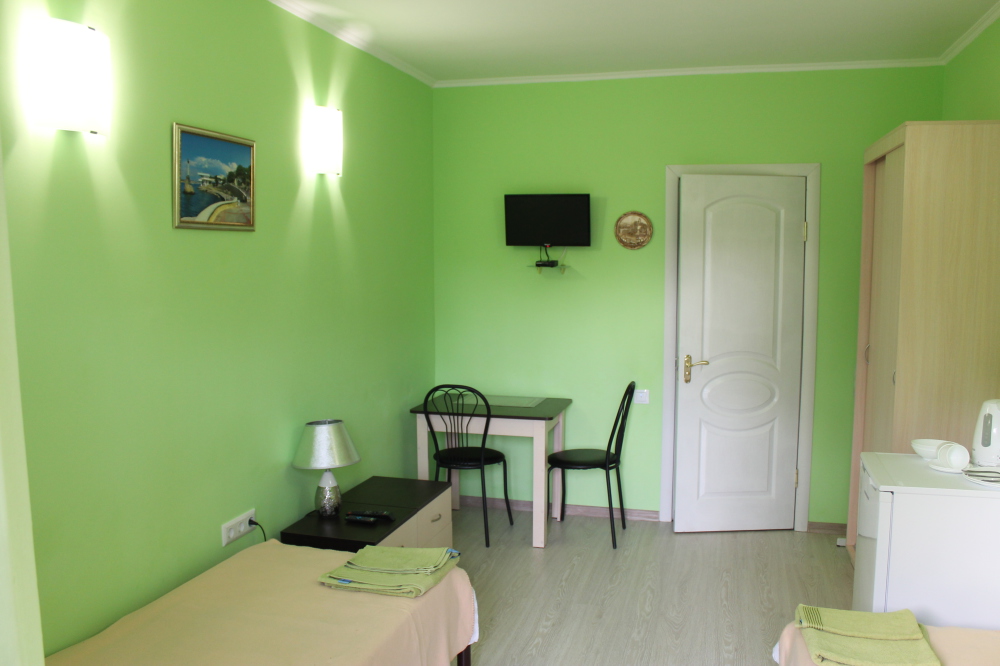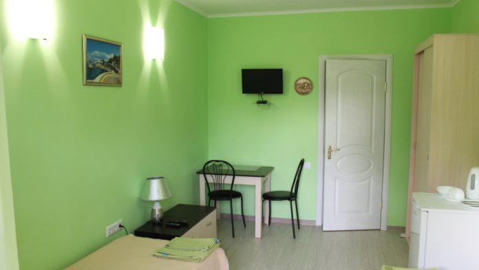 Уютные и комфортабельные 2-х, 3-х местные номера с возможностью установки дополнительного спального места. Каждый номер оснащен удобной мебелью, персональным набором посуды, холодильником, телевизором (с плоским экраном), кондиционером, спутниковым телевидением, бесплатным wi-fi, возможностью отдыха за столиком напротив своего номера либо в беседке. Наша мини-гостиница располагает вместительной общей кухней-столовой, оснащенной всем необходимым для приготовления пищи.