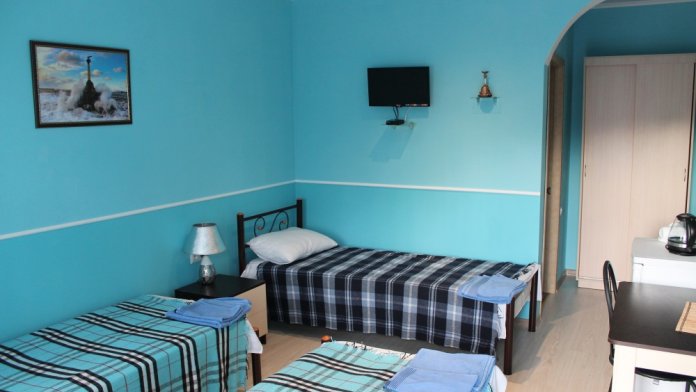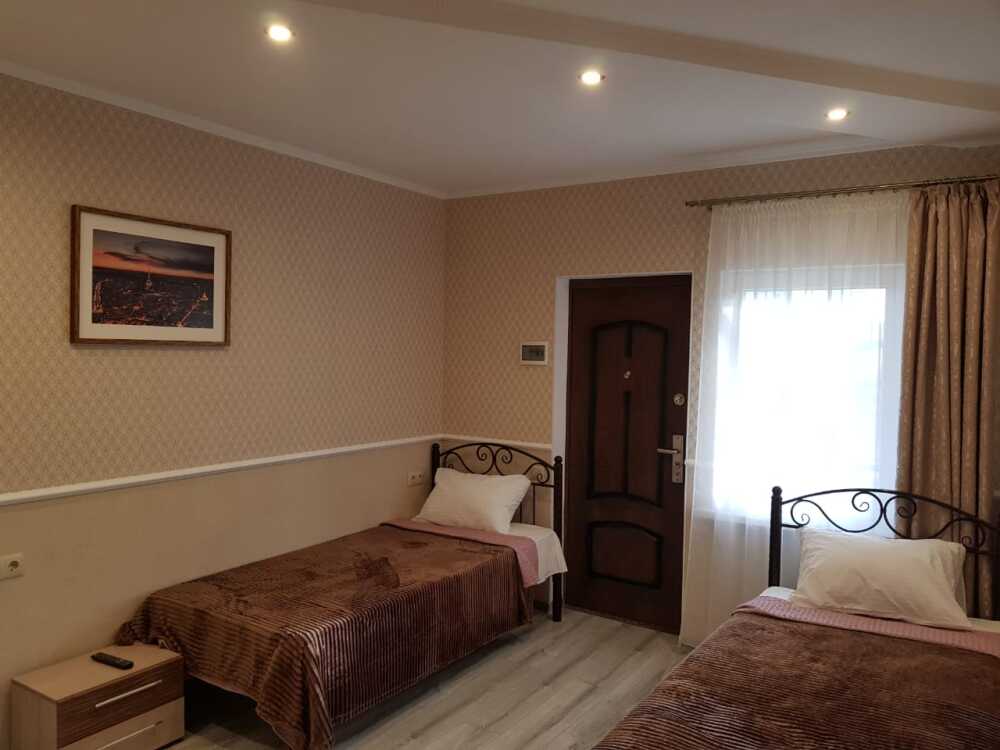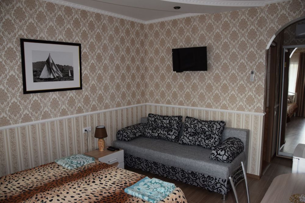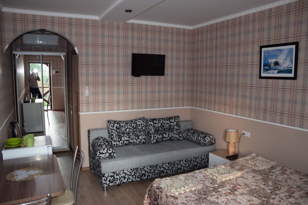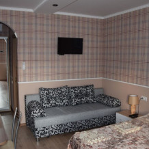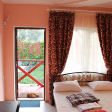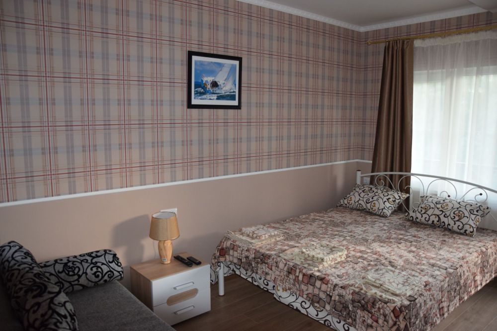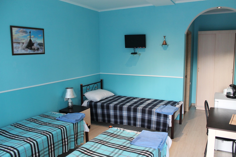 Уютные и комфортабельные 2-х, 3-х местные номера с возможностью установки дополнительного спального места. Каждый номер оснащен удобной мебелью, персональным набором посуды, холодильником, телевизором (с плоским экраном), кондиционером, спутниковым телевидением, бесплатным wi-fi, возможностью отдыха за столиком напротив своего номера либо в беседке. Наша мини-гостиница располагает вместительной общей кухней-столовой, оснащенной всем необходимым для приготовления пищи.