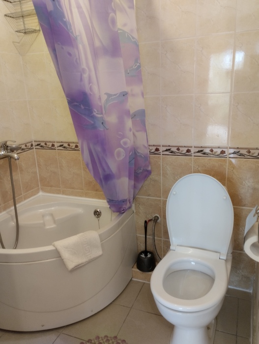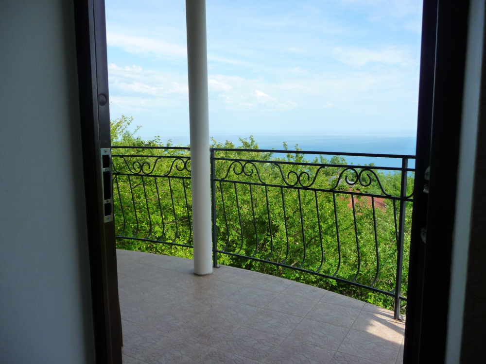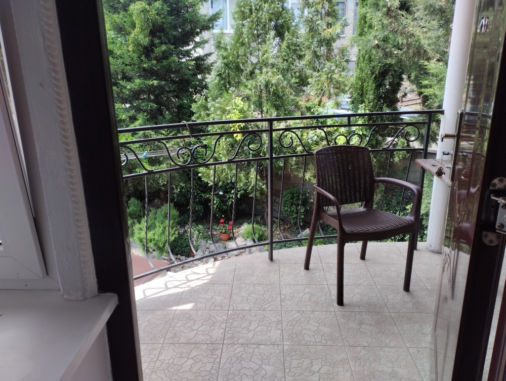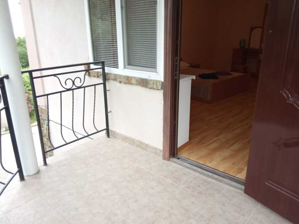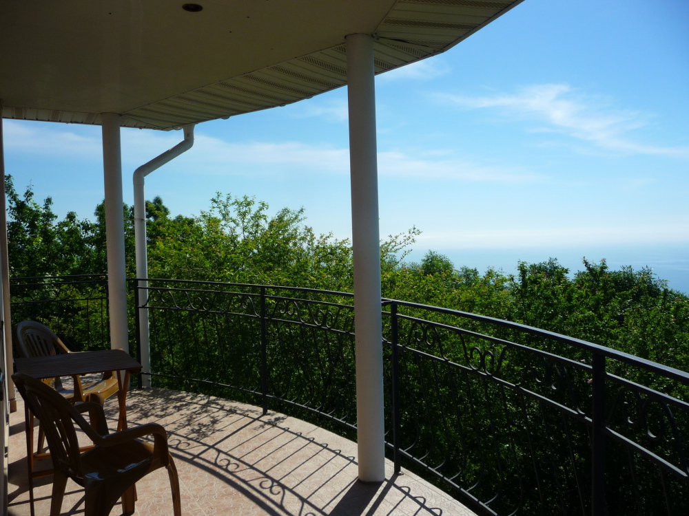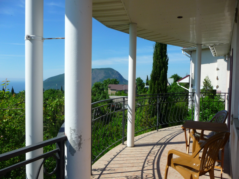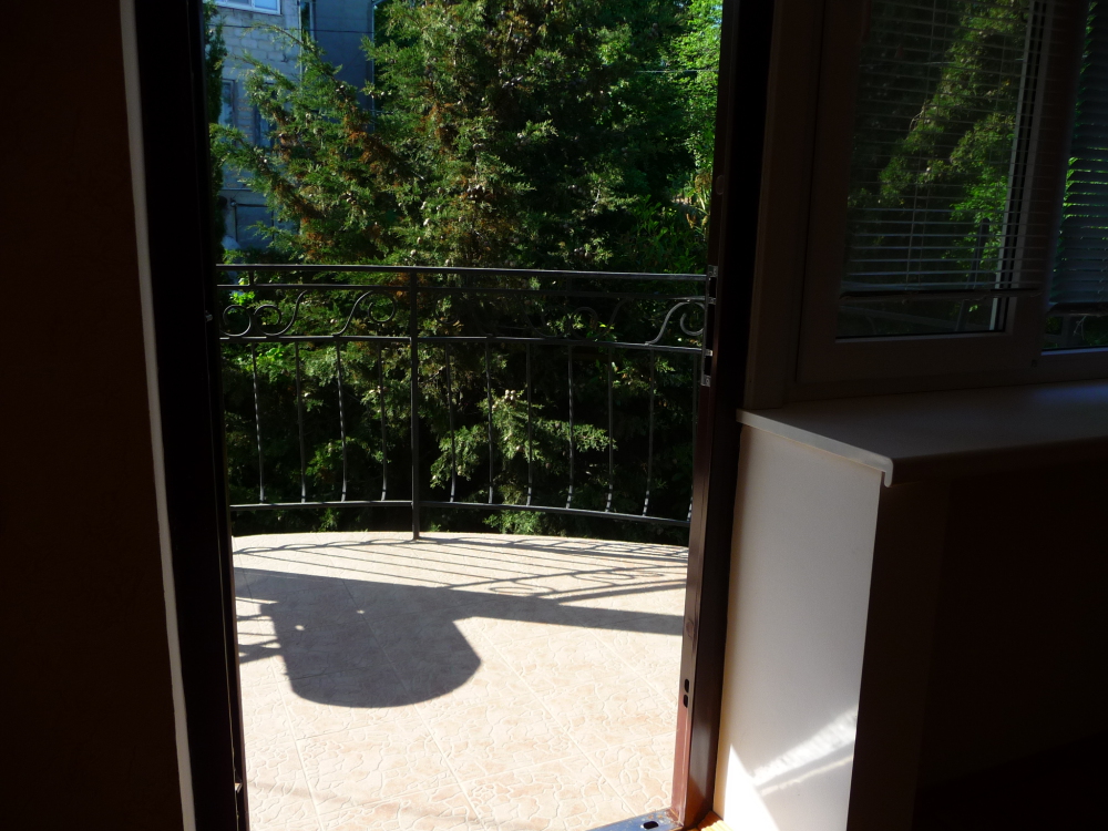 Просторный трехместный номер расположен на втором этаже. В номере свой санузел с душевой кабиной, удобная двуспальная кровать, шкаф, туалетный столик с зеркалом, комод. В номере есть также полуторная кровать. Большой красивый балкон выходит во внутренний дворик, весь в зелени. Кипарисы, сосны, кедр, розы, розмарин насыщают воздух непередаваемым ароматом. С балкона также есть боковой вид на море!