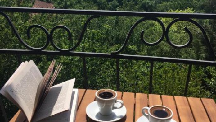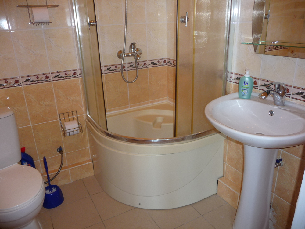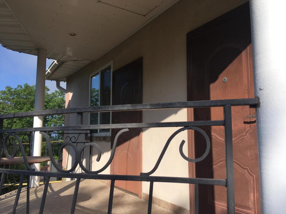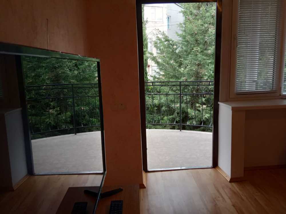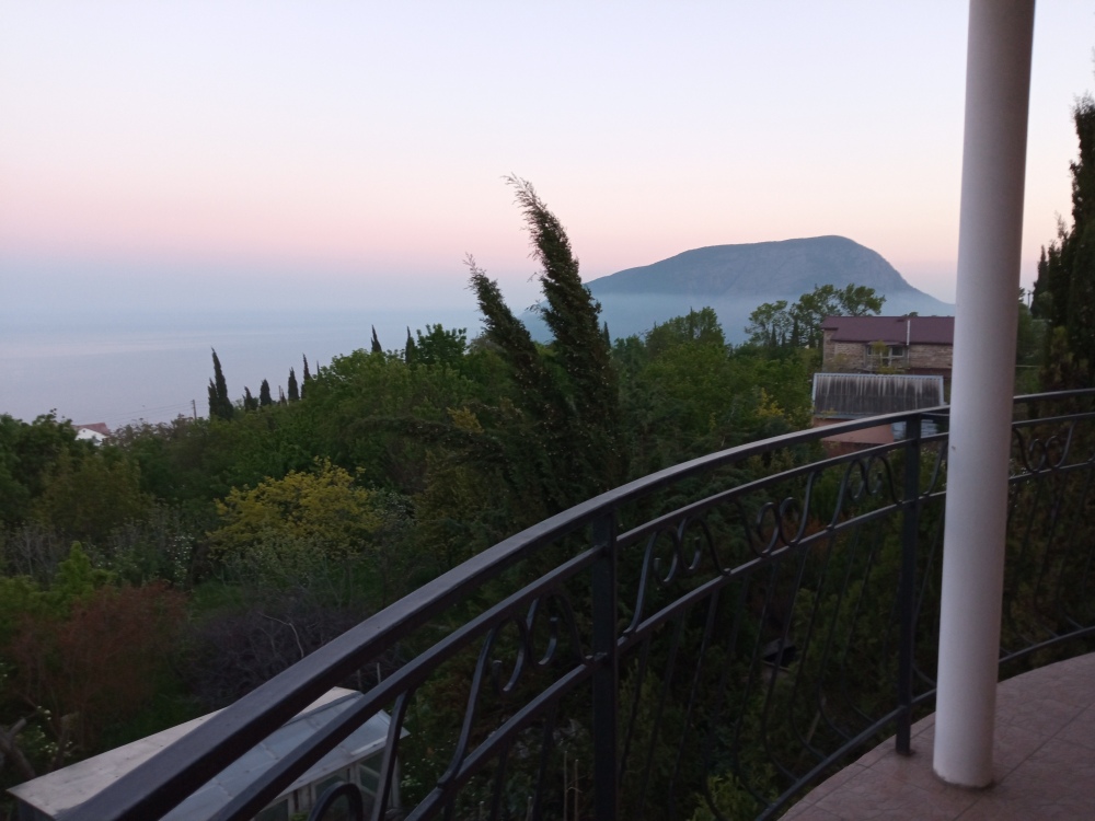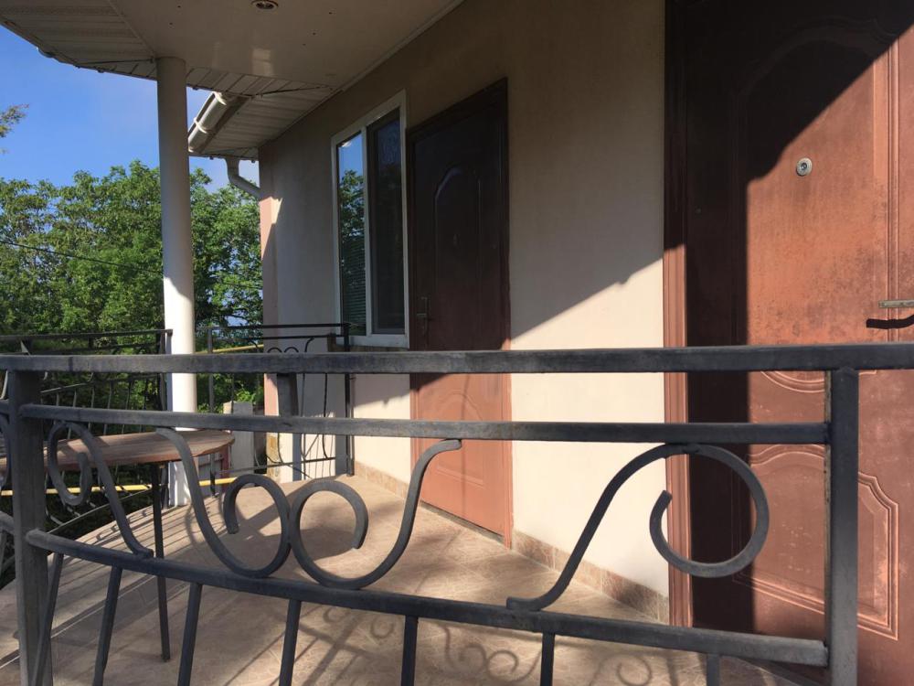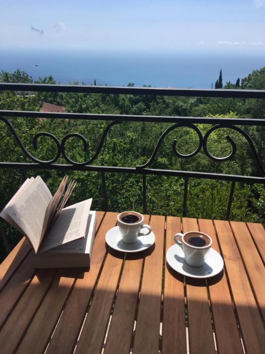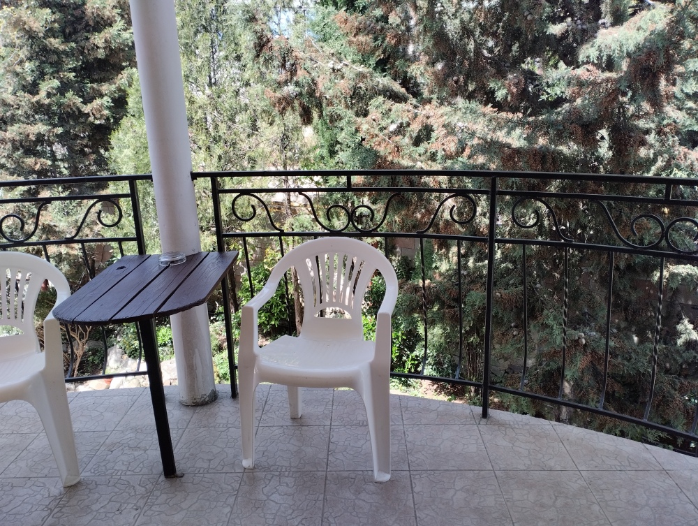 Просторный трехместный номер расположен на втором этаже. В номере свой санузел с душевой кабиной, удобная двуспальная кровать, шкаф, туалетный столик с зеркалом, комод. В номере есть также полуторная кровать. Большой красивый балкон выходит во внутренний дворик, весь в зелени. Кипарисы, сосны, кедр, розы, розмарин насыщают воздух непередаваемым ароматом. С балкона также есть боковой вид на море!