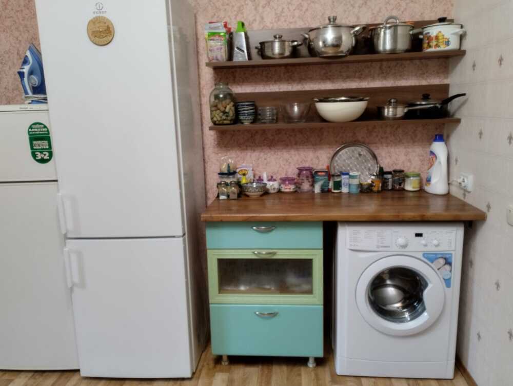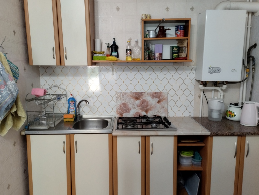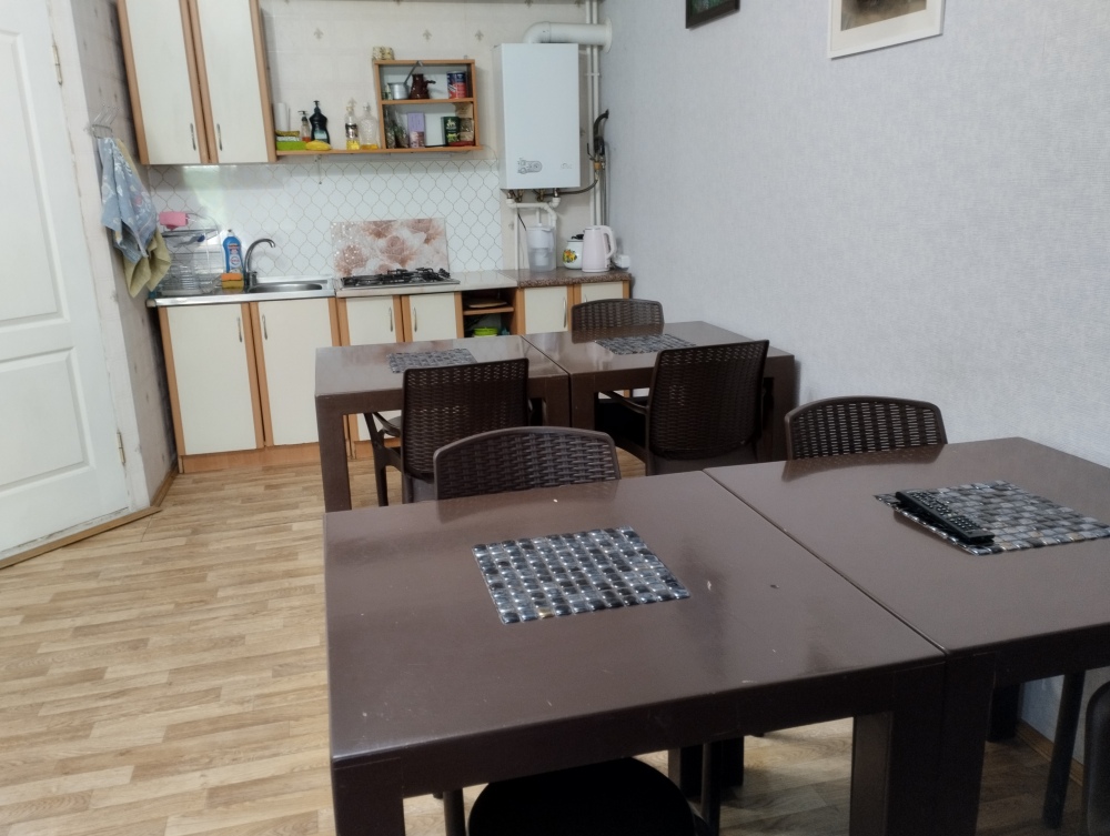 Оборудована общая кухня для приготовления еды: набор посуды, чайник, холодильник, микроволновка. Горячая и холодная вода круглосуточно.