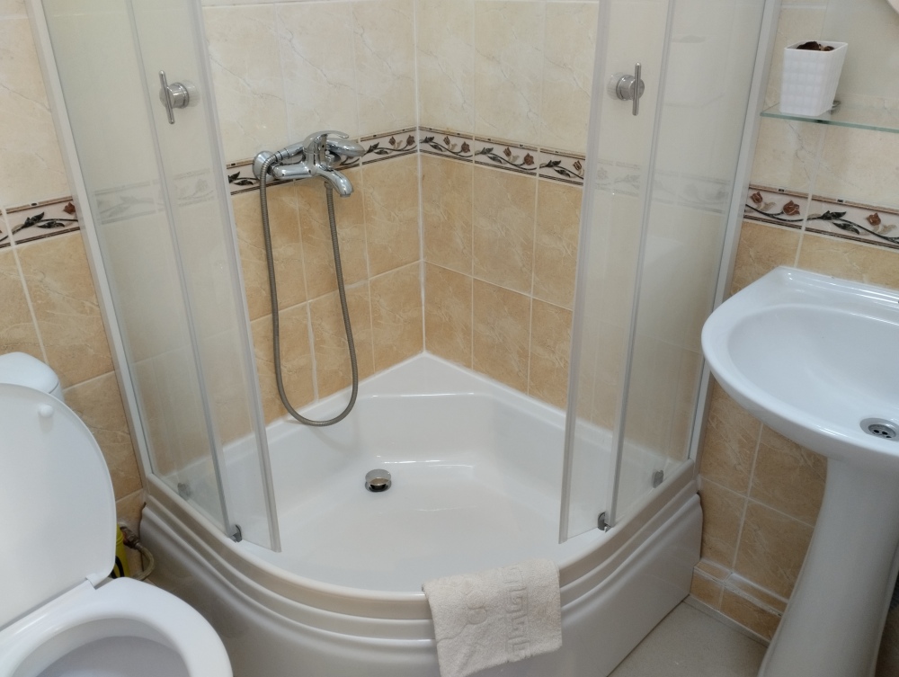 четырехместный номер расположен на первом этаже. В номере свой санузел с душевой кабиной, две двуспальные кровати, шкаф с зеркалом. Номер выходит во внутренний дворик, весь в зелени. Кипарисы, сосны, кедр, розы, розмарин насыщают воздух непередаваемым ароматом.