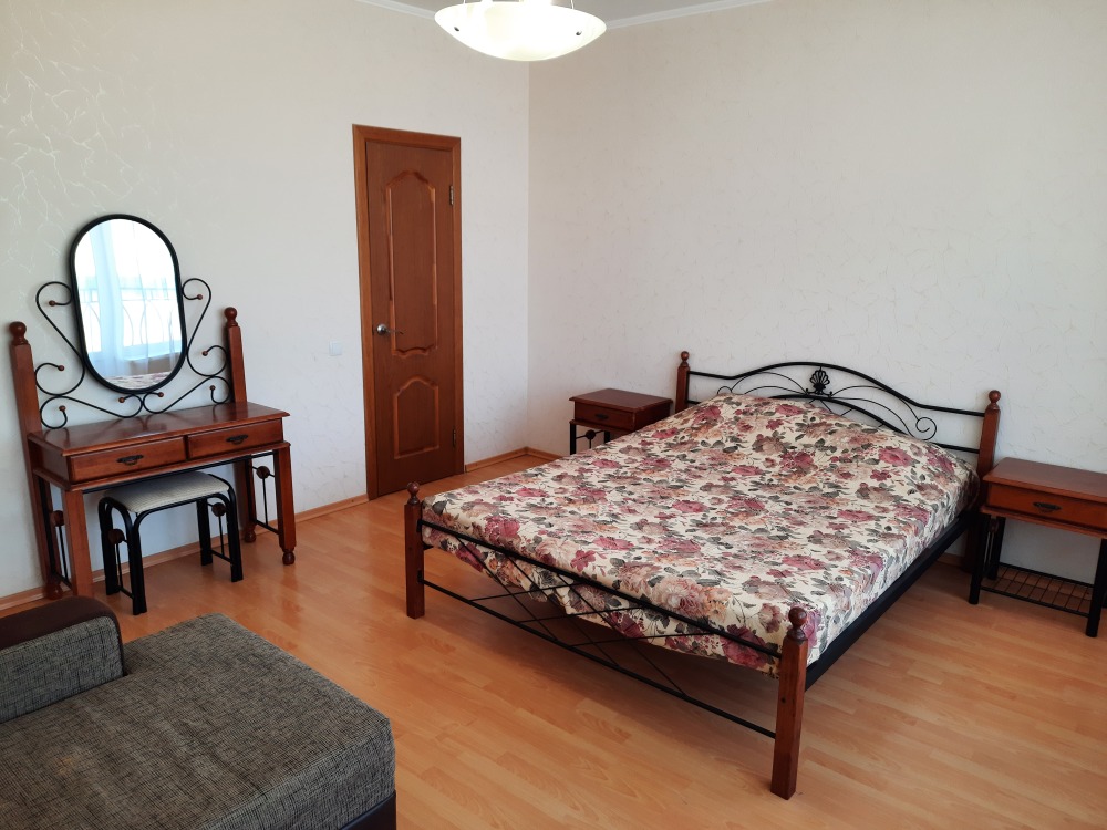 В спальне установлены двуспальная кровать, удобный диван и туалетный столик, выход на балкон.
