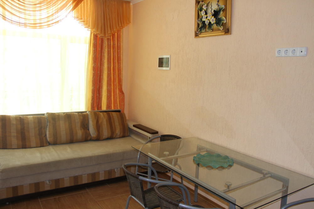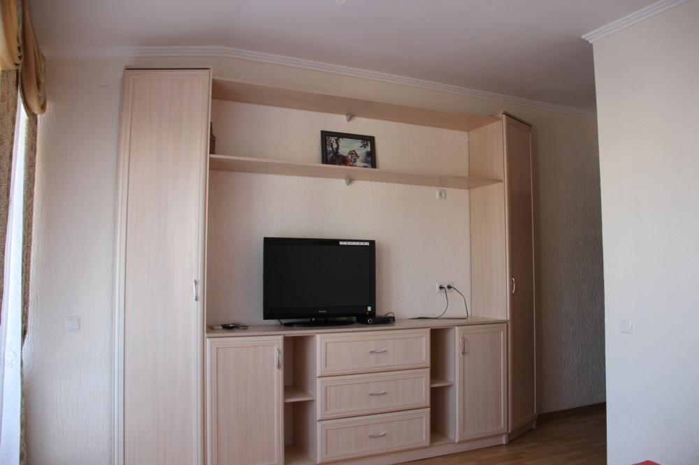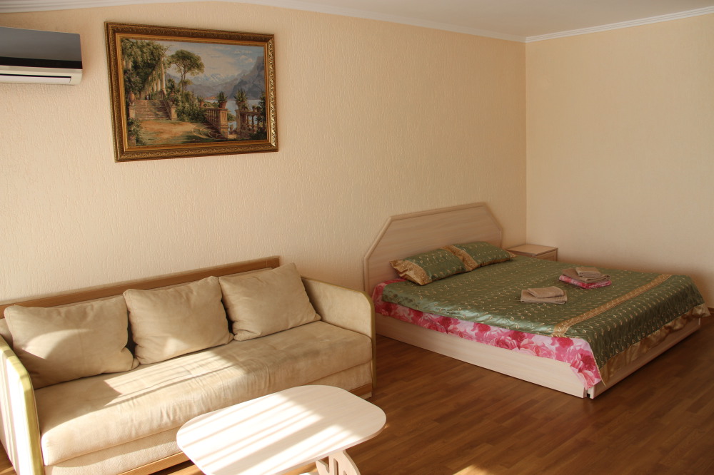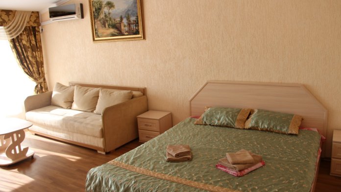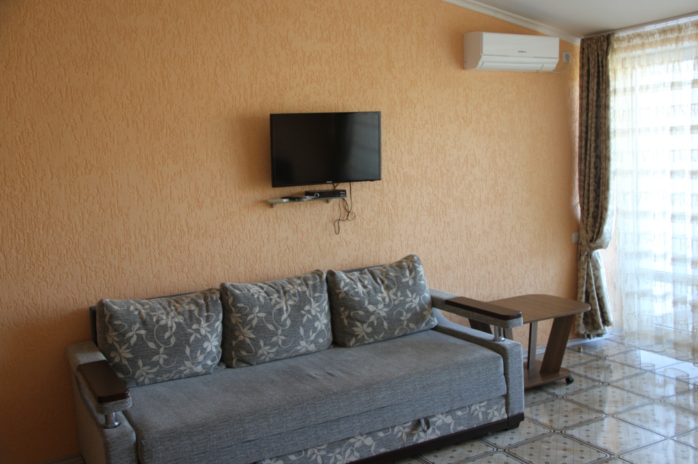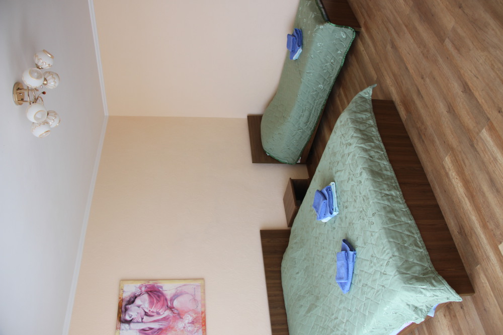 В номере: раскладной диван с прикроватными тумбочками. Шкаф-купе, журнальный столик.