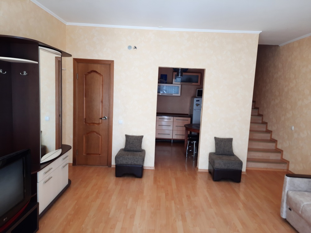На первом этаже: прихожая с удобным диваном, шкафом, телевизором, раскладным креслом. Кухня. Туалет с умывальником.