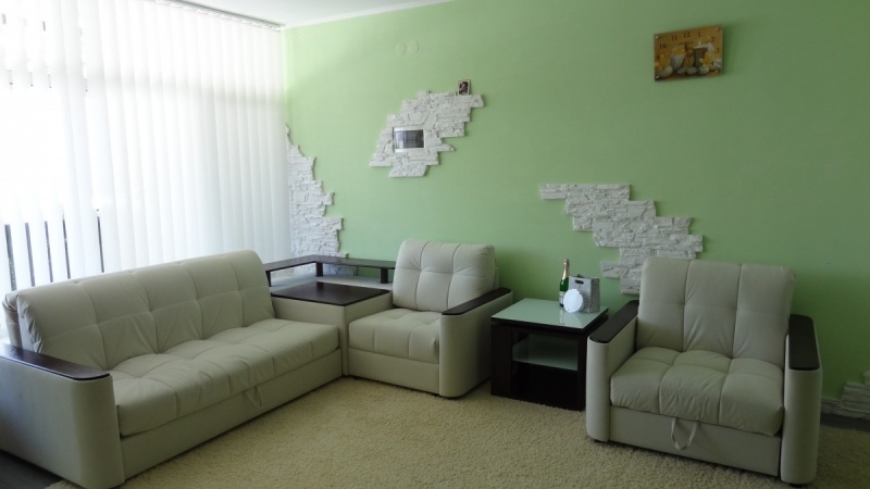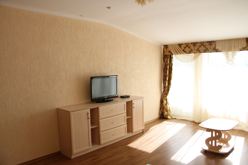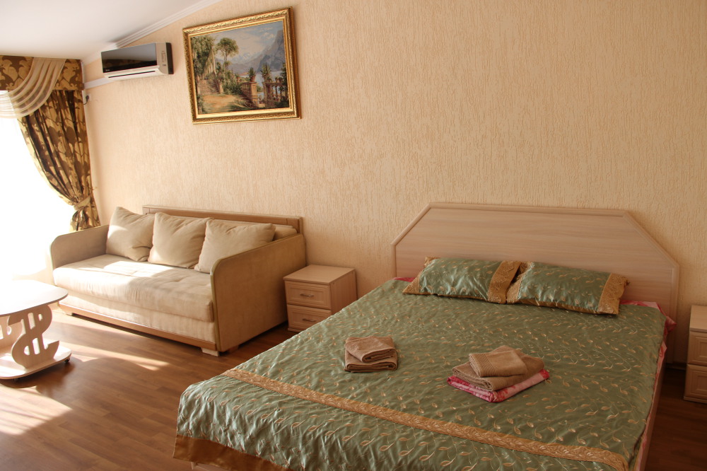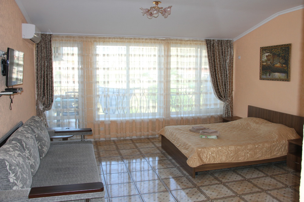 В номере: ЖК телевизором, кондиционер, утюг с гладильной доской, двуспальной кроватью с прикроватными тумбочками, столом, диван. Горячая и холодная вода круглосуточно.