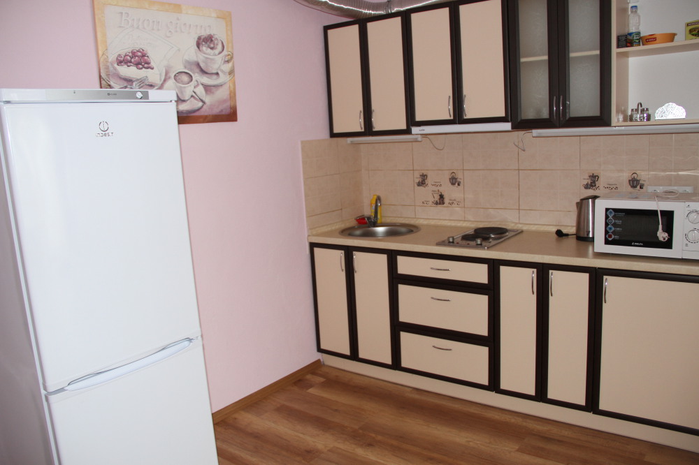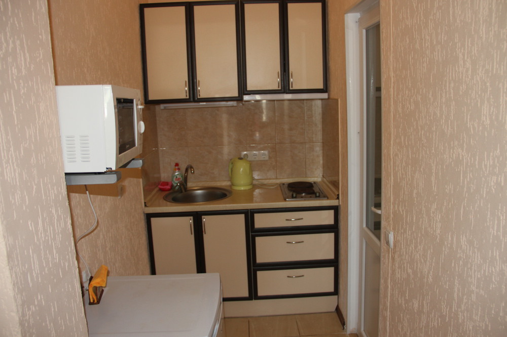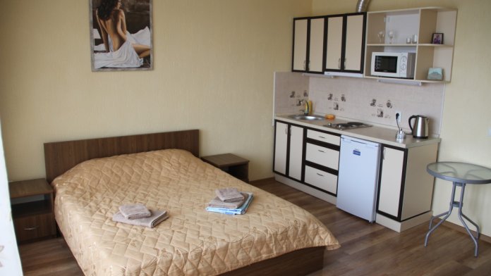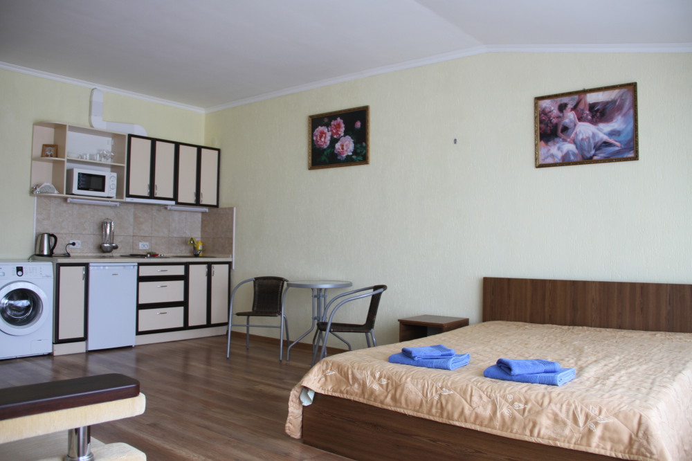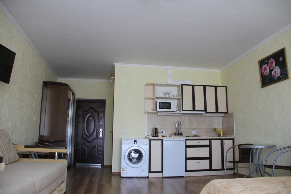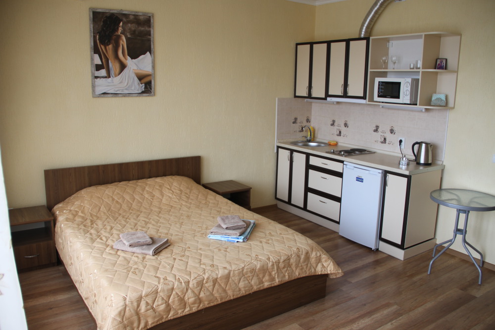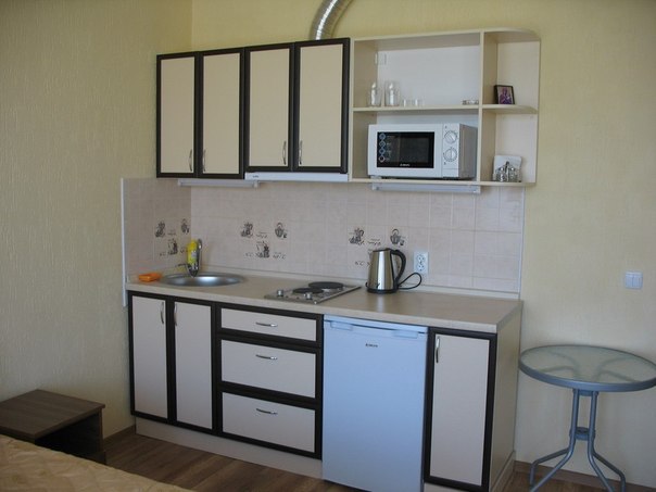 Отдельная кухня-студия оборудовано всем необходимым: электроплитой, микроволновкой, чайником, всем необходимым. Вместительный холодильник.