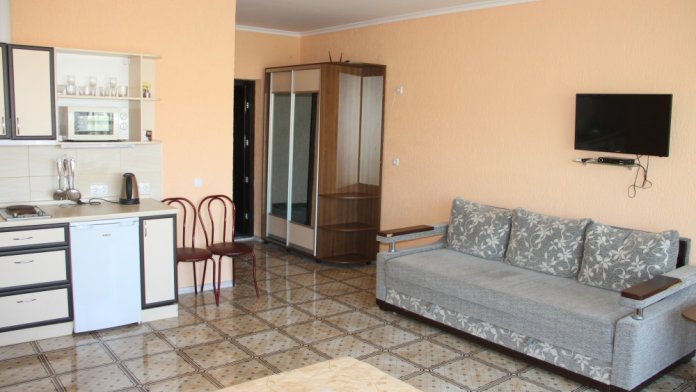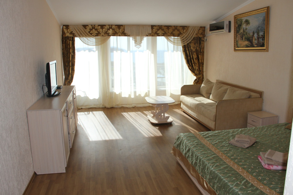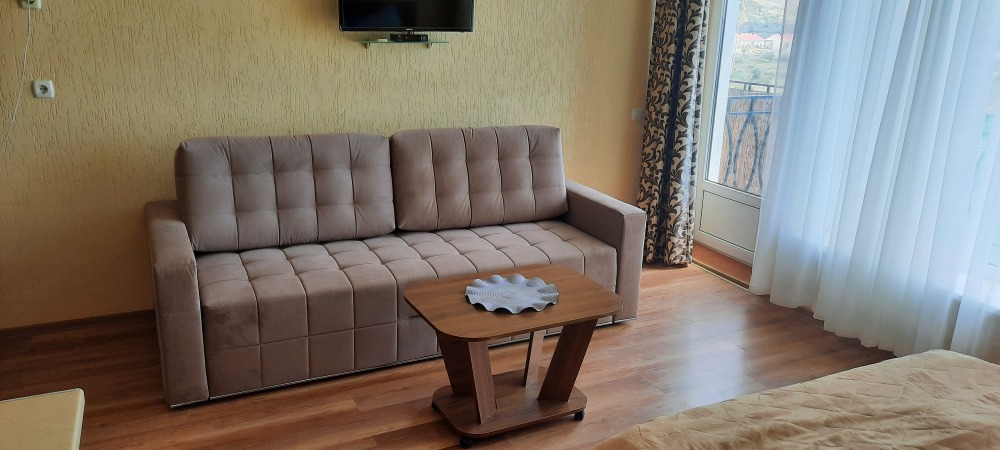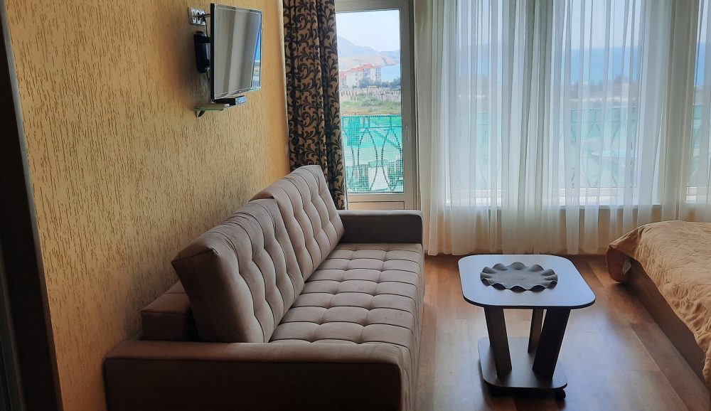 В номере плоский телевизор и кондиционер. Выход с номера на террасу с видом на море и мягким диваном, на котором можно отдыхать и пользоваться Wi-fi .