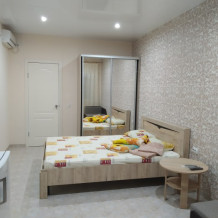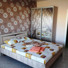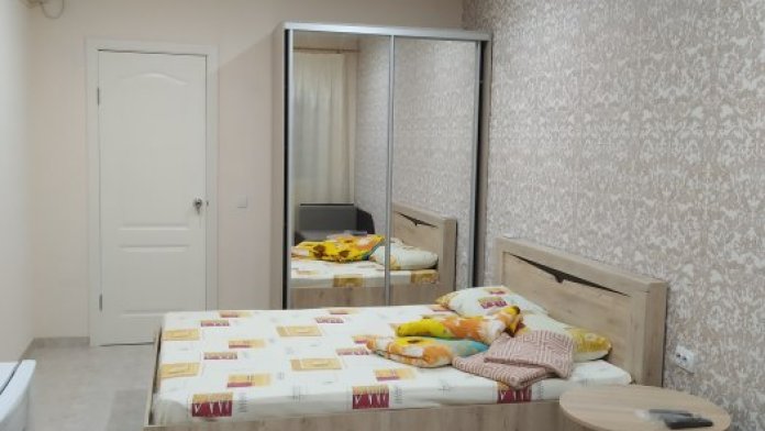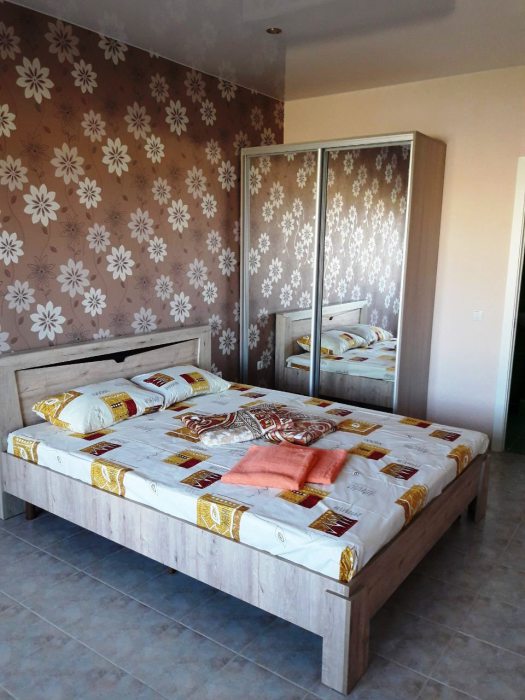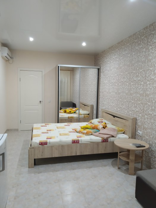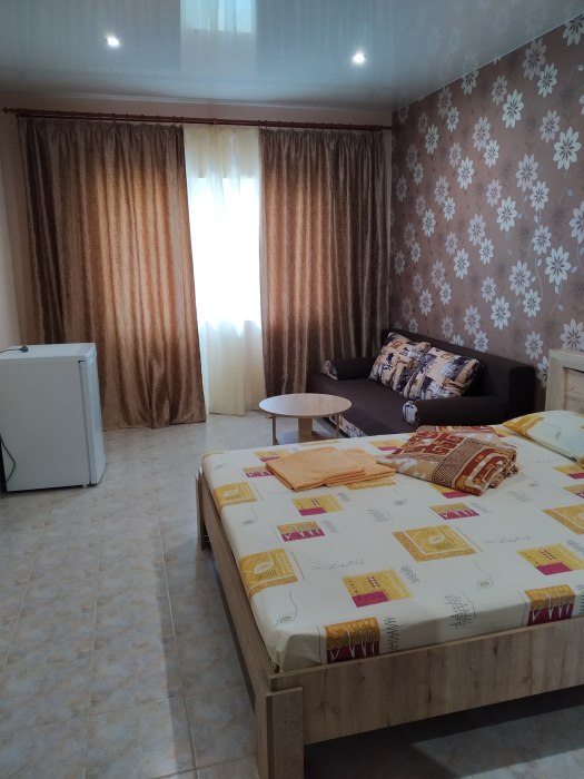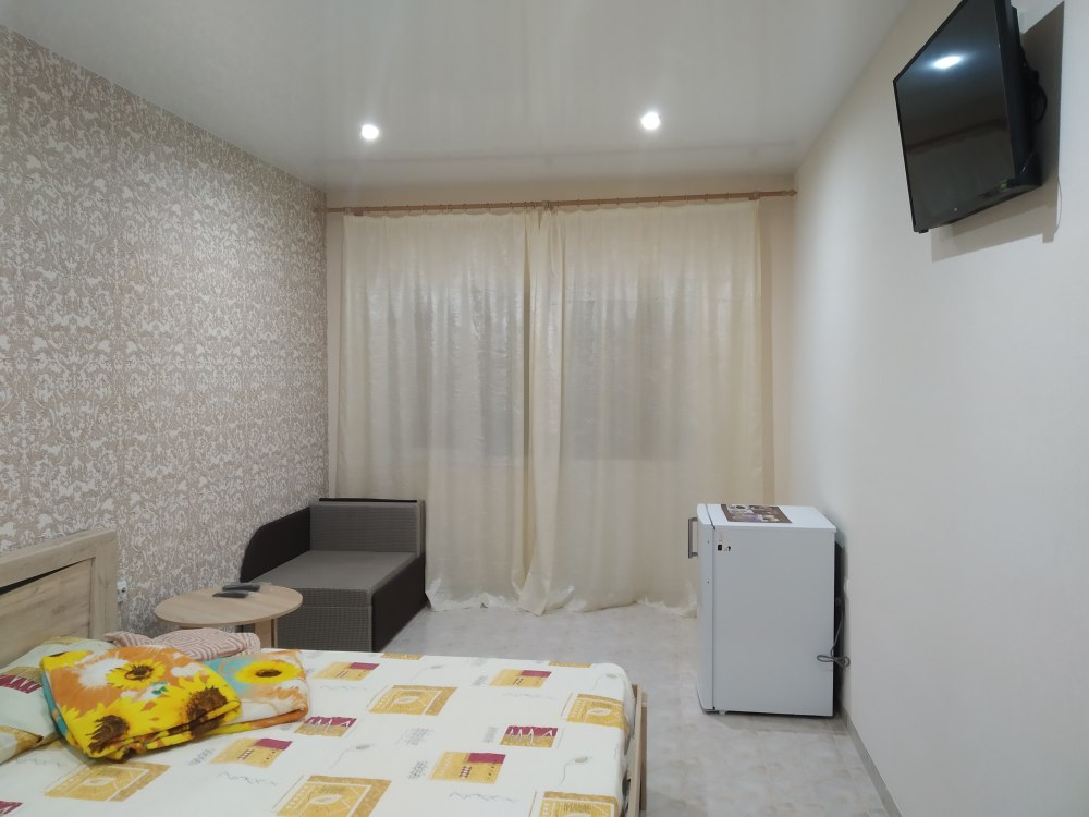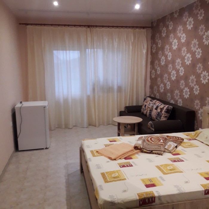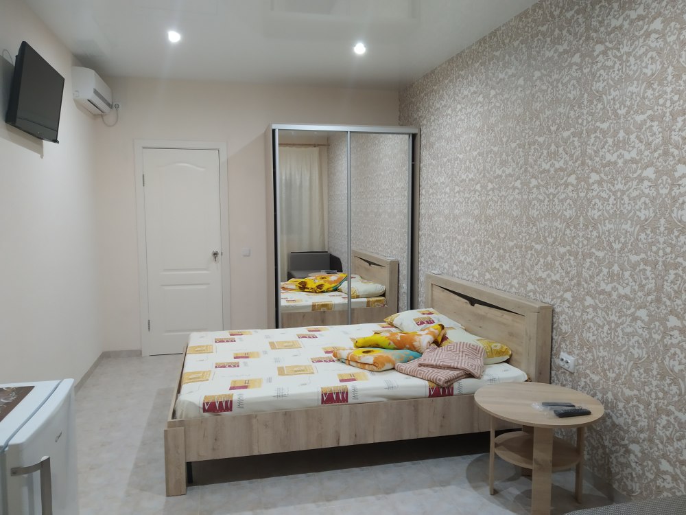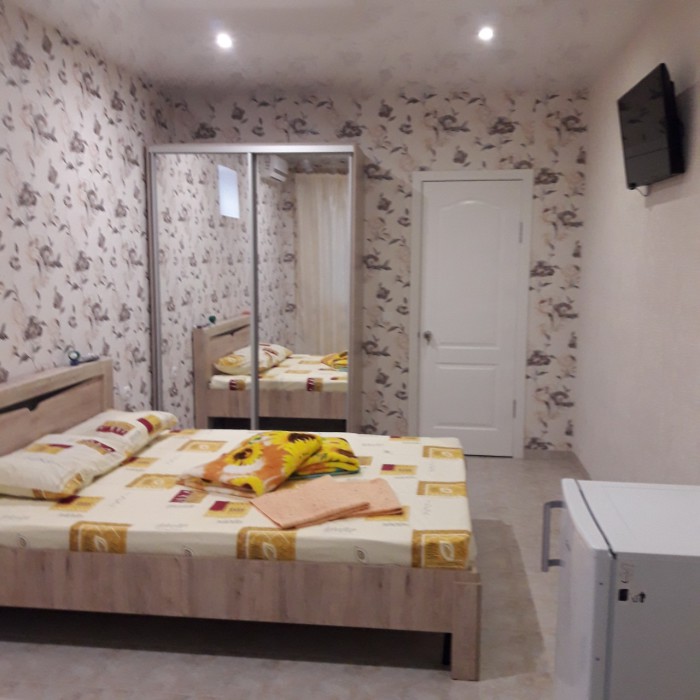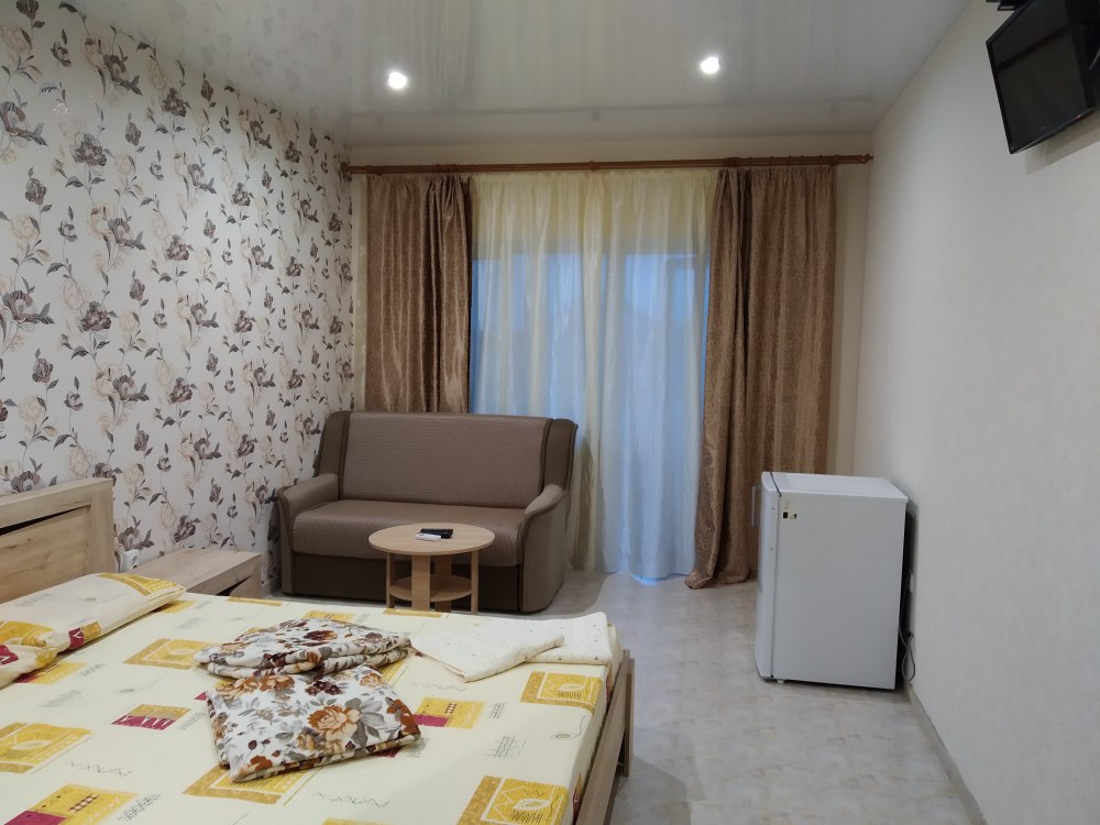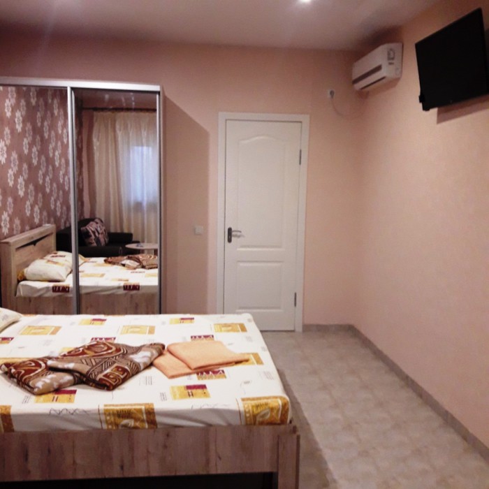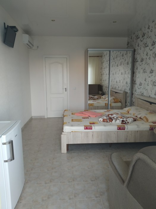 В номере двухспальная кровать с ортопедическим матрасом, диван-кровать, шкаф, холодильник, телевизор, кондиционер.