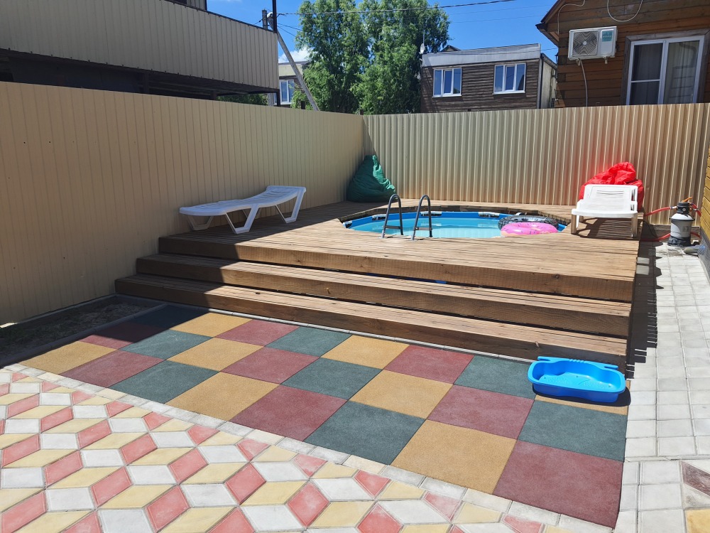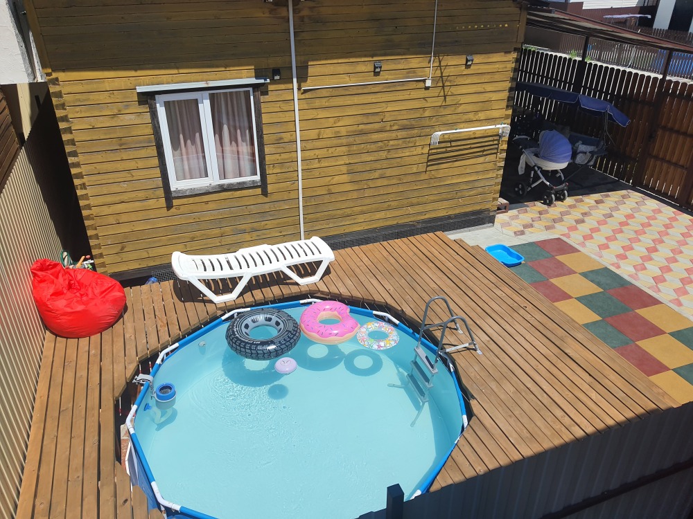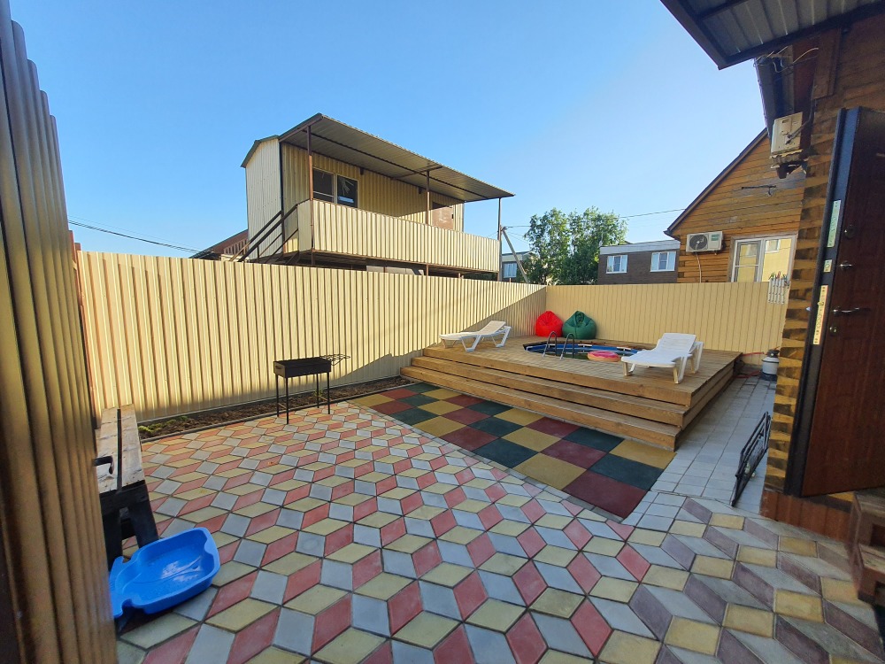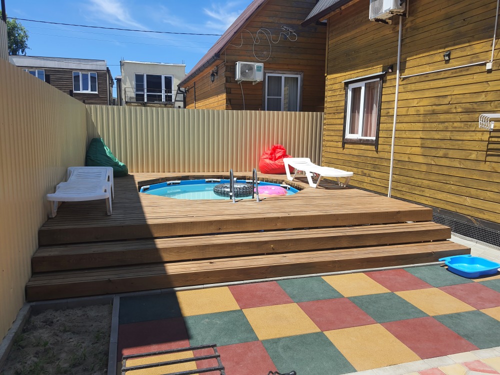 С собственным двориком. Песочница, мангал, качелька, шезлонги.