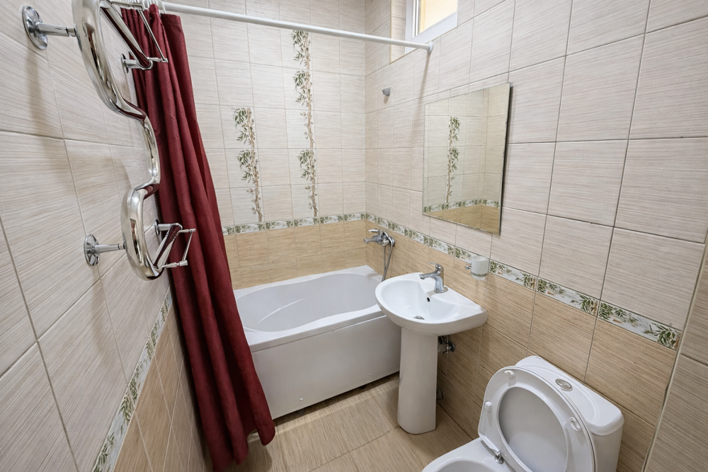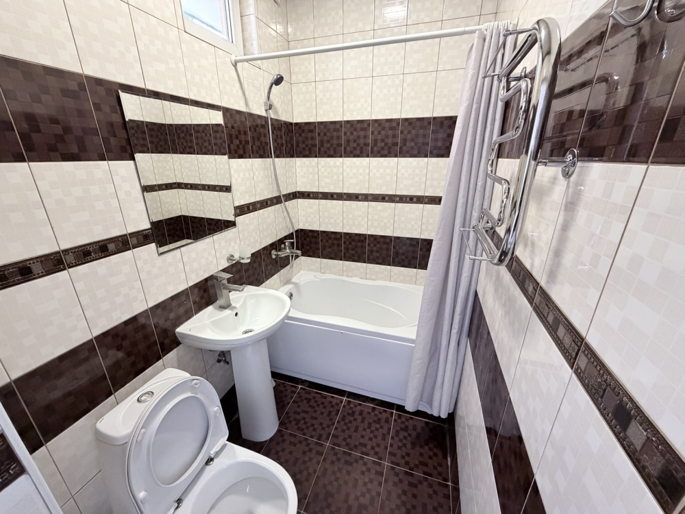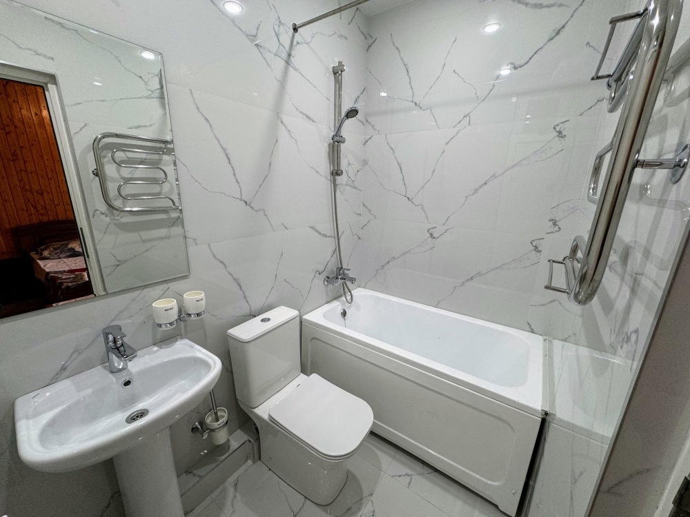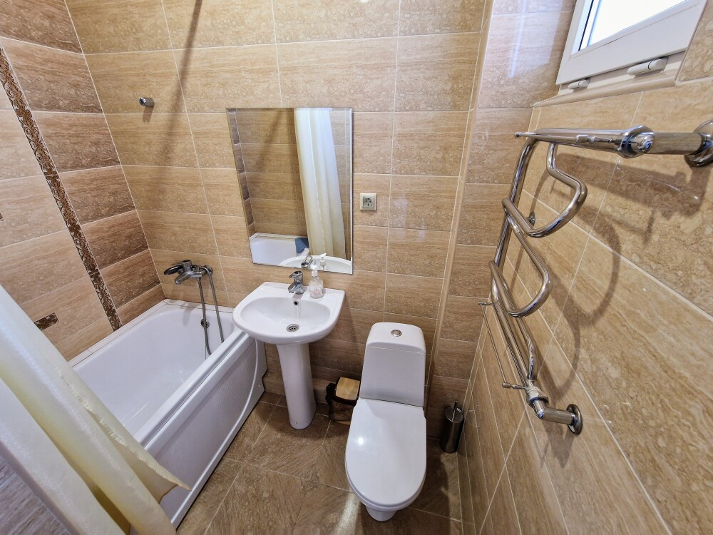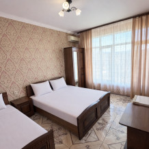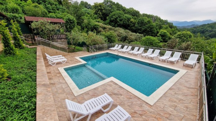 Просторные номера с хорошим ремонтом. В номерах есть: душ и туалет, ЖК телевизор (диагональ 81 см.), кондиционер (сплит-система), холодильник, чайник, фен, шкаф для вещей, стиральные принадлежности, отопление. Индивидуальный вход в каждый номер, собственный (не проходной) балкон с местом для отдыха (стол, кресла) с панорамным видом на горы и бассейн.