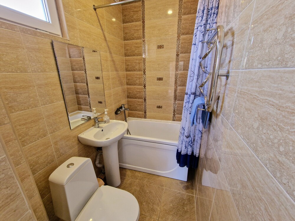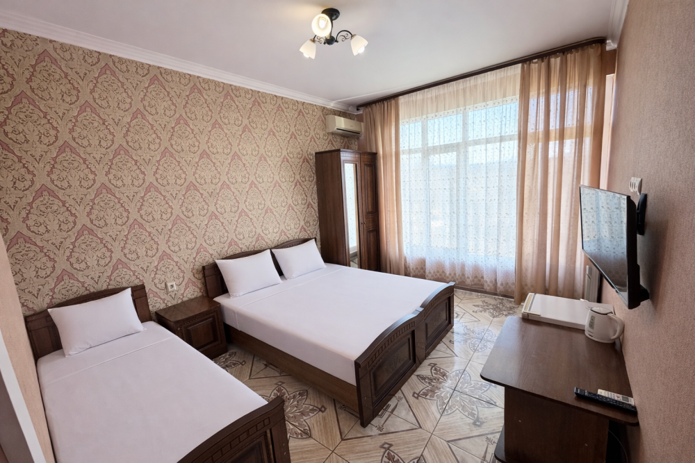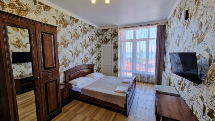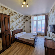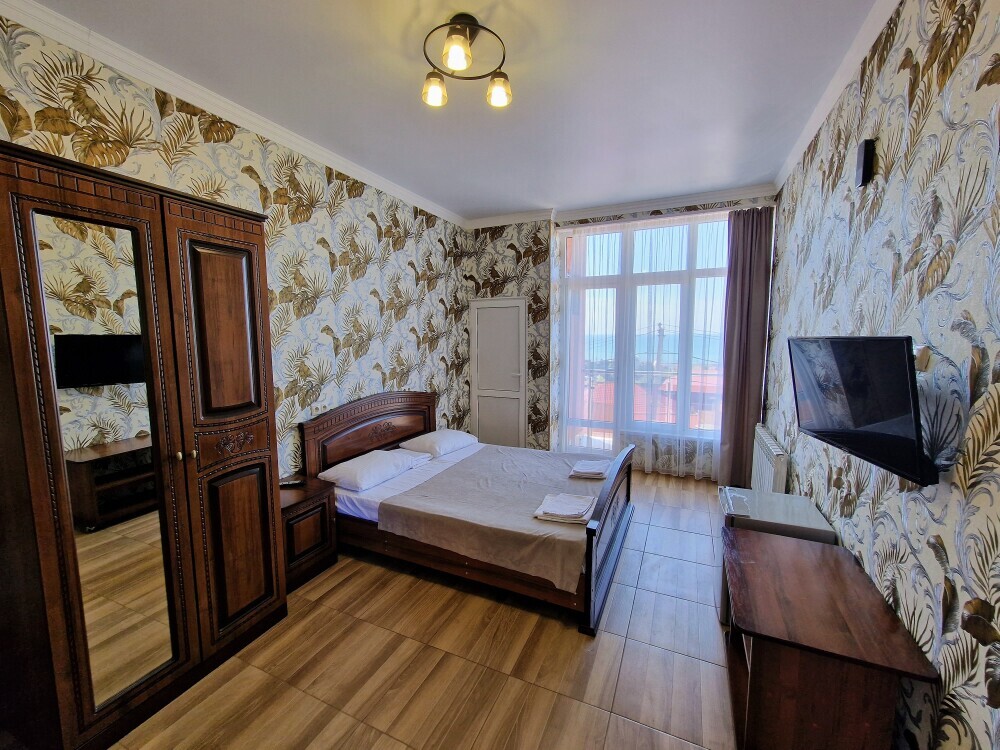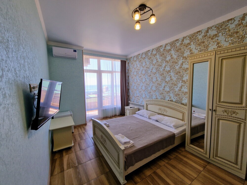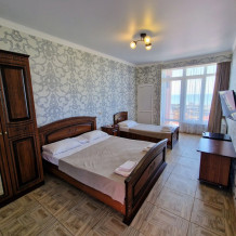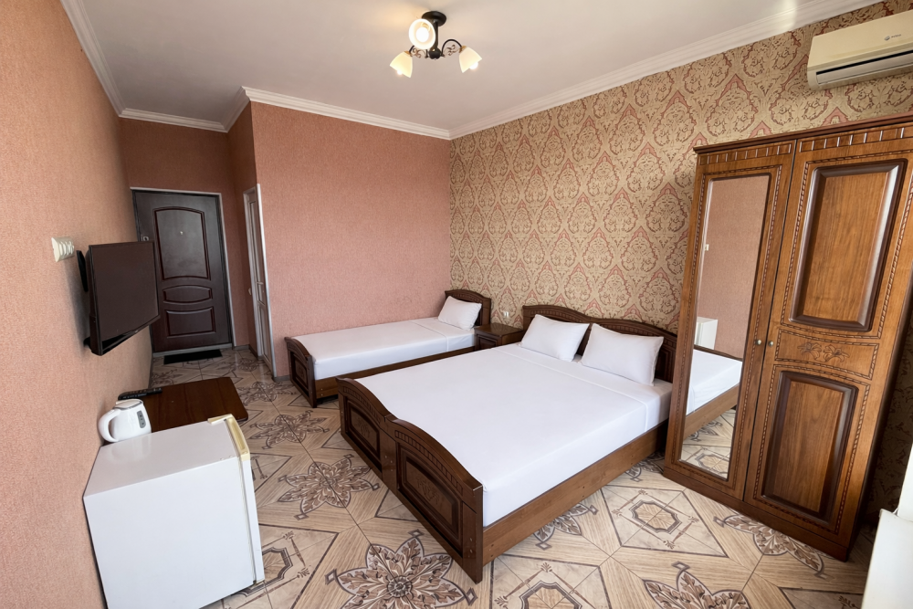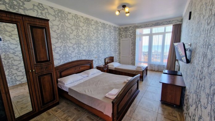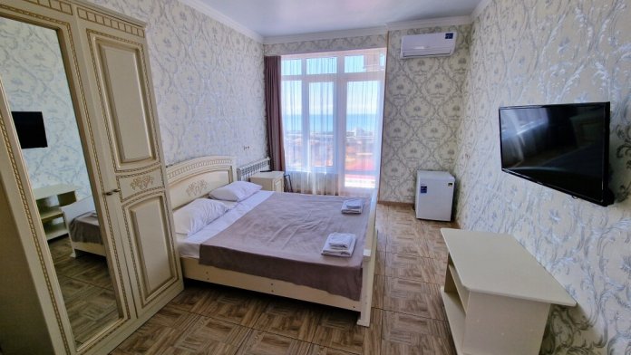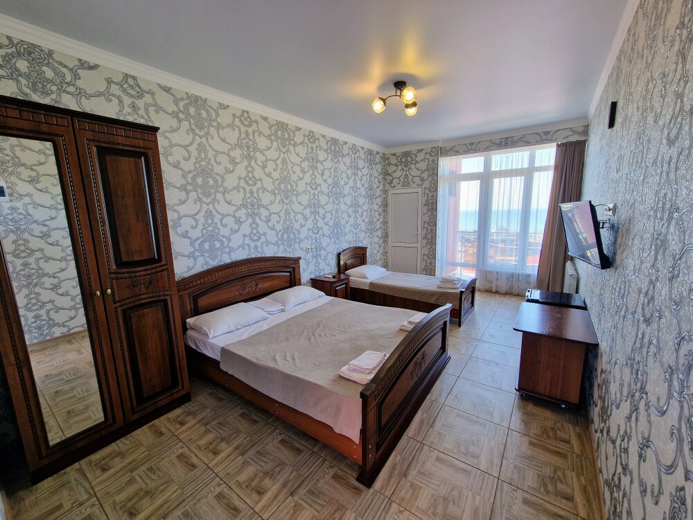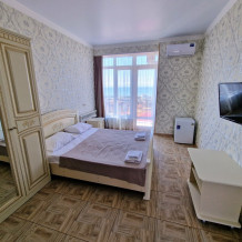 Просторные номера с хорошим ремонтом в новом корпусе (расположен в 150 метрах от основного). В номерах есть: душ и туалет, ЖК телевизор (диагональ 81 см.), кондиционер (сплит-система), холодильник, чайник, фен, шкаф для вещей, стиральные принадлежности, отопление. Индивидуальный вход в каждый номер, собственный (не проходной) балкон с местом для отдыха (стол, кресла) с панорамным видом на море.