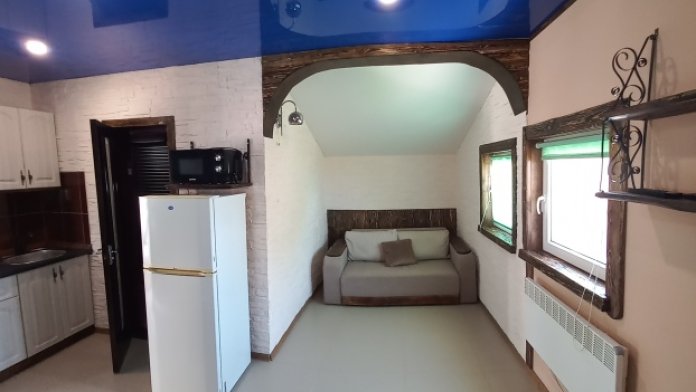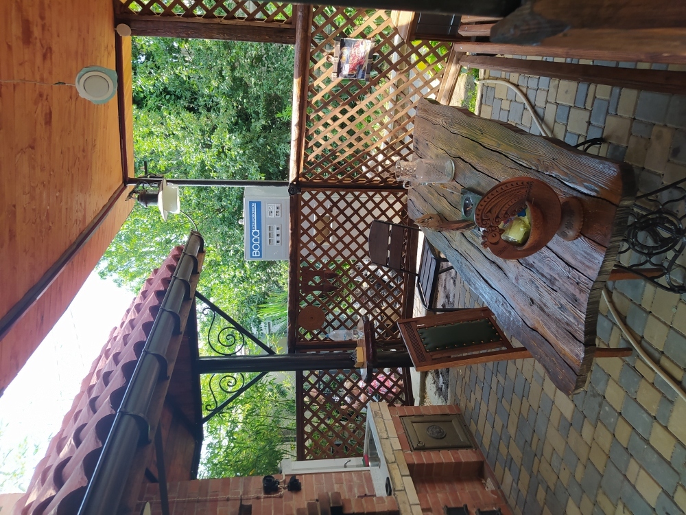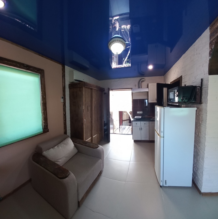 Одноэтажное строение, отличный ремонт, в вашем распоряжении комната с кухней студией, отдельный санузел. Есть все необходимое для отдыха: кондиционер, телевидение, посуда, белье, беседка с мангалом для отдыха, бассейн. Много зелени.