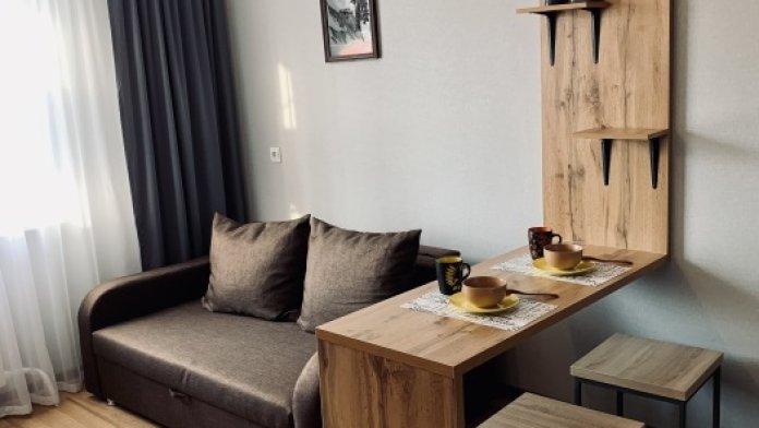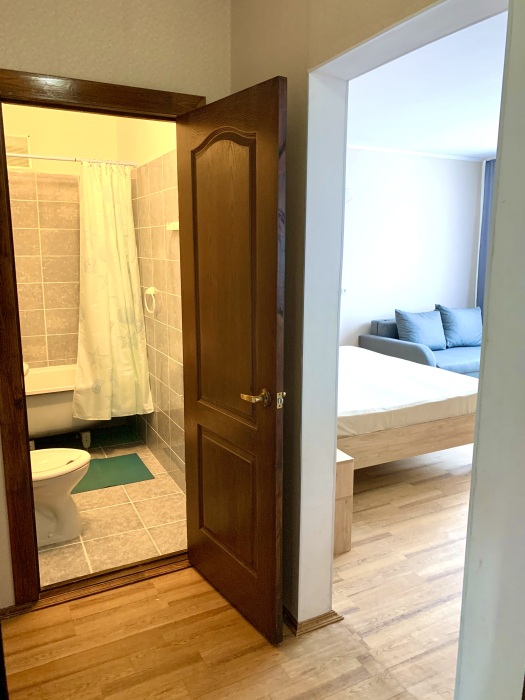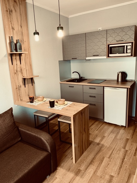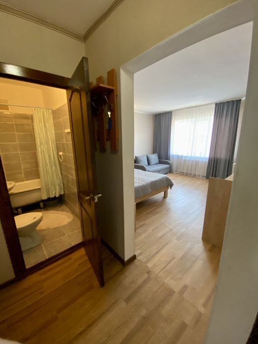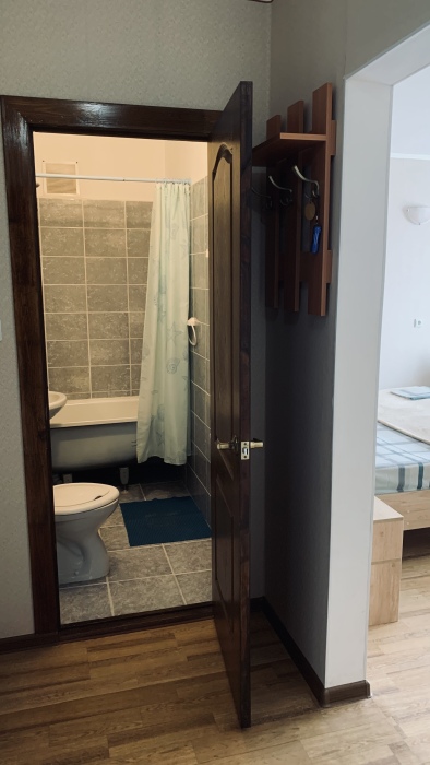 Двухкомнатный номер с собственной кухней и санузлом. Кухня полностью укомплектована посудой, моющими средствами. Имеется возможность поставить дополнительное ( 5) спальное место для ребенка